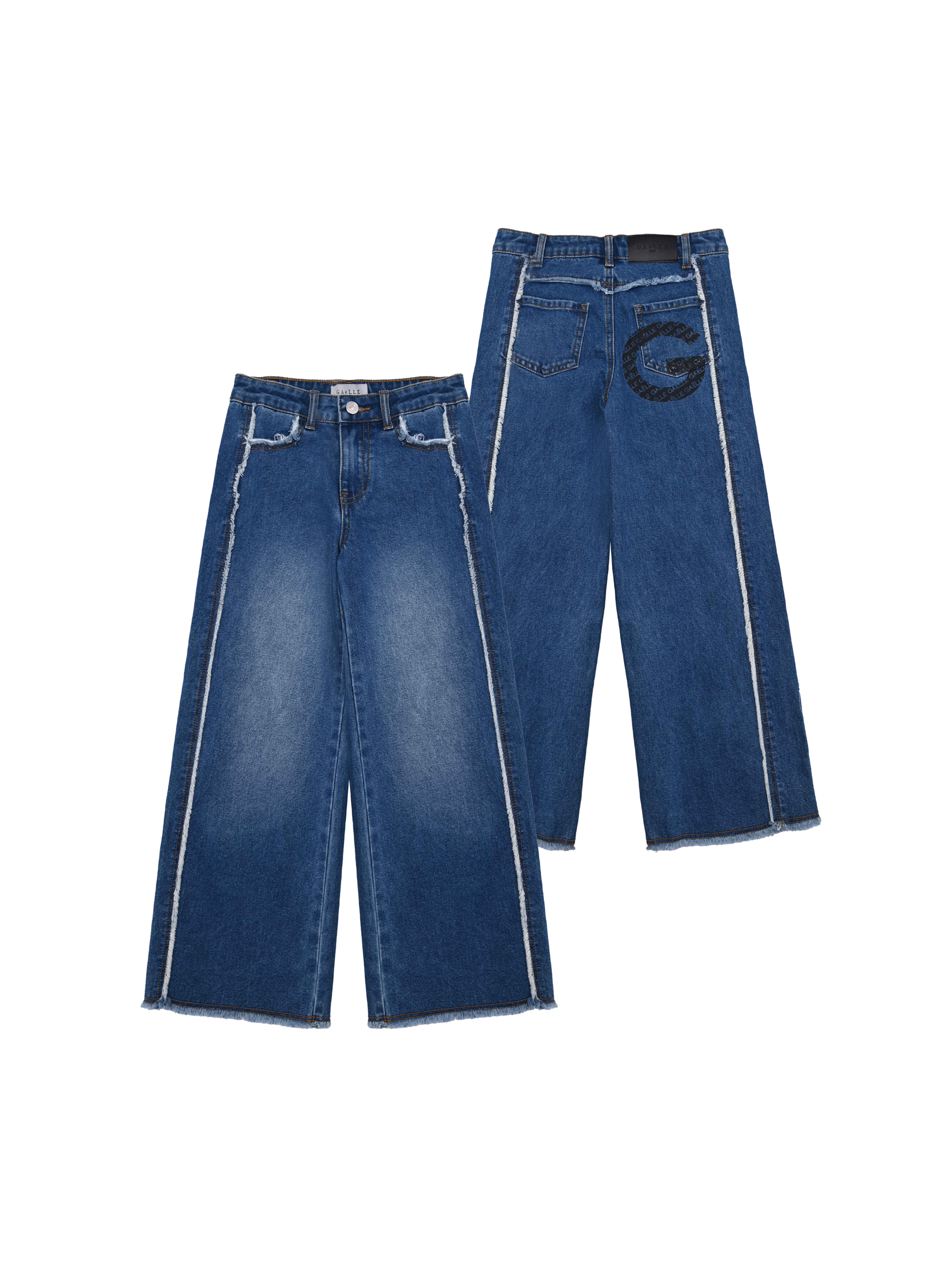 Jeans a palazzo, lavaggio blu denim, effetto used, con dettagli unfinished e maxi iniziale logo a contrasto sul retro. GAELLE PARIS