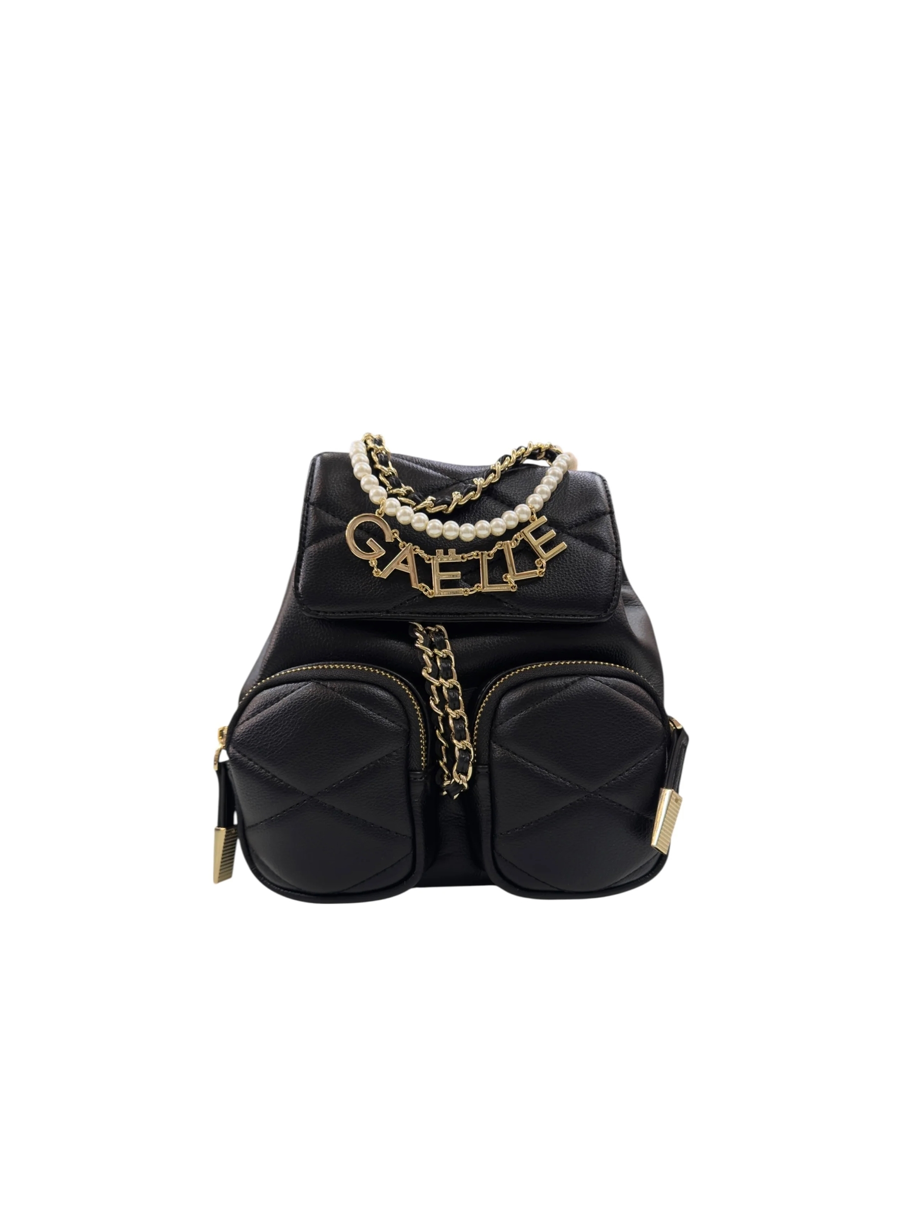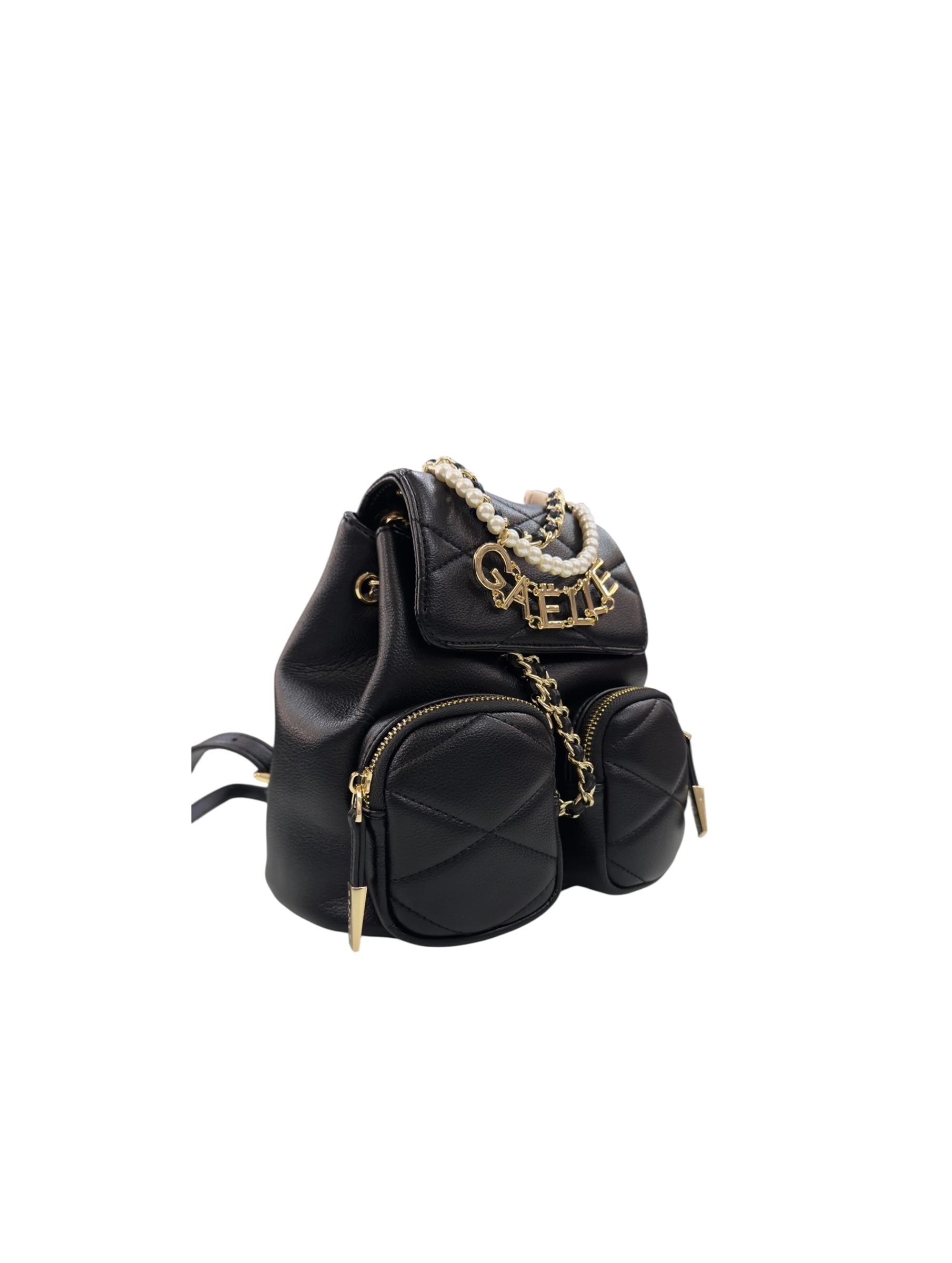 Zaino in tessuto ecopelle matelassè, con chiusura in capo con coulisse in catena e patta con bottone magnetico, due tasche applicate sul davanti regolate da zip, tasca interna con zip, spallacci regolabili in catena e PU e decorazioni con catena, perle e charm con logo in galvanica oro sul davanti. Per un look trendy e fashion. GAELLE PARIS