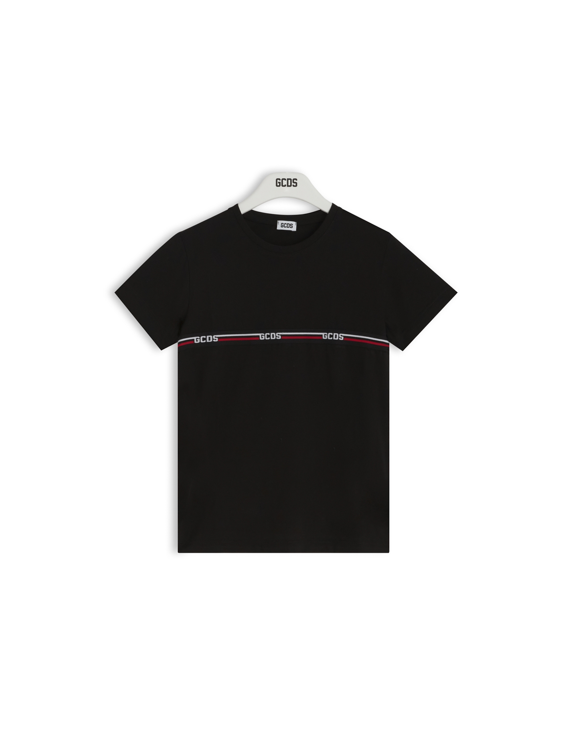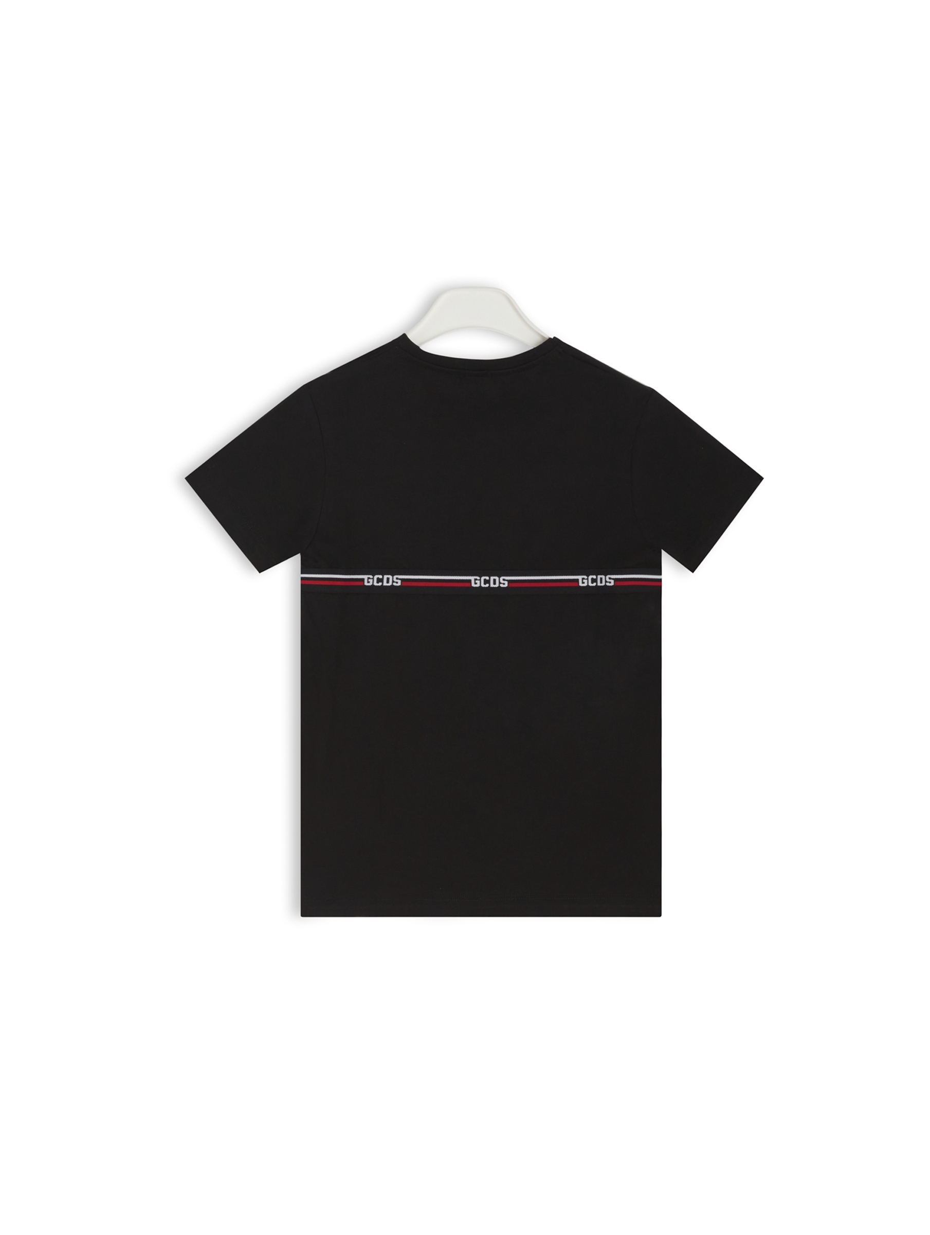 T-shirt a maniche corte, con scollo rotondo, a tinta unita e con mini banda logata con righe a contrasto sul davanti e sul retro. Per un look basic e casual. GCDS
