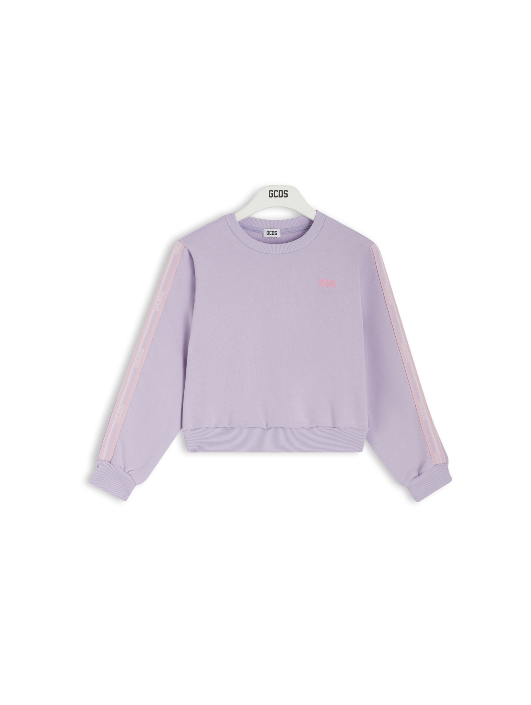 Felpa cropped a maniche lunghe, a tinta unita, con bordo e polsini a costine, piccolo logo stampato a contrasto sul petto e bande logate a contrasto lungo le maniche. Per un look trendy e fashion. GCDS