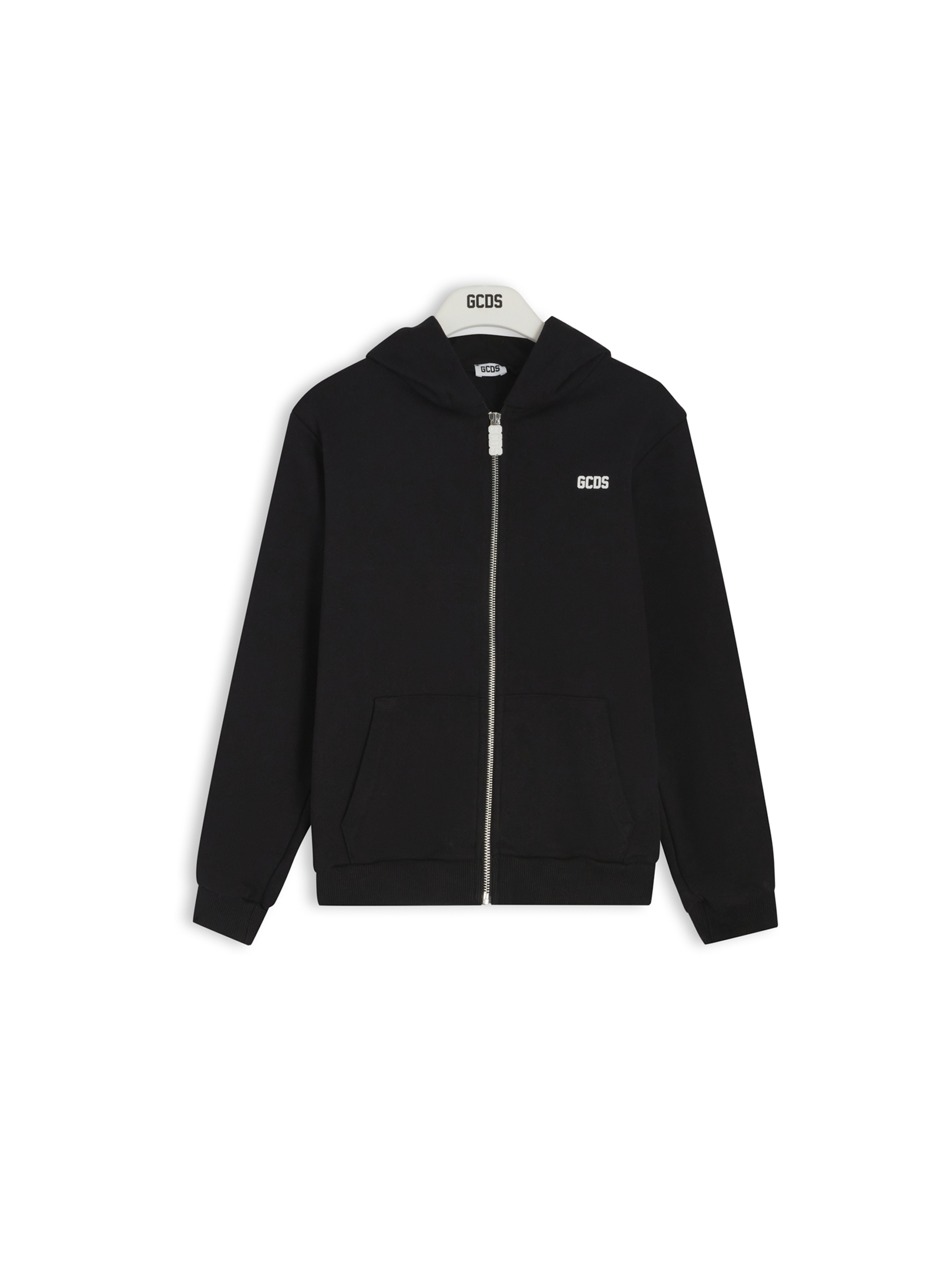 Felpa con cappuccio a maniche lunghe, a tinta unita, con bordo e polsini a costine, apertura centrale con zip, tasche a toppa sul davanti, piccolo logo lettering a contrasto sul petto e mini bande logate con righe a contrasto lungo le maniche e sul cappuccio. Per un look trendy e fashion. GCDS
