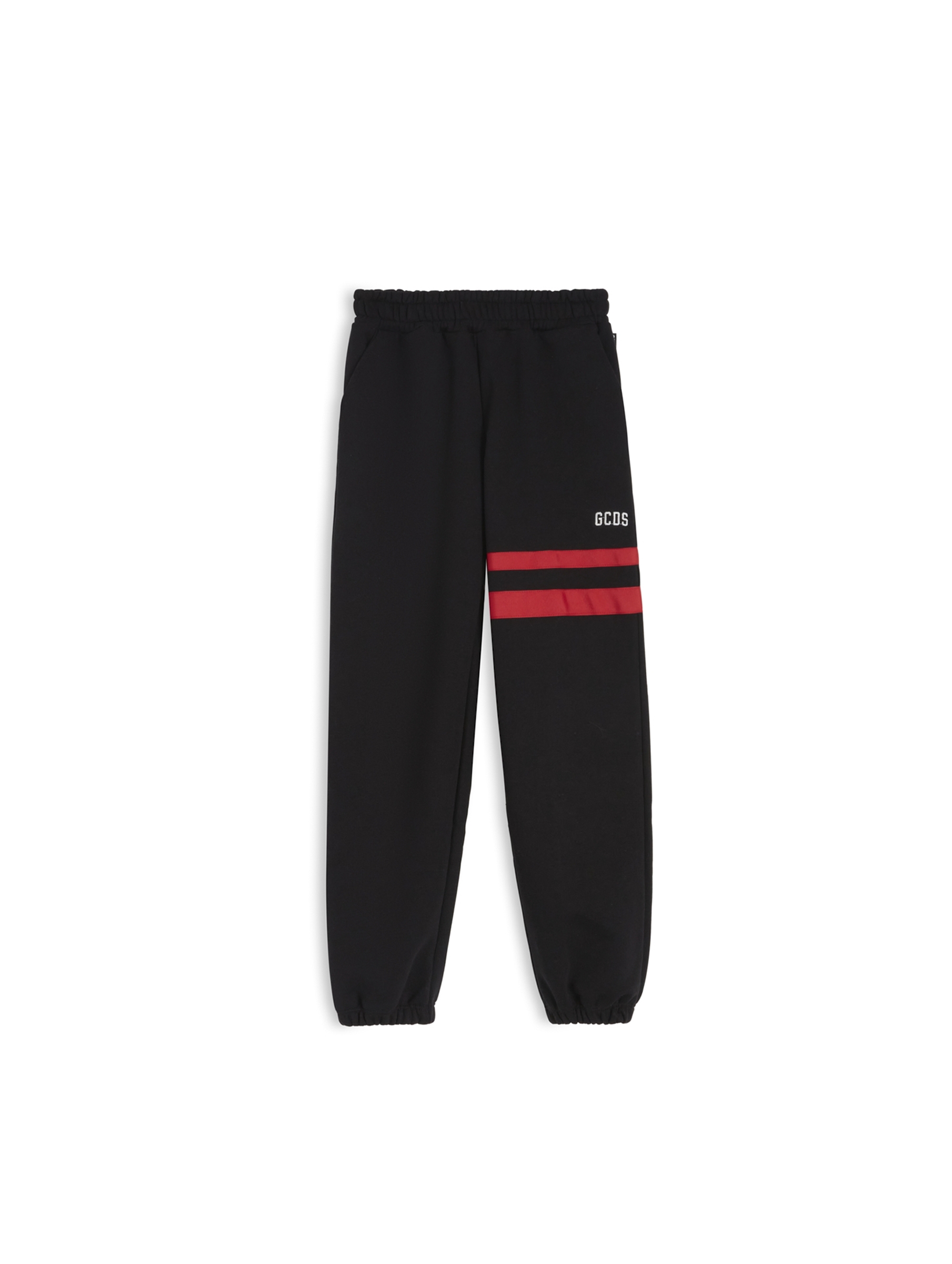 Pantaloni lunghi modello jogger, a tinta unita, con vita e polsini elastici, tasche ai lati alla francese, mini logo lettering ricamato a contrasto sul lato, mini ricamo sul retro e due righe colorate a contrasto sulla gamba. Per un look sportivo e trendy. GCDS