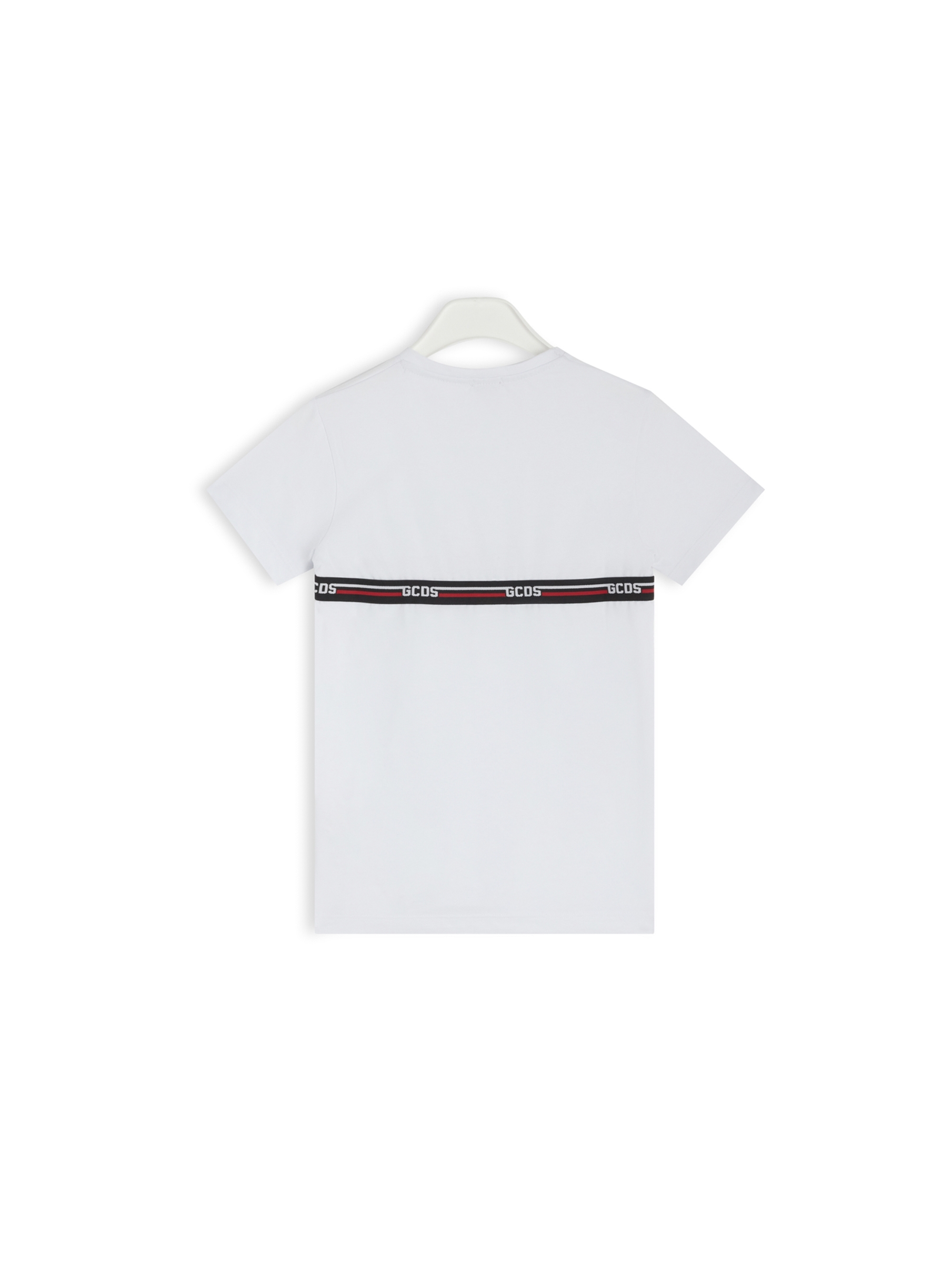 T-shirt a maniche corte, con scollo rotondo, a tinta unita e con mini banda logata con righe a contrasto sul davanti e sul retro. Per un look basic e casual. GCDS
