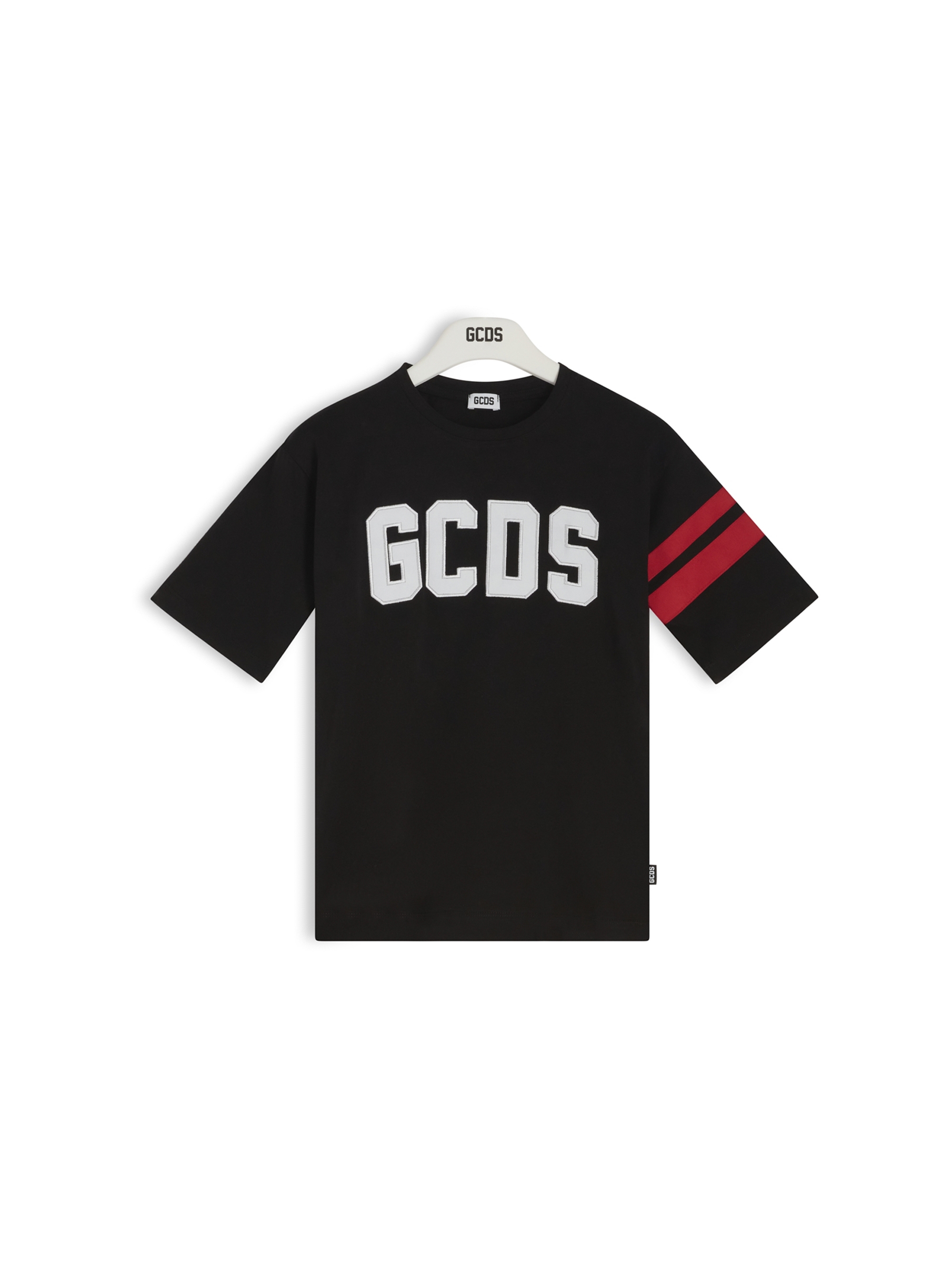 T-shirt a maniche corte, con scollo rotondo, a tinta unita, con maxi logo a contrasto con profili ricamati sul davanti, piccolo ricamo a contrasto sul retro e doppia riga colorata a contrasto sulla manica. Per un look casual e trendy. GCDS