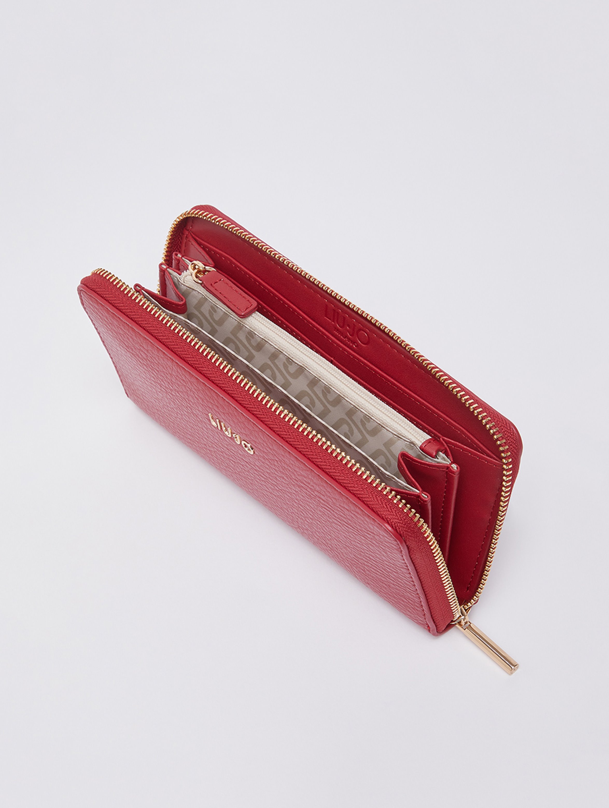 Portafoglio grande con zip around, con stampa effetto bottalato, con scomparti per banconote e tessere, scomparto per monete con zip e logo lettering in metallo sul davanti. Un accessorio raffinato e funzionale. LIU.JO