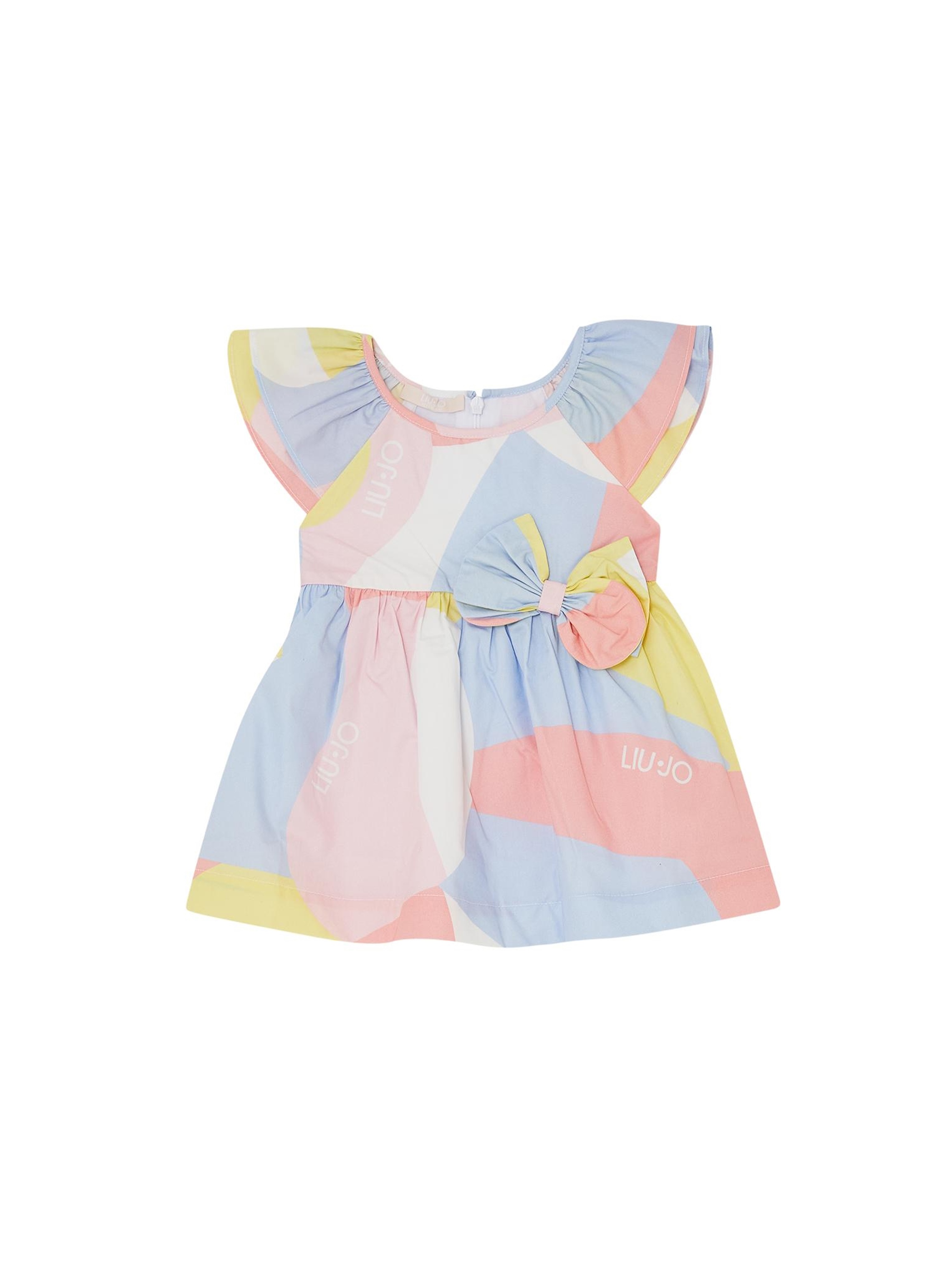 Abito realizzato in confortevole popeline, con maniche corte con volant, scollo rotondo, a tinta multicolor, con chiusura sul retro con zip invisibile, punto vita arricciato con gonna svasata e dettaglio di fiocco in tono colore posto in vita sul lato. Per un look fashion e chic. LIU.JO