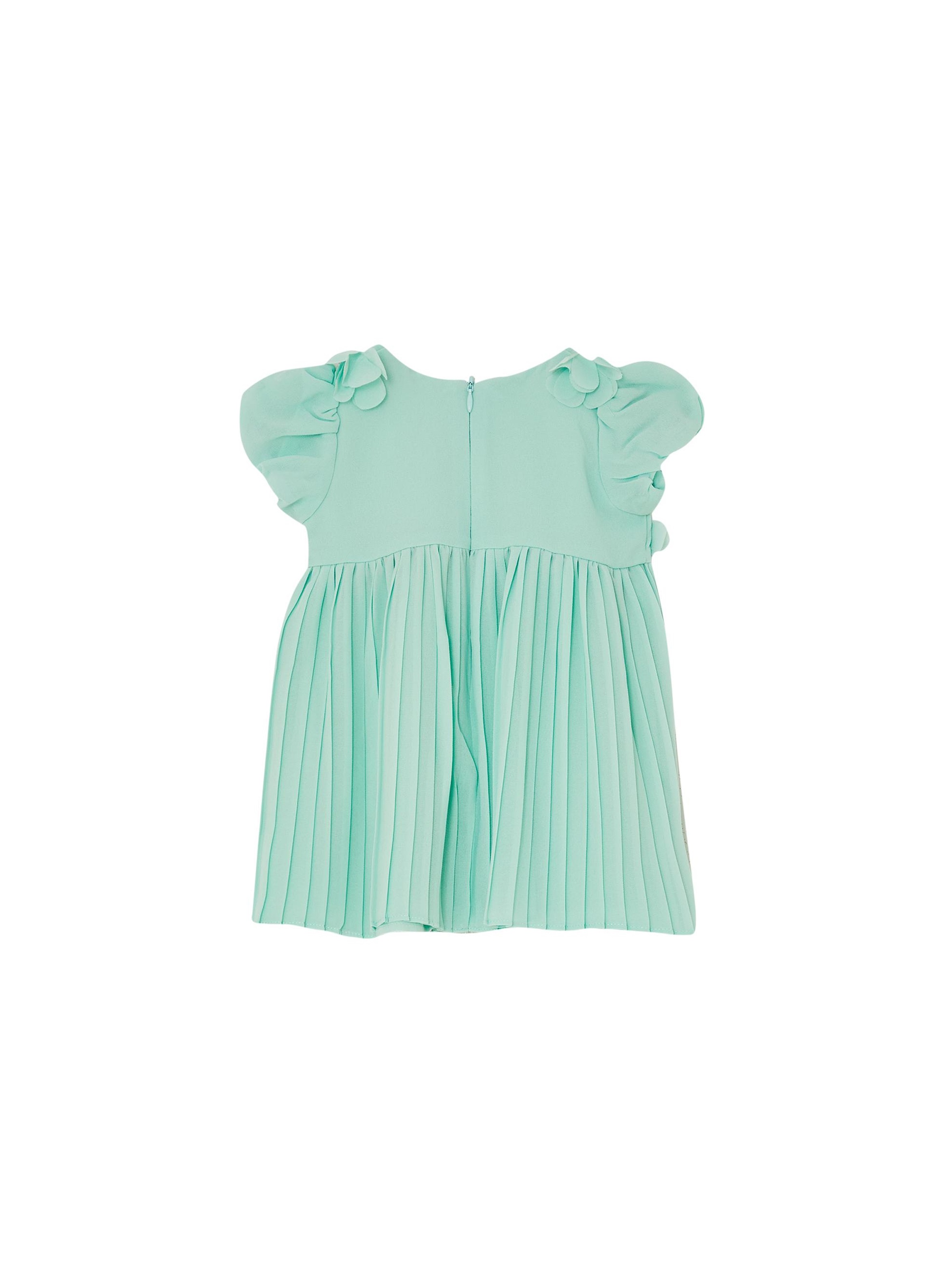 Abito elegante con maniche corte a palloncino, con scollo rotondo, a tinta unita, con chiusura con zip invisibile sul retro, gonna plissettata, placchetta con logo LJ sul fondo e particolare dettaglio di petali tridimensionali applicati su tutto il corpetto. Per un look elegante e chic. LIU.JO