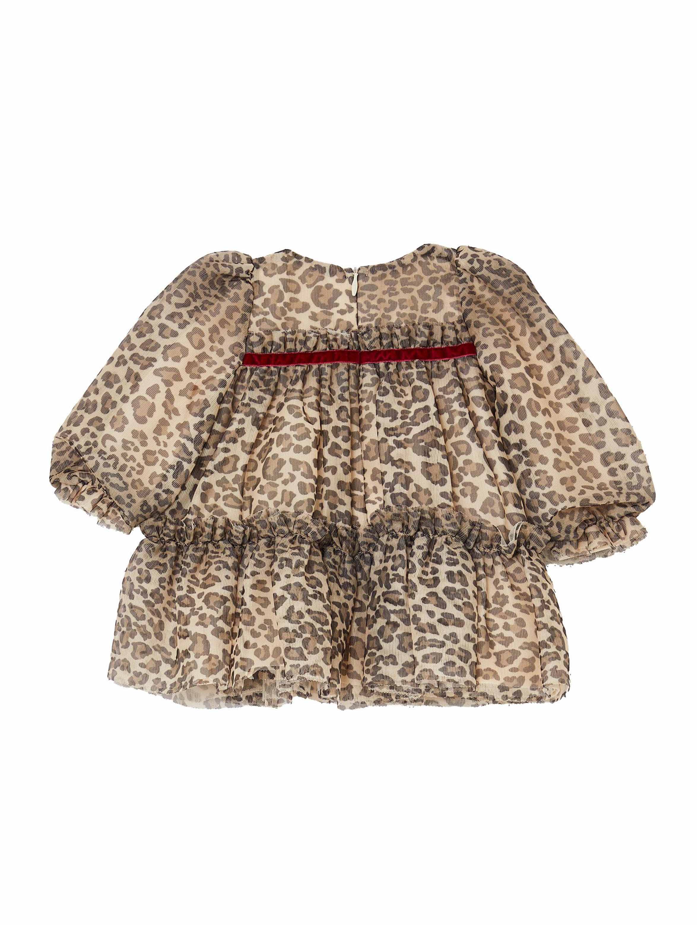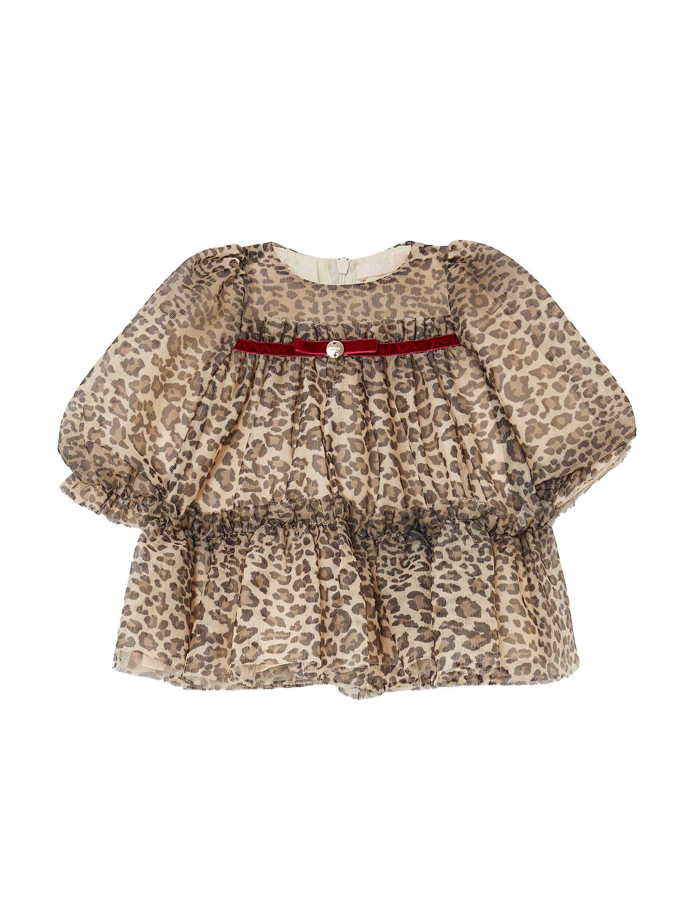 Grazioso abito in tulle, con stampa animalier all over, scollo a barca, maniche a palloncino, nastro in velluto a contrasto con fiocchetto, balza al fondo, fodera interna, chiusura con zip invisibile sul retro e logo in metallo. Per un look fashion e chic. LIU.JO