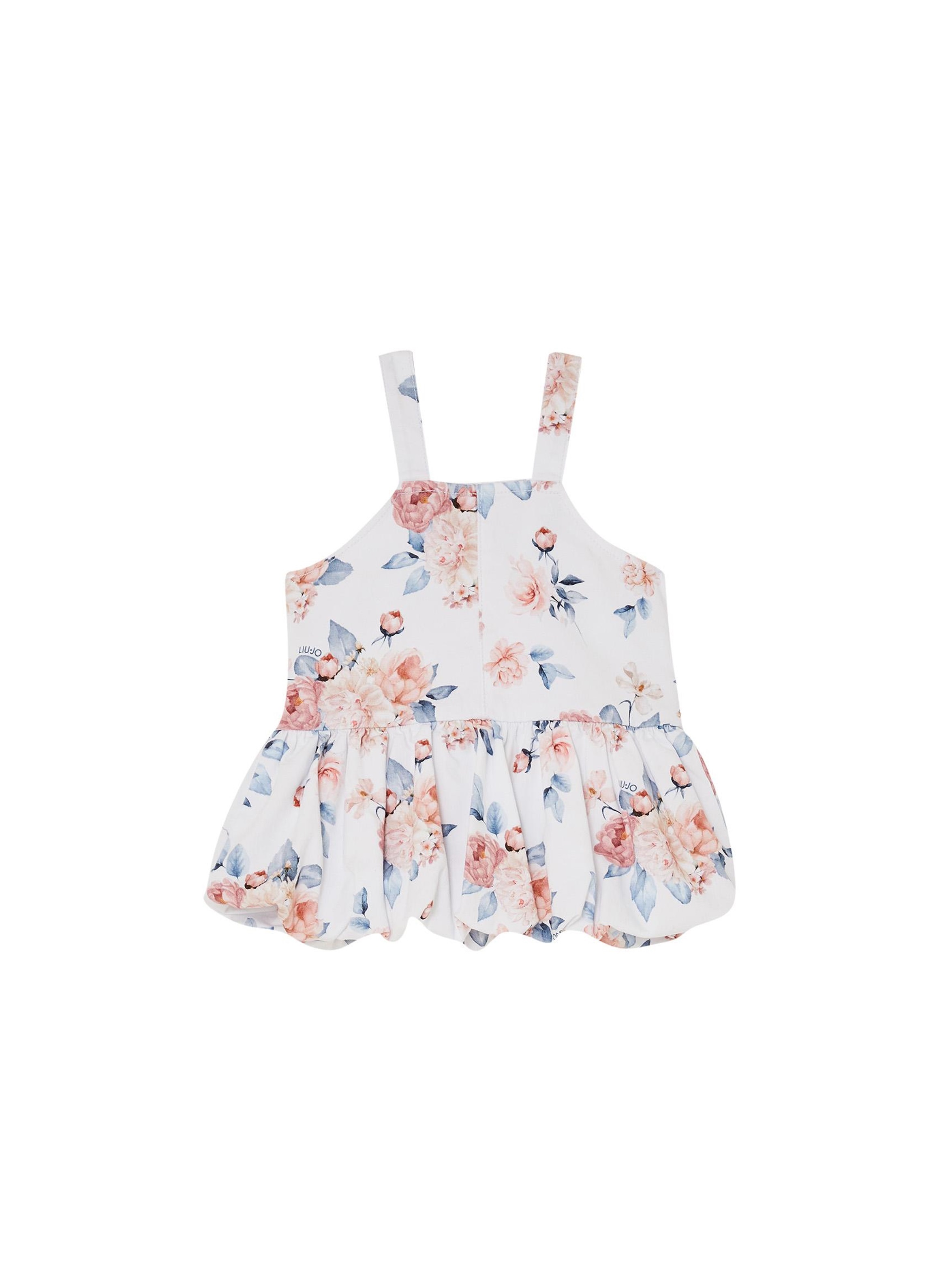 Abito salopette con una delicata stampa floreale all over, con spalline regolabili con bottone e gonna arricciata dal grazioso design a palloncino. Per un look fashion e chic. LIU.JO