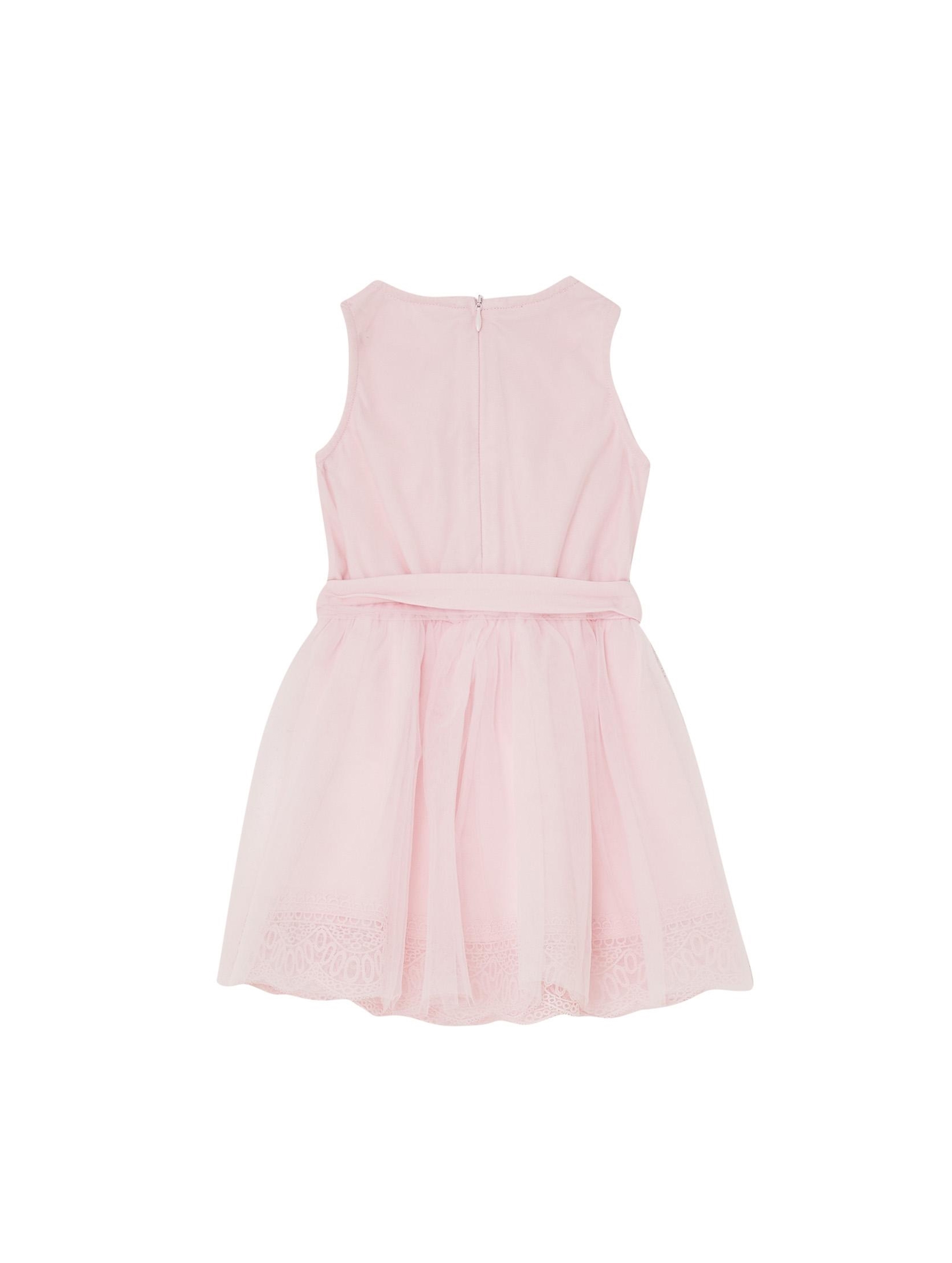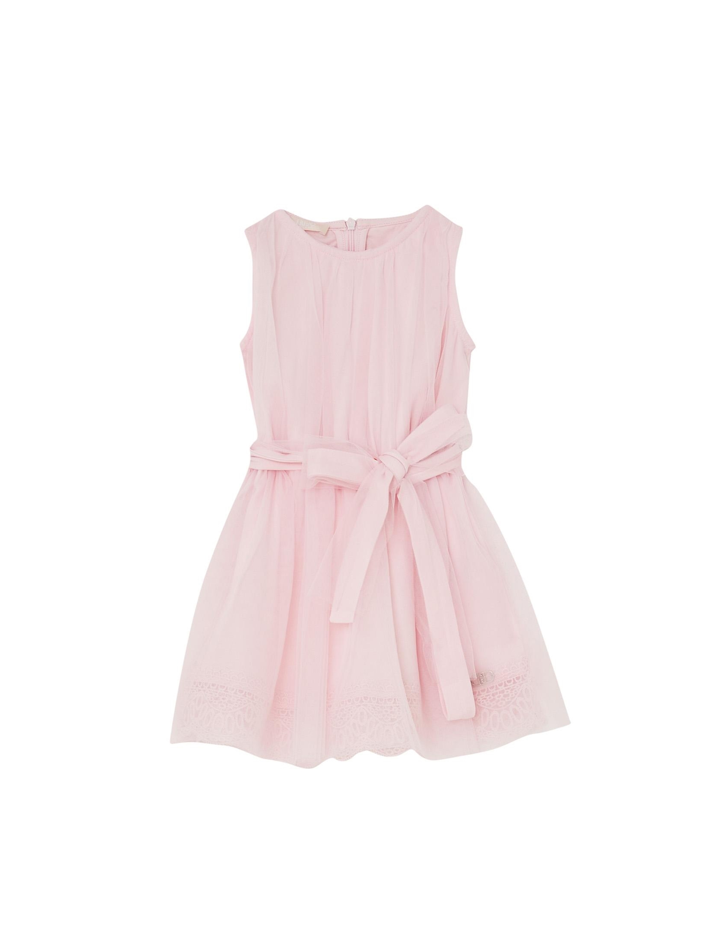 Abito smanicato in tulle, con fodera in jersey, a tinta unita, con scollo rotondo, chiusura con zip invisibile sul retro, cintura in tulle, vita elasticizzata, gonna svasata, placchetta con logo LJ sul fondo e particolare dettaglio di fascia in pizzo sangallo applicata sul fondo. Per un look elegante e chic. LIU.JO