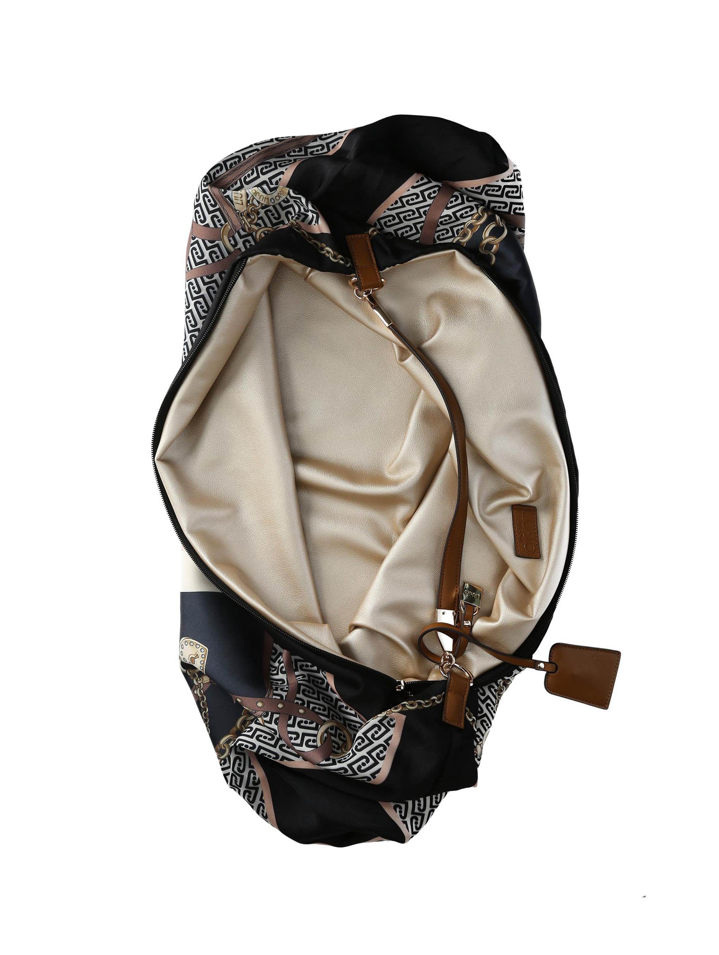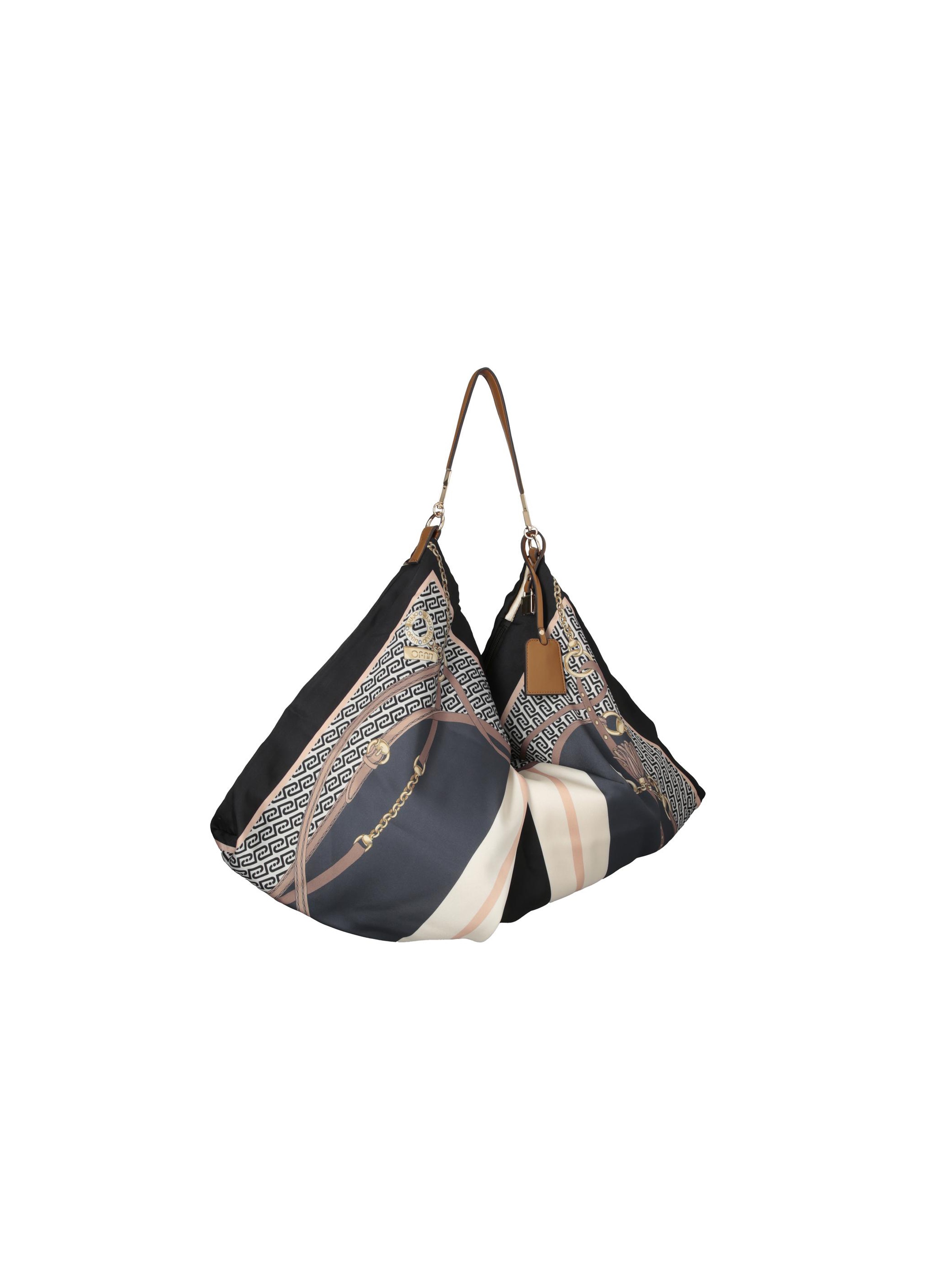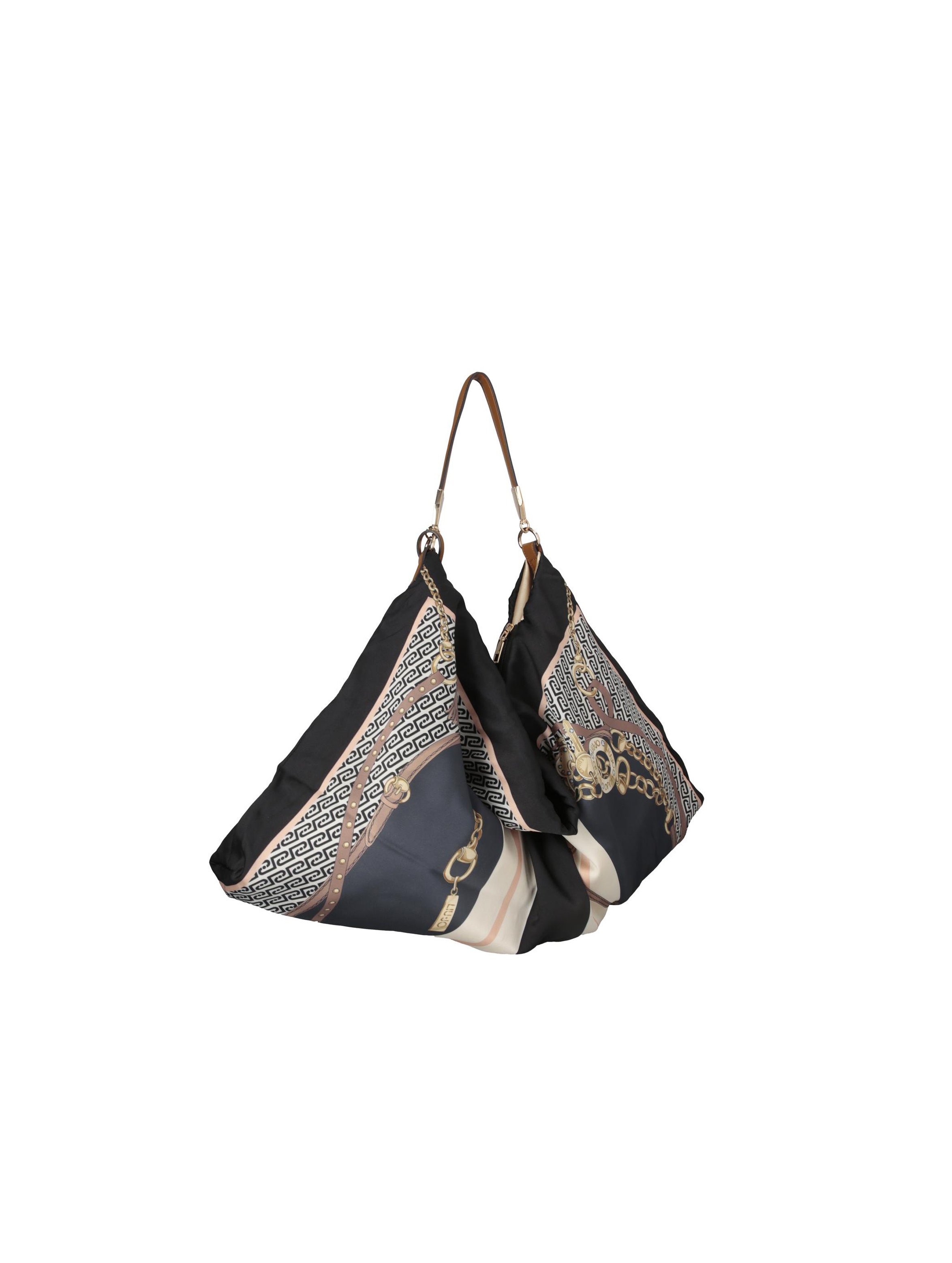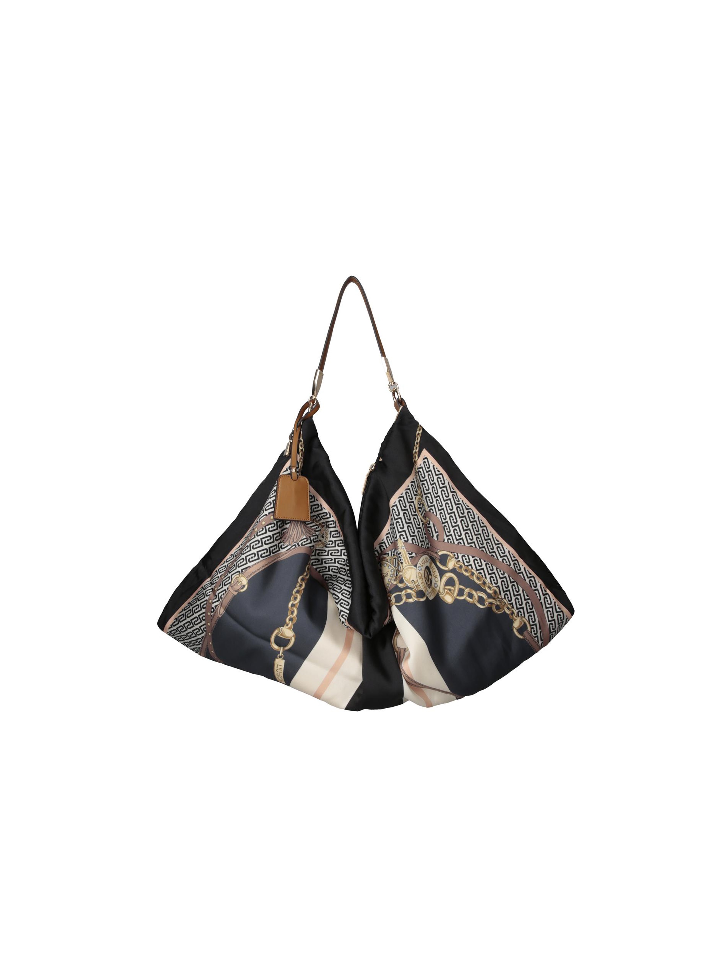 Borsa a spalla rivestita in raso stampato con logo, dal particolare design a foulard, con ampio spazio interno foderato, chiusura con zip, dettagli in metallo, impreziosita dal particolare charm clochette con lucchetto regolabile. Per look unici e moderni. LIU.JO