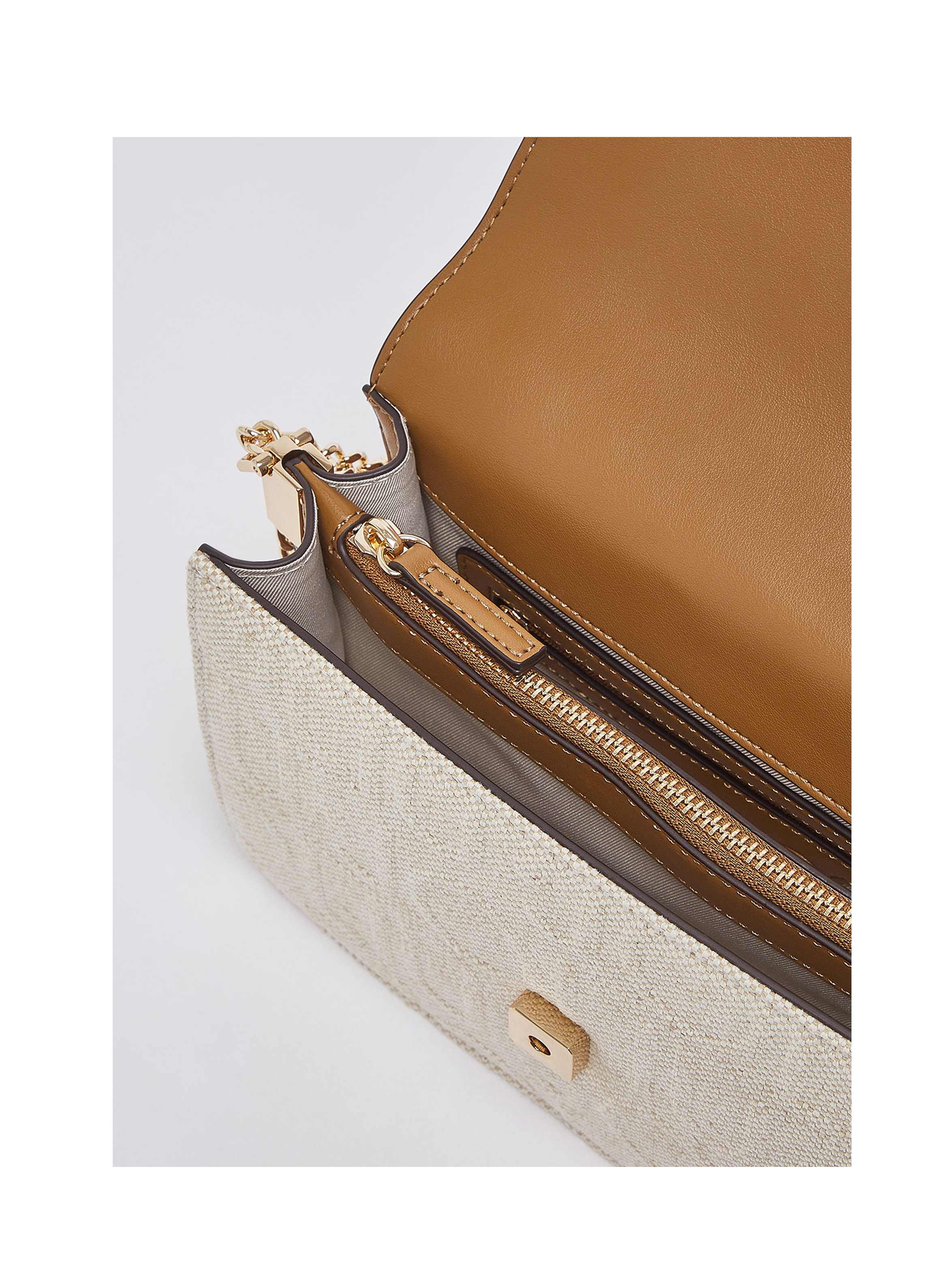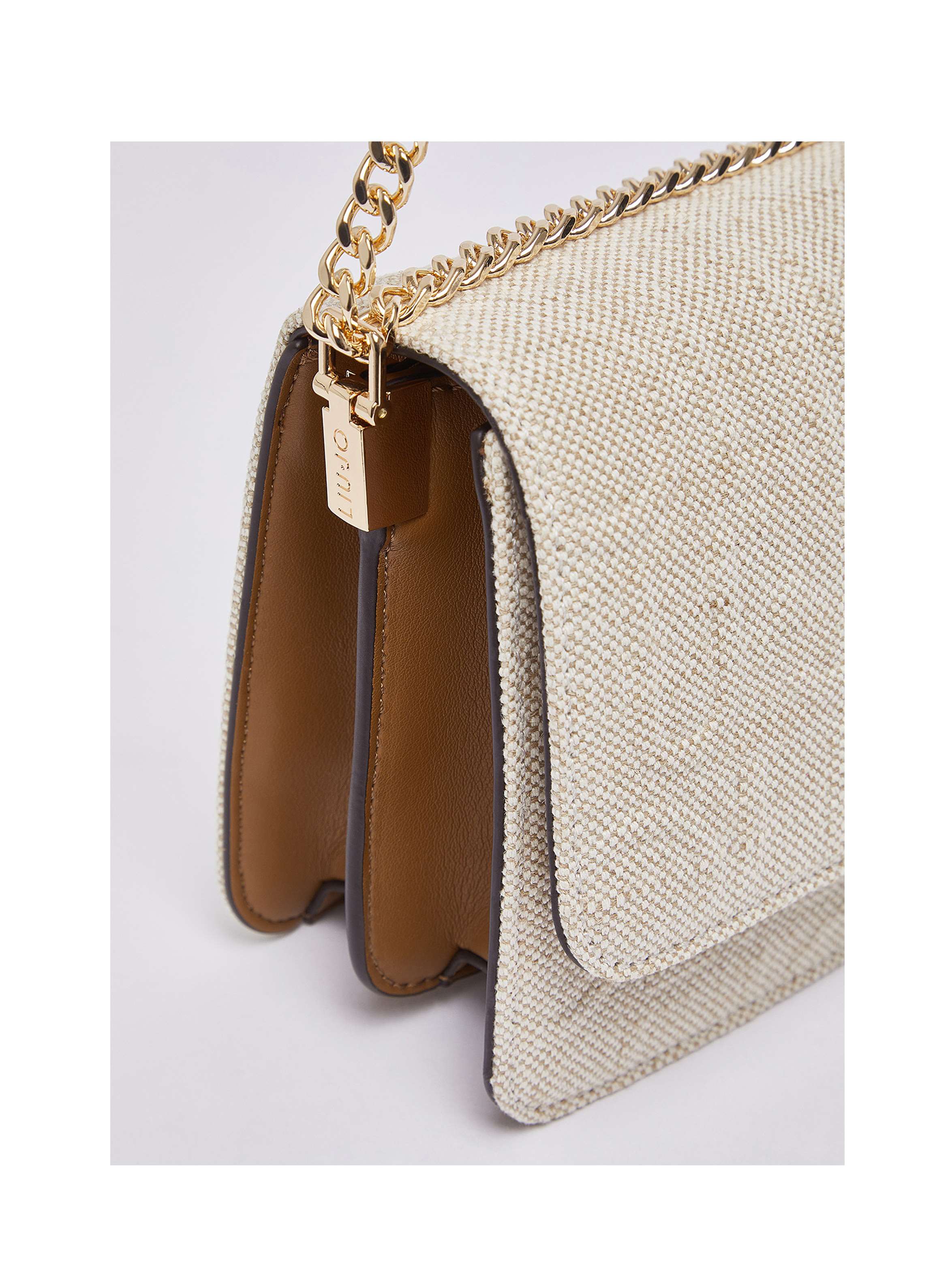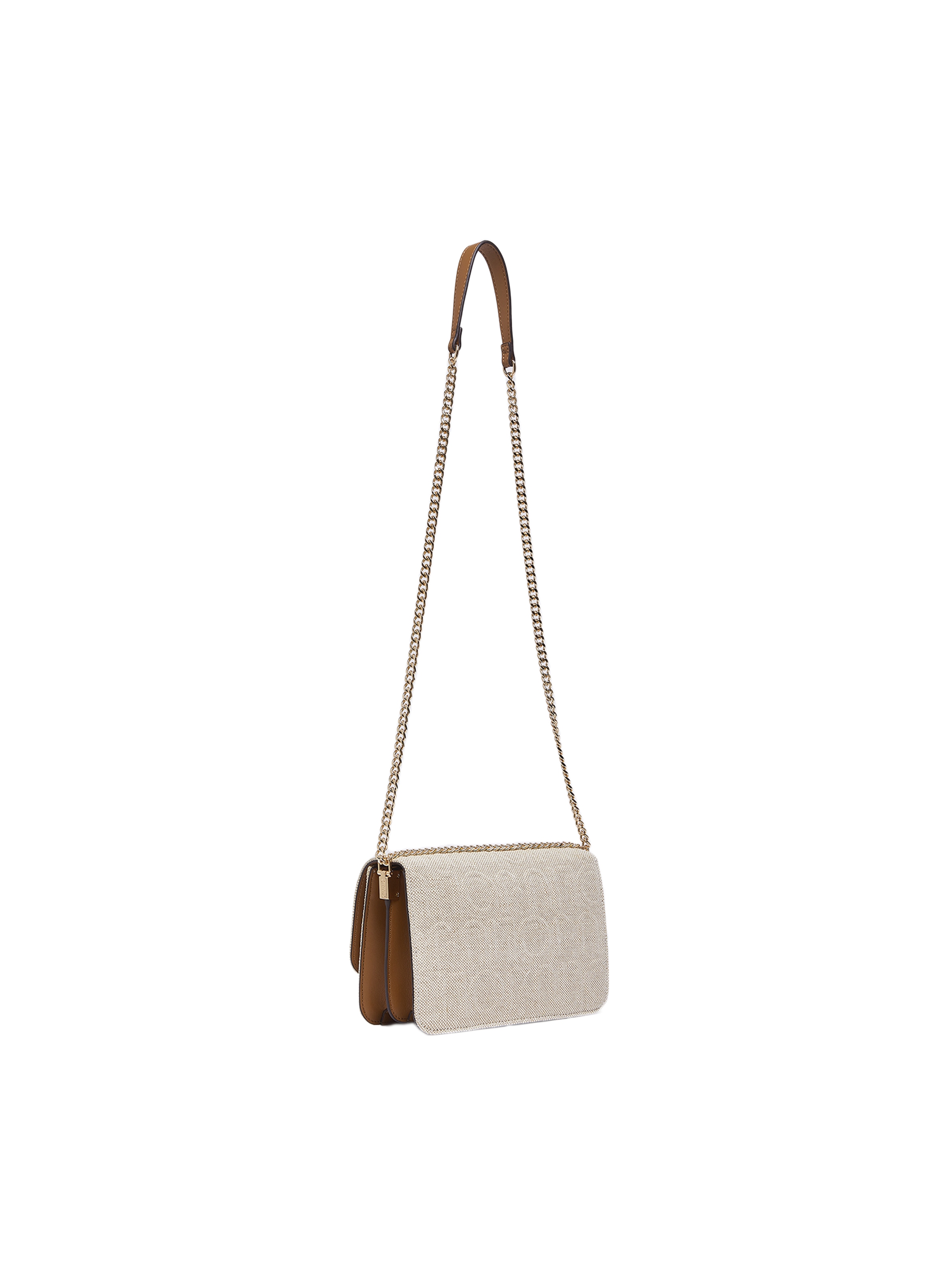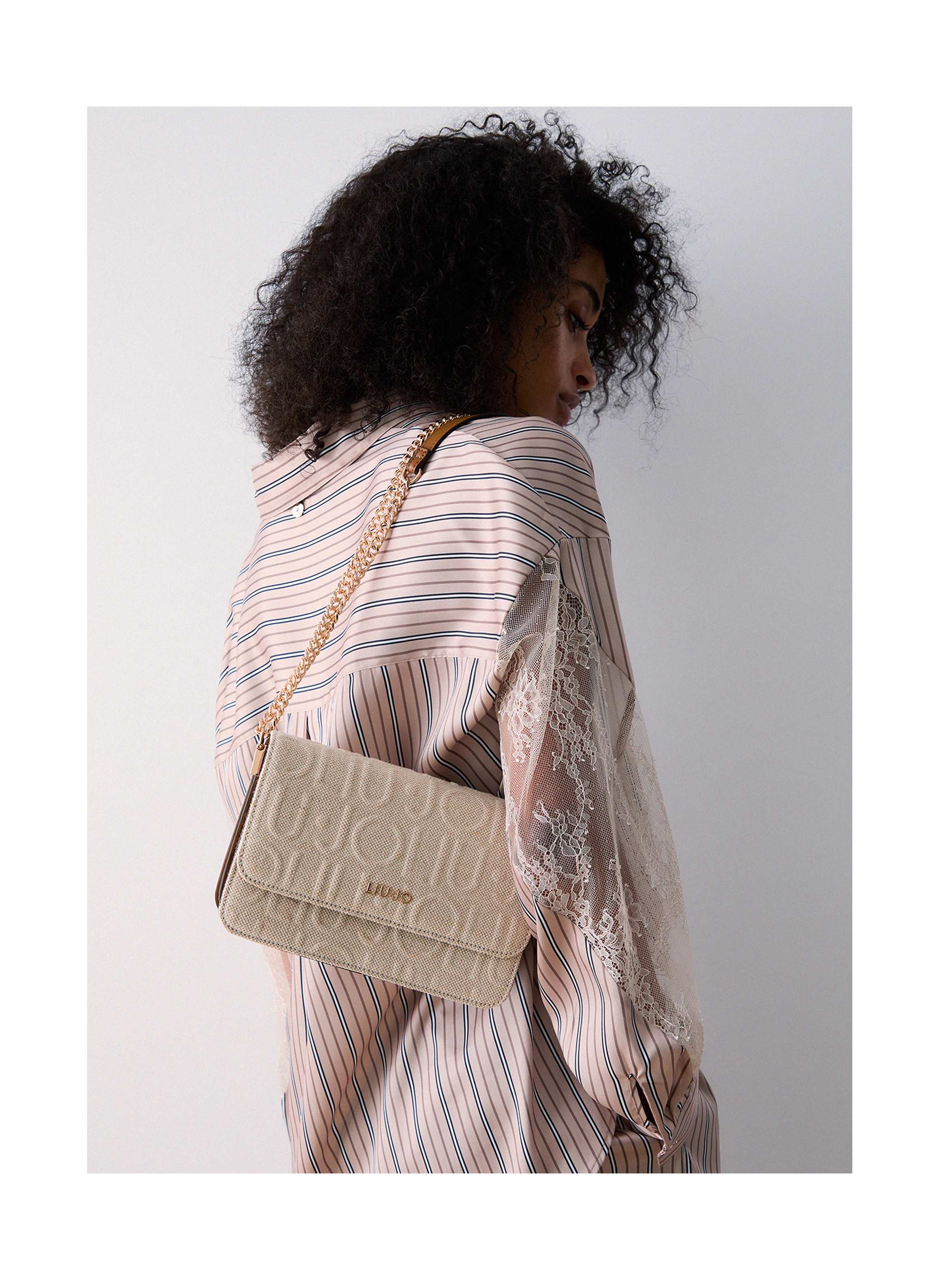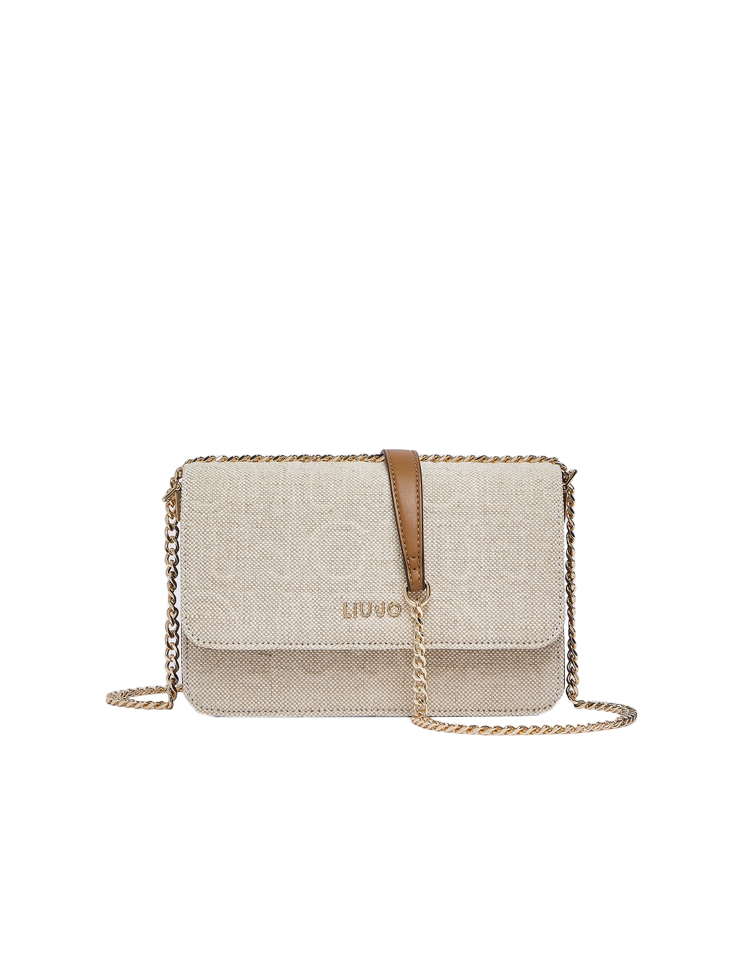 Borsa a tracolla realizzata in juta, con filati in misto cotone e lino, con tre scomparti interni di cui uno chiuso con zip, scomparti interni per tessere e carte, chiusura con patta e bottone magnetico impreziosita dal logo lettering, tracolla in catena con spallaccio in PU e particolare stampa del logo a rilievo in tinta all over. Per un look originale e chic. LIU.JO