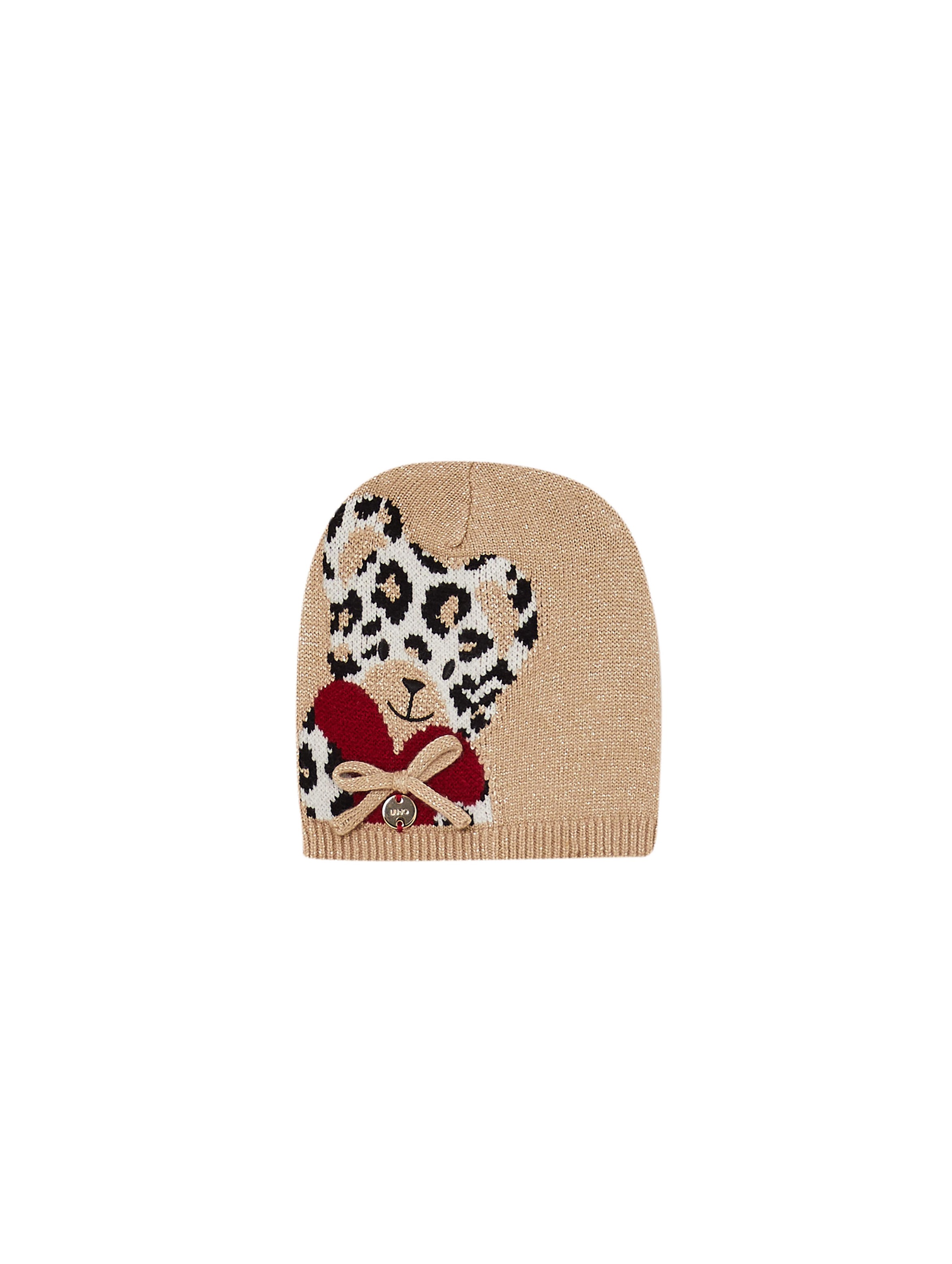 Berretto beanie in maglia, a tinta unita, con maxi grafica jacquard, fiocchetto in tessuto e logo metallico. Per un look stiloso e di tendenza. LIU.JO