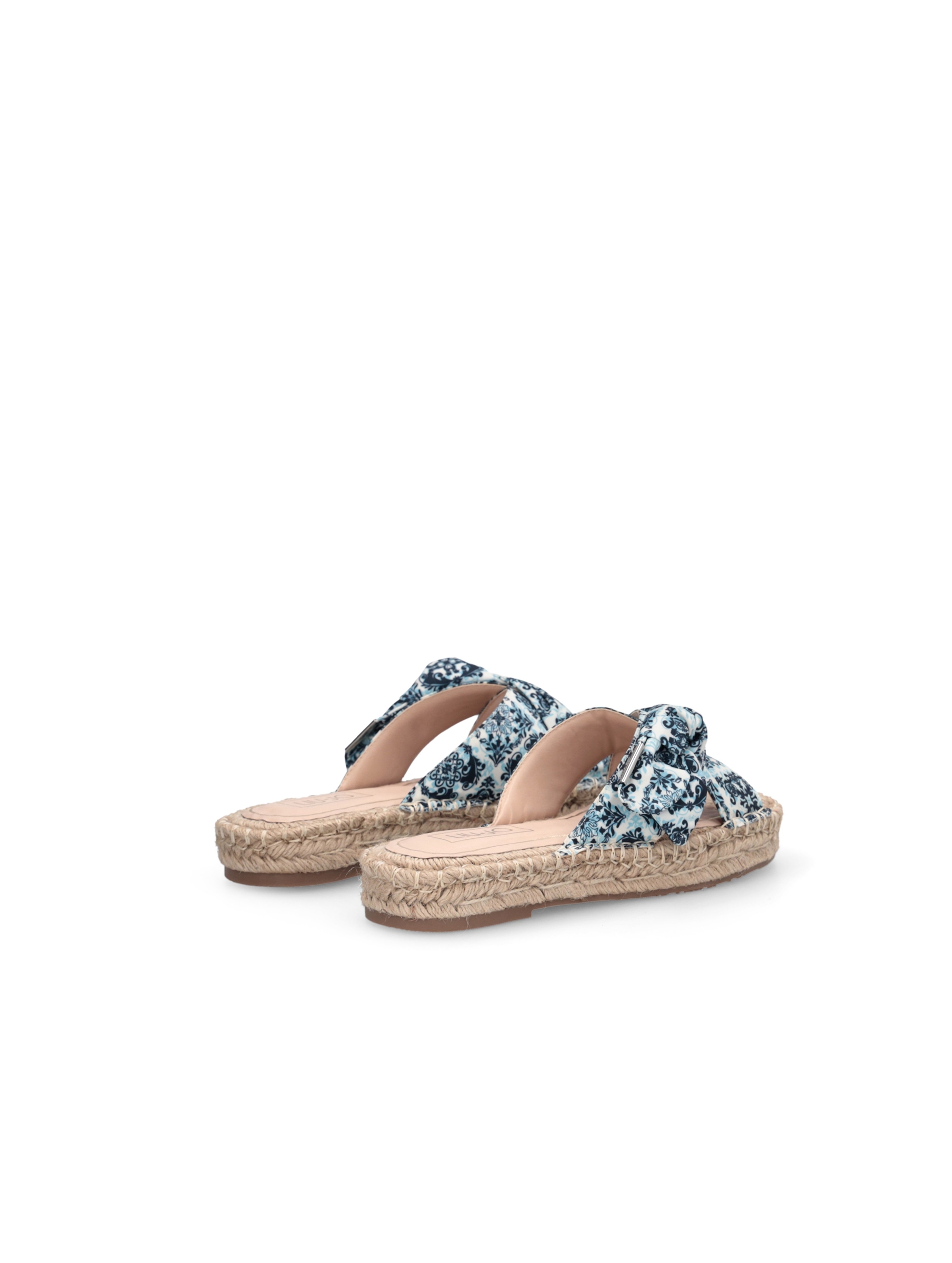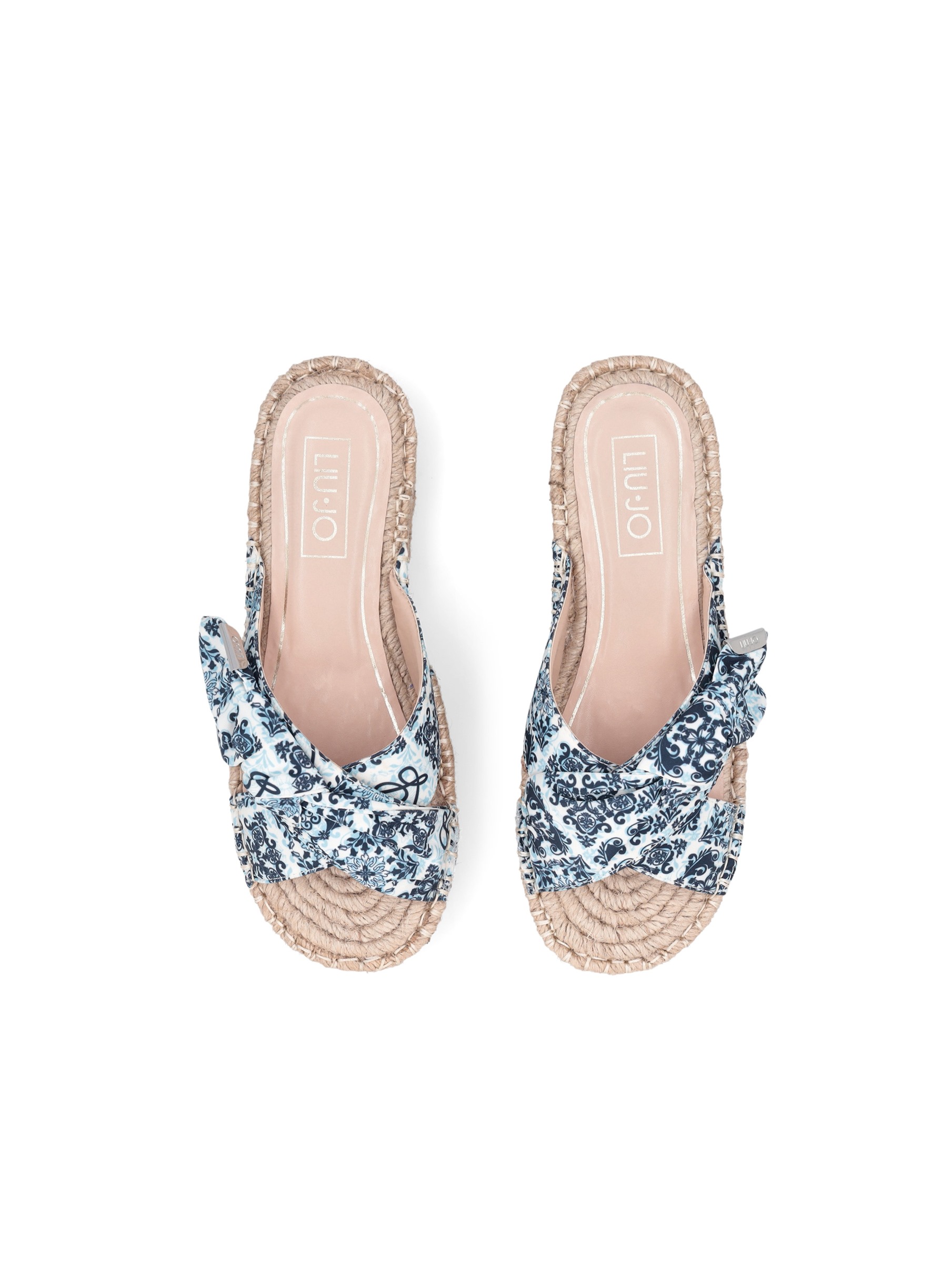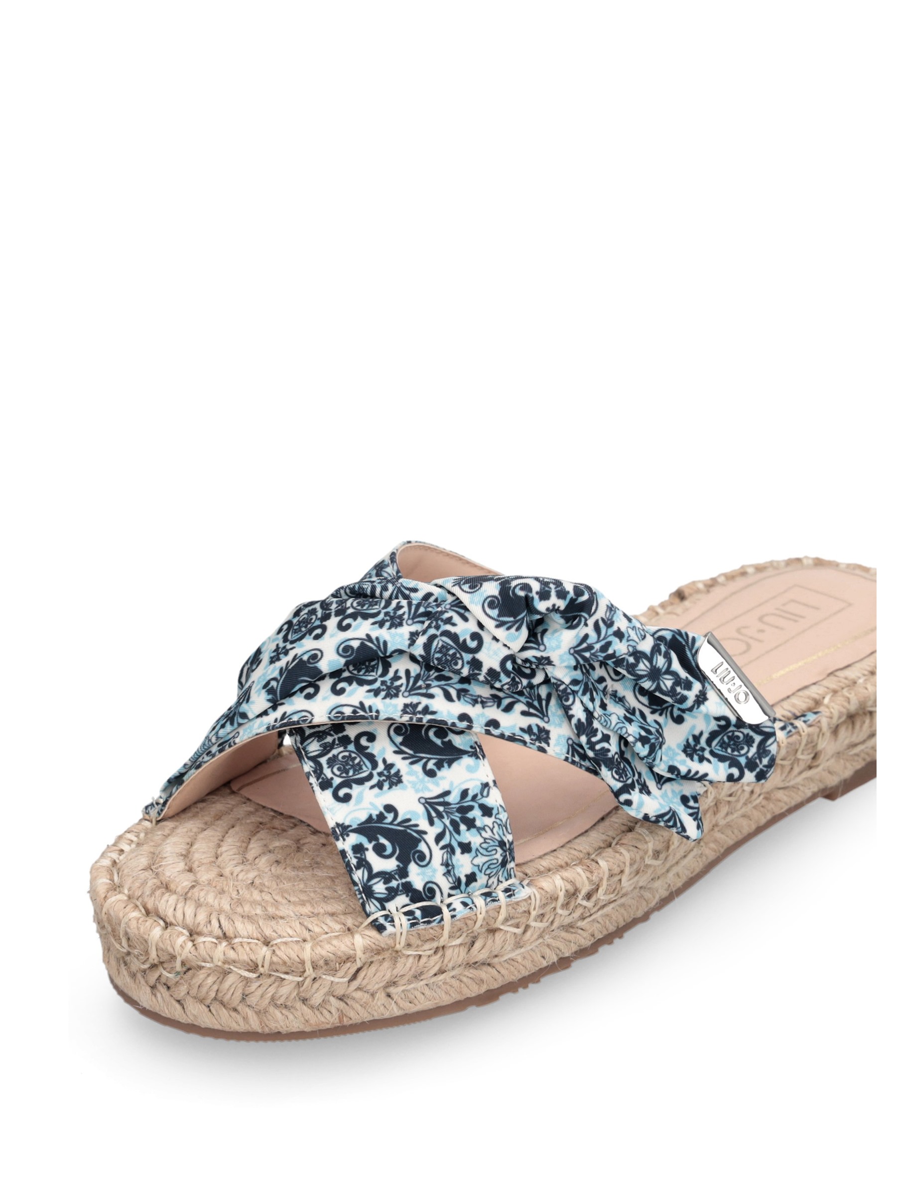 Sandali ciabatta modello espadrillas, con fascette incrociate in tessuto con stampa maioliche, dettaglio con motivo a fiocco, targhetta metallica con logo e suola in corda. Per un look trendy e fashion. LIU.JO