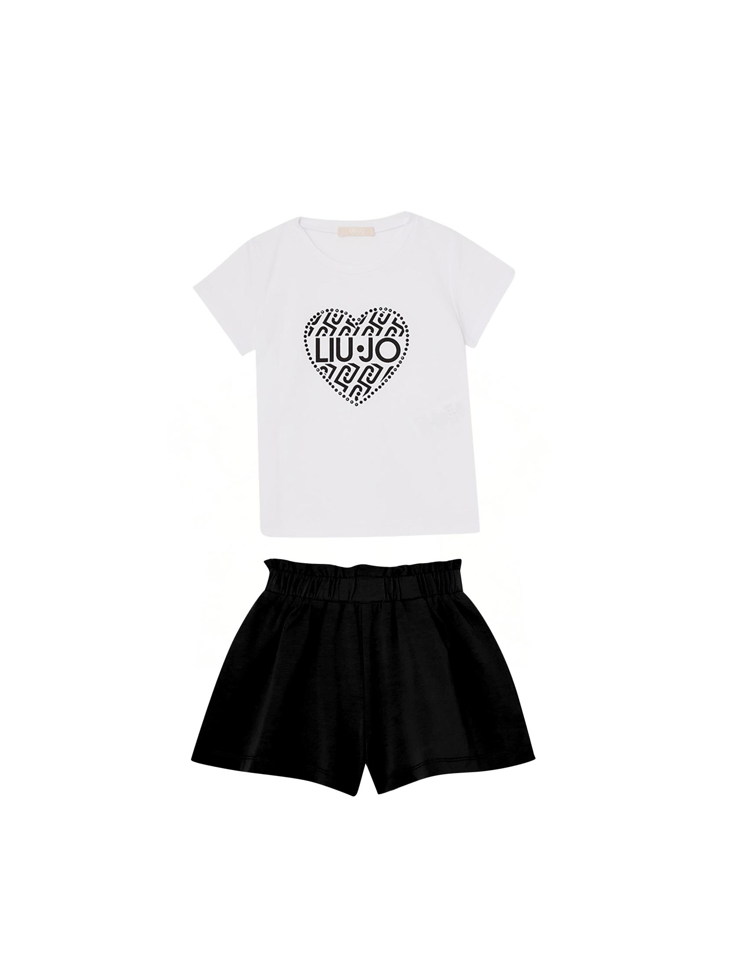 Completo t-shirt e shorts, con t-shirt in jersey di cotone a maniche corte, con stampa grafica a cuore con logo ricoperti di strass, short con vita elasticizzata e cintone elastico. Per un look casual chic. LIU.JO