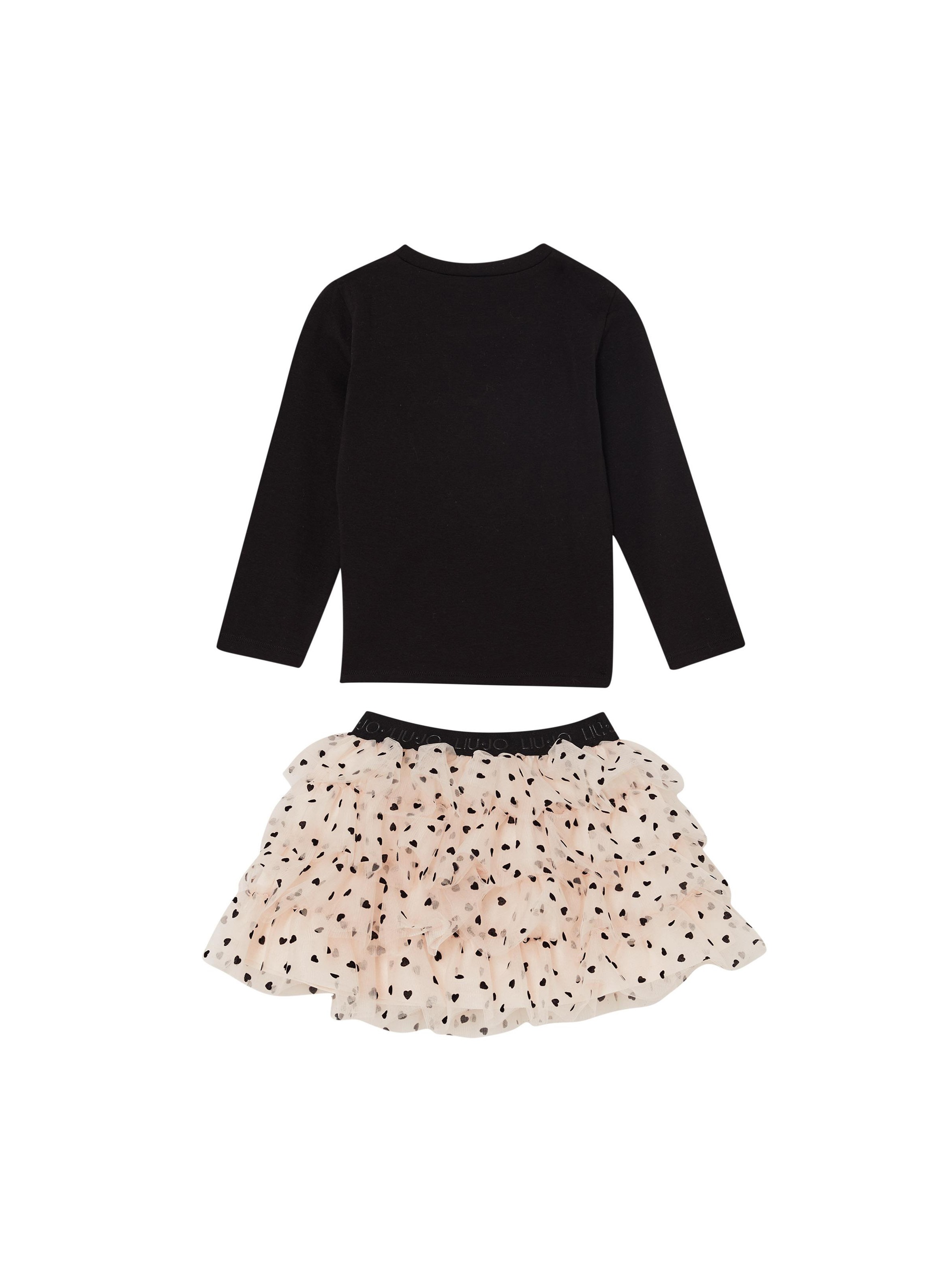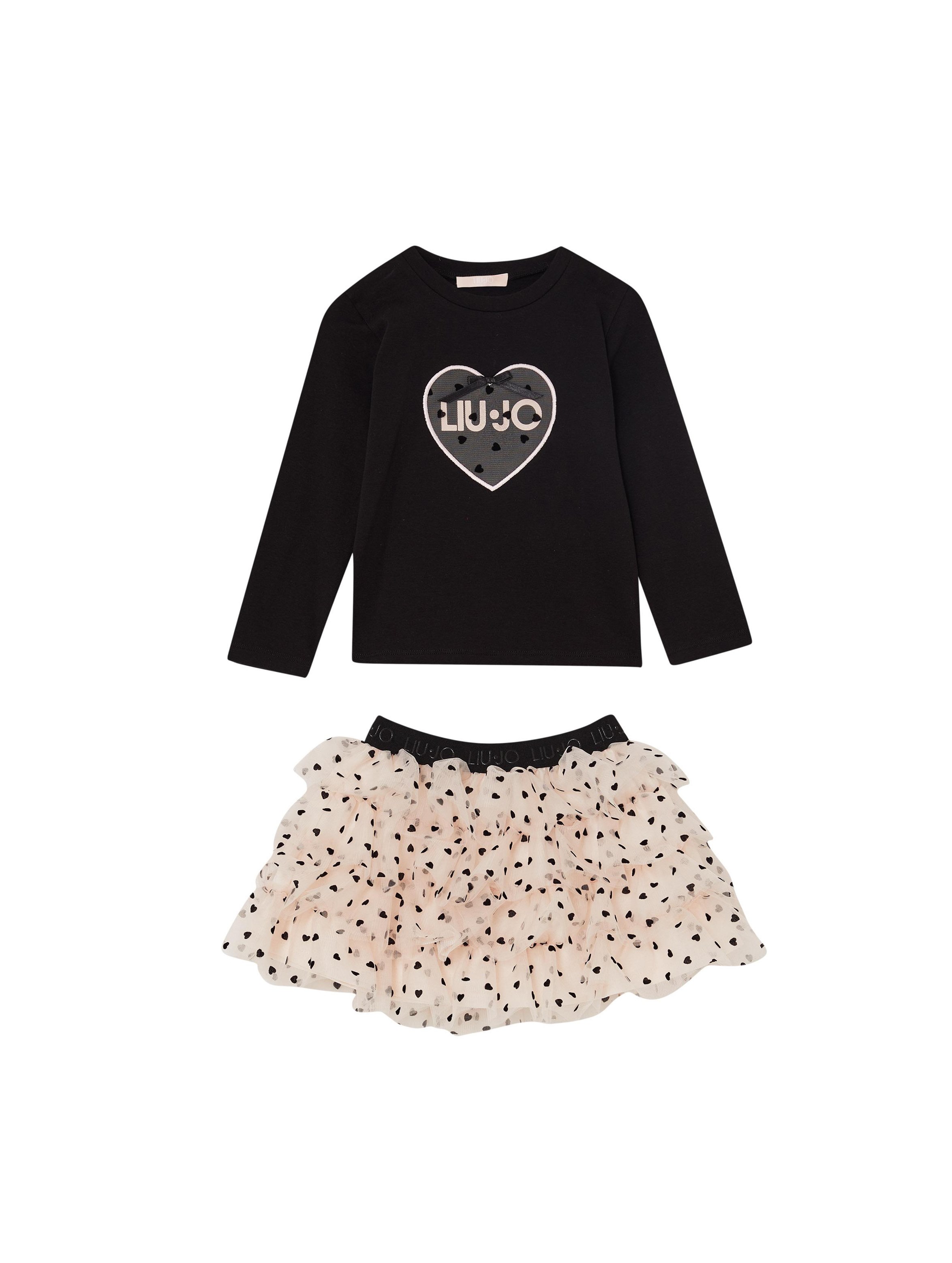 Completo formato da t-shirt a maniche lunghe, girocollo, a tinta unita, con grafica a cuore con logo e fiocchetto sul davanti, e gonna in tulle arricciata con balze, motivo a cuoricini all over e cintura elastica logata in vita. Per un look chic e sbarazzino. LIU.JO