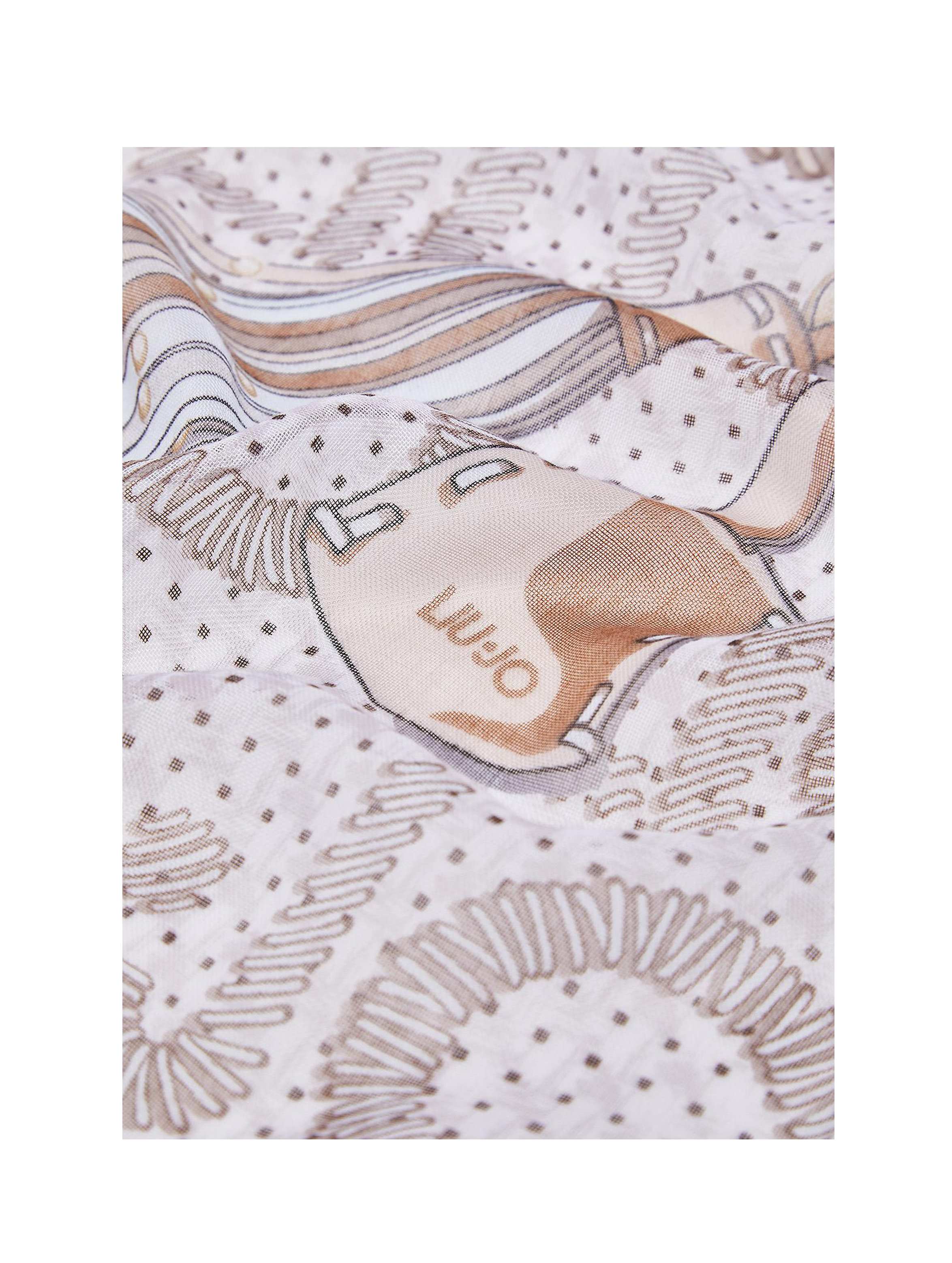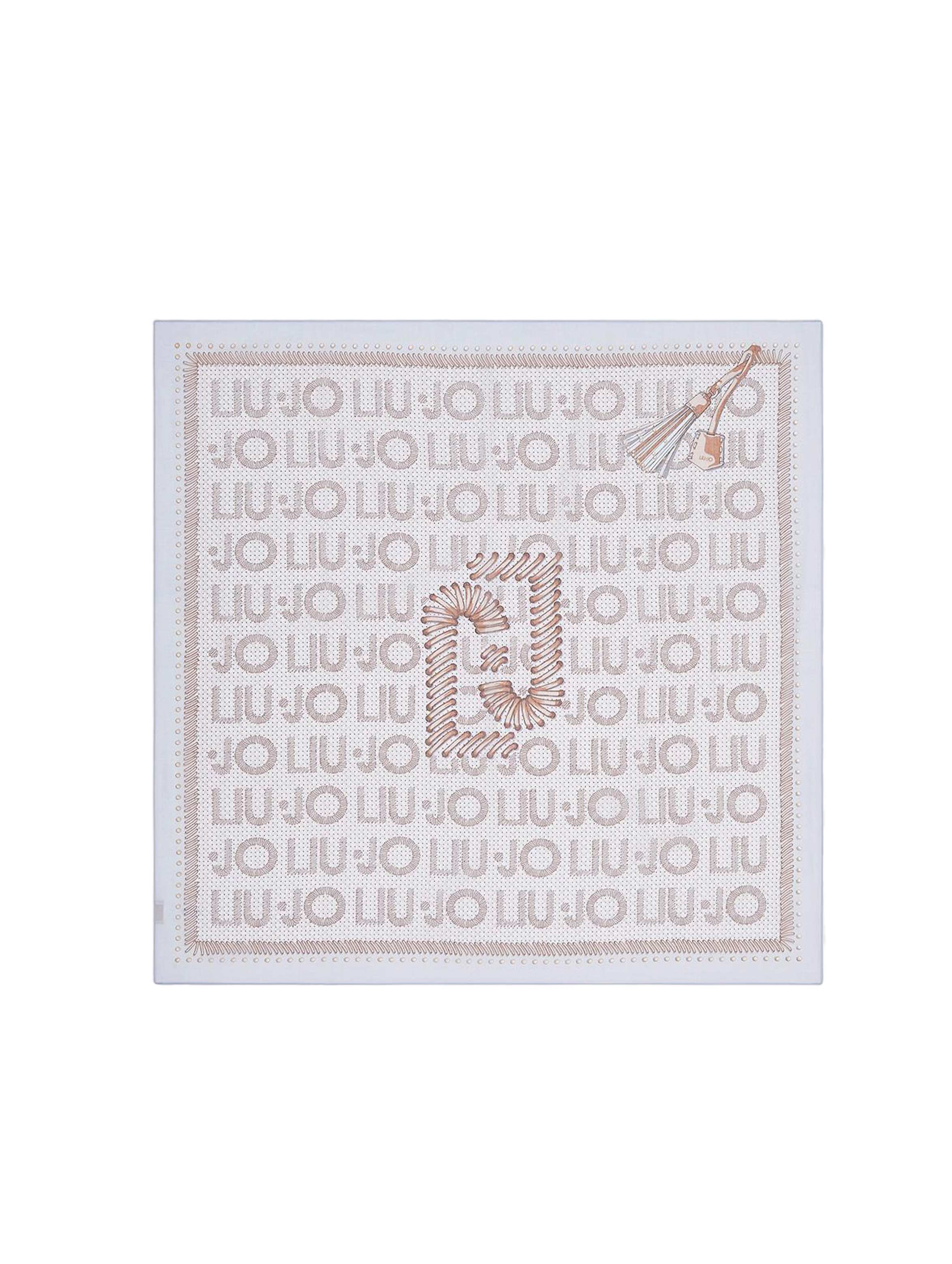 Foulard grande quadrato, realizzato in filati leggeri, con una particolare stampa di nappe sul lato, maxi logo monogram al centro, logo lettering stampato all over e bordo a tinta unita. Per un look fashion e trendy. LIU.JO
