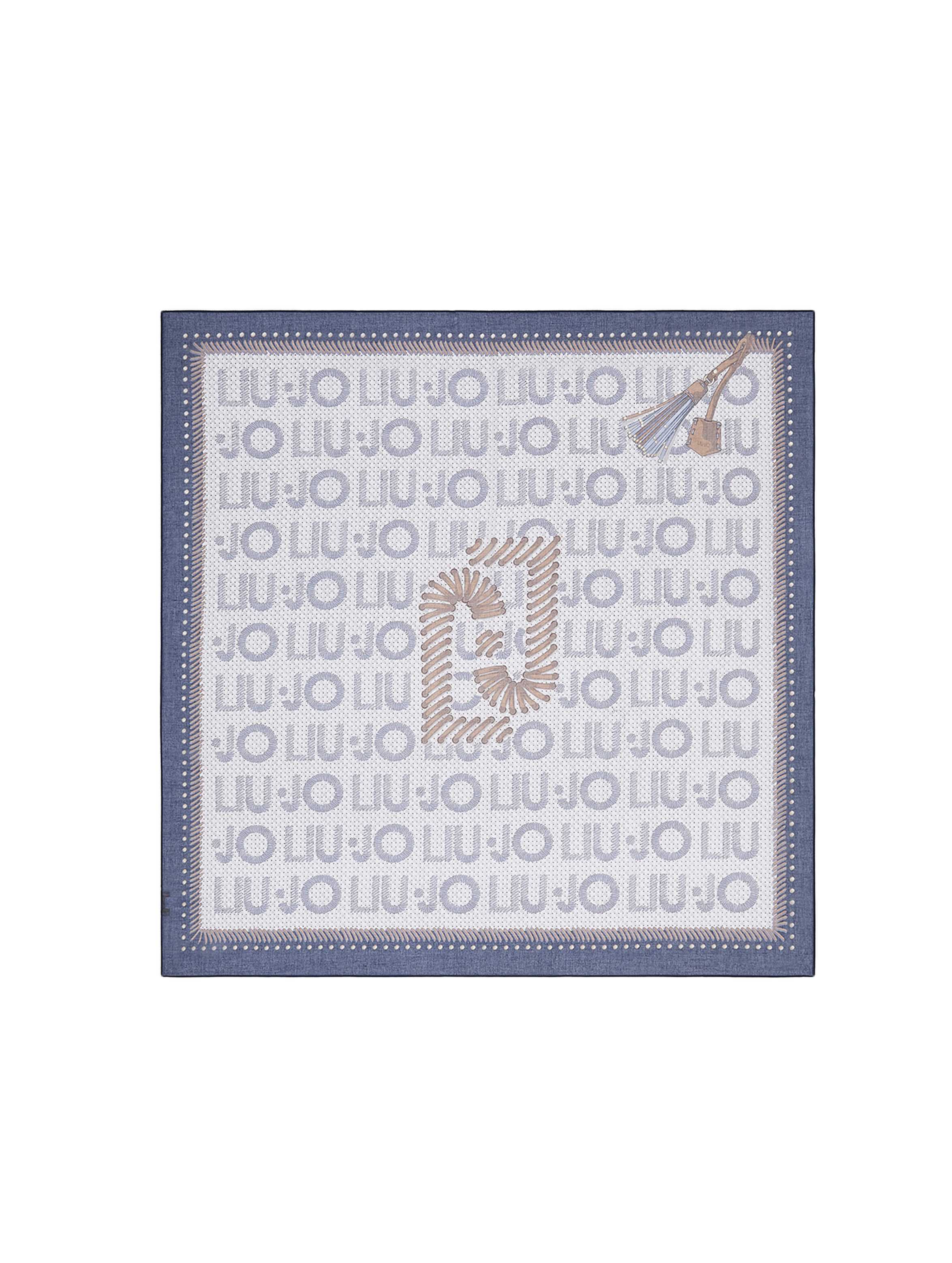 Foulard grande quadrato, realizzato in filati leggeri, con una particolare stampa di nappe sul lato, maxi logo monogram al centro, logo lettering stampato all over e bordo a tinta unita. Per un look fashion e trendy. LIU.JO