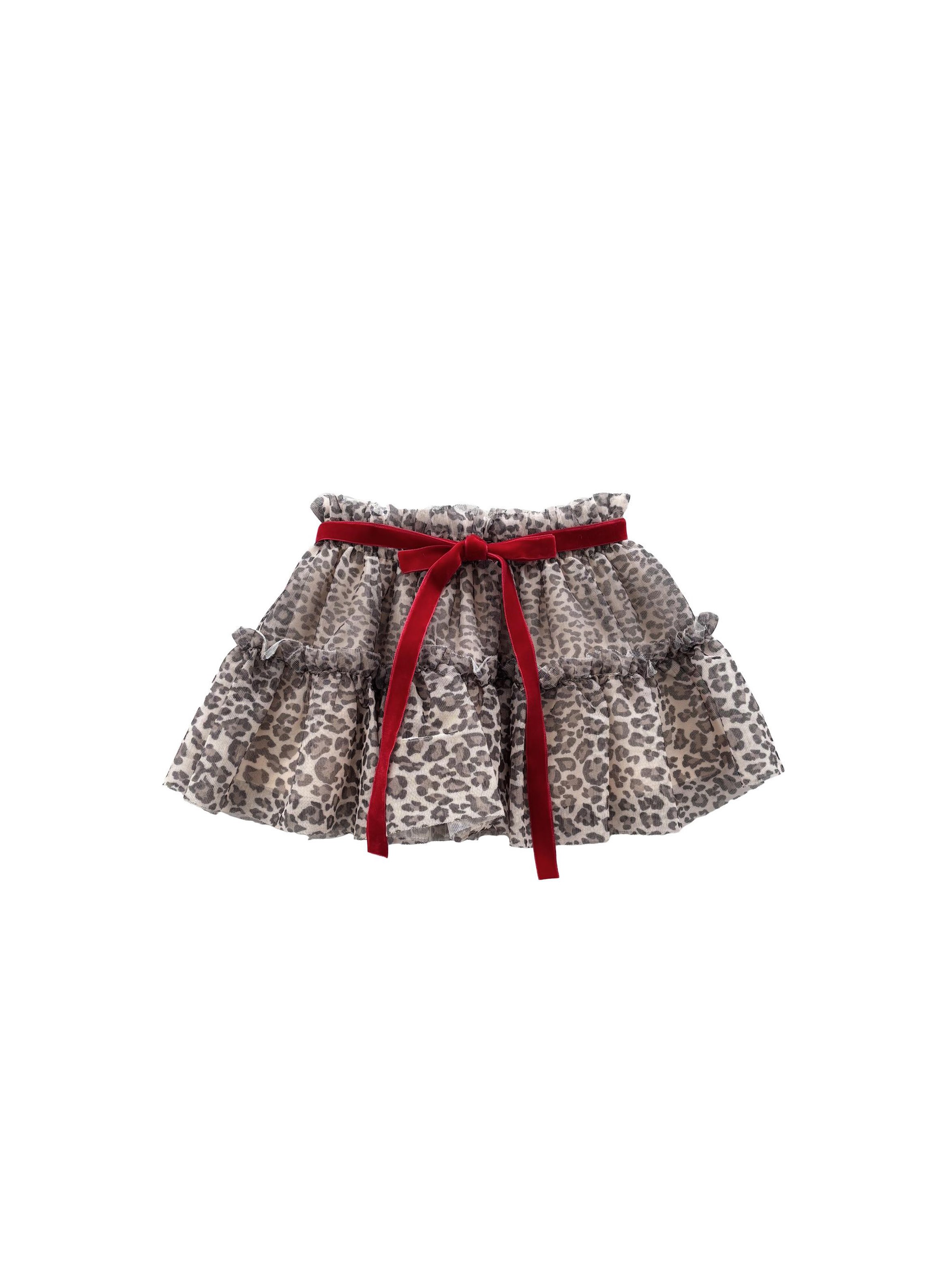 Gonna a ruota in tulle, con vita elasticizzata, fodera interna, con stampa animalier all over, mini rouches, balza e cintura in velluto in abbinamento. Per un look fashion e cool. LIU.JO