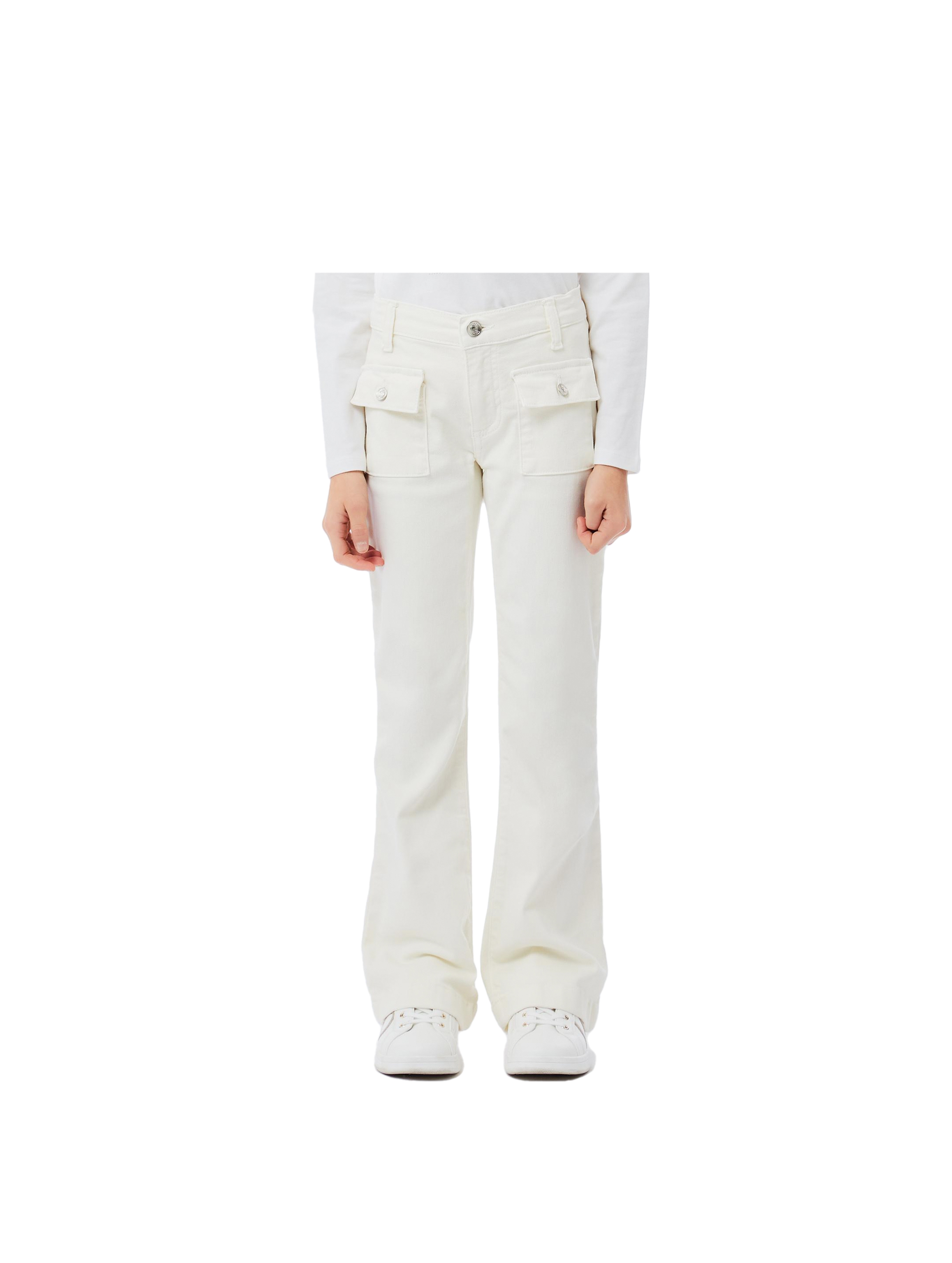 Pantaloni in gabardina di cotone stretch, con vita regolare, gamba flare, tasche sul davanti e sul retro, chiusura con bottone e zip nascosta e logo in metallo sul retro. Per un look trendy e fashion. LIU.JO