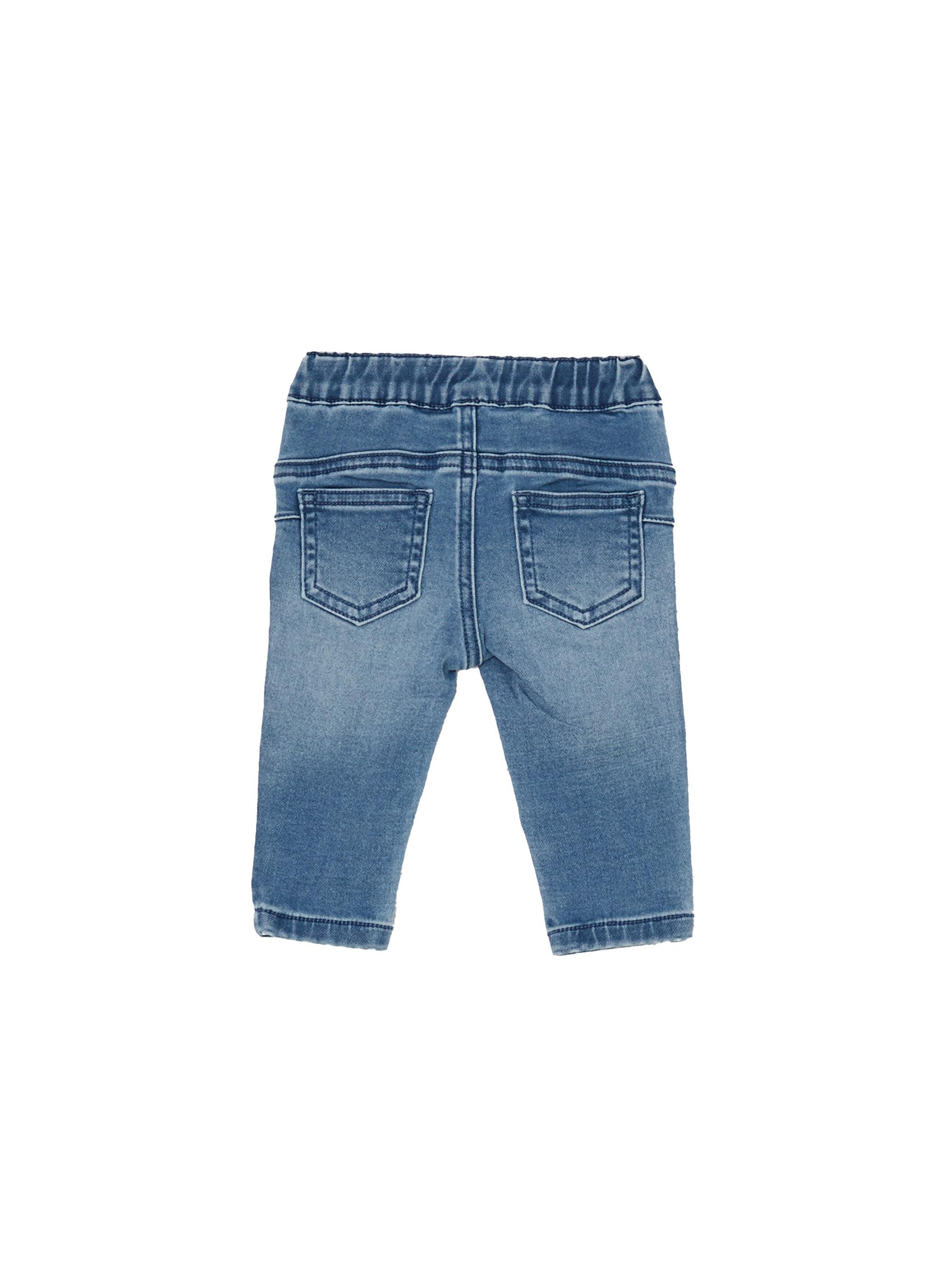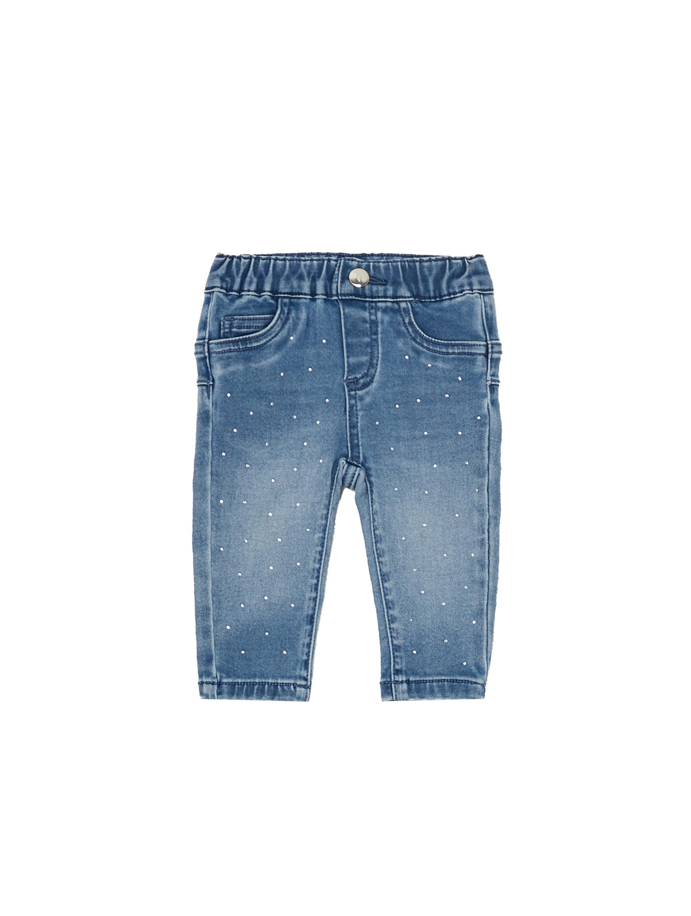 Jeans in denim dal lavaggio medio, con leggere sfumature effetto used, modello 5 tasche, con vita elasticizzata, apertura con bottone e zip centrali e particolare dettaglio di strass applicati su tutta la parte frontale che donano un tocco di luce al capo. Per un look casual chic. LIU.JO