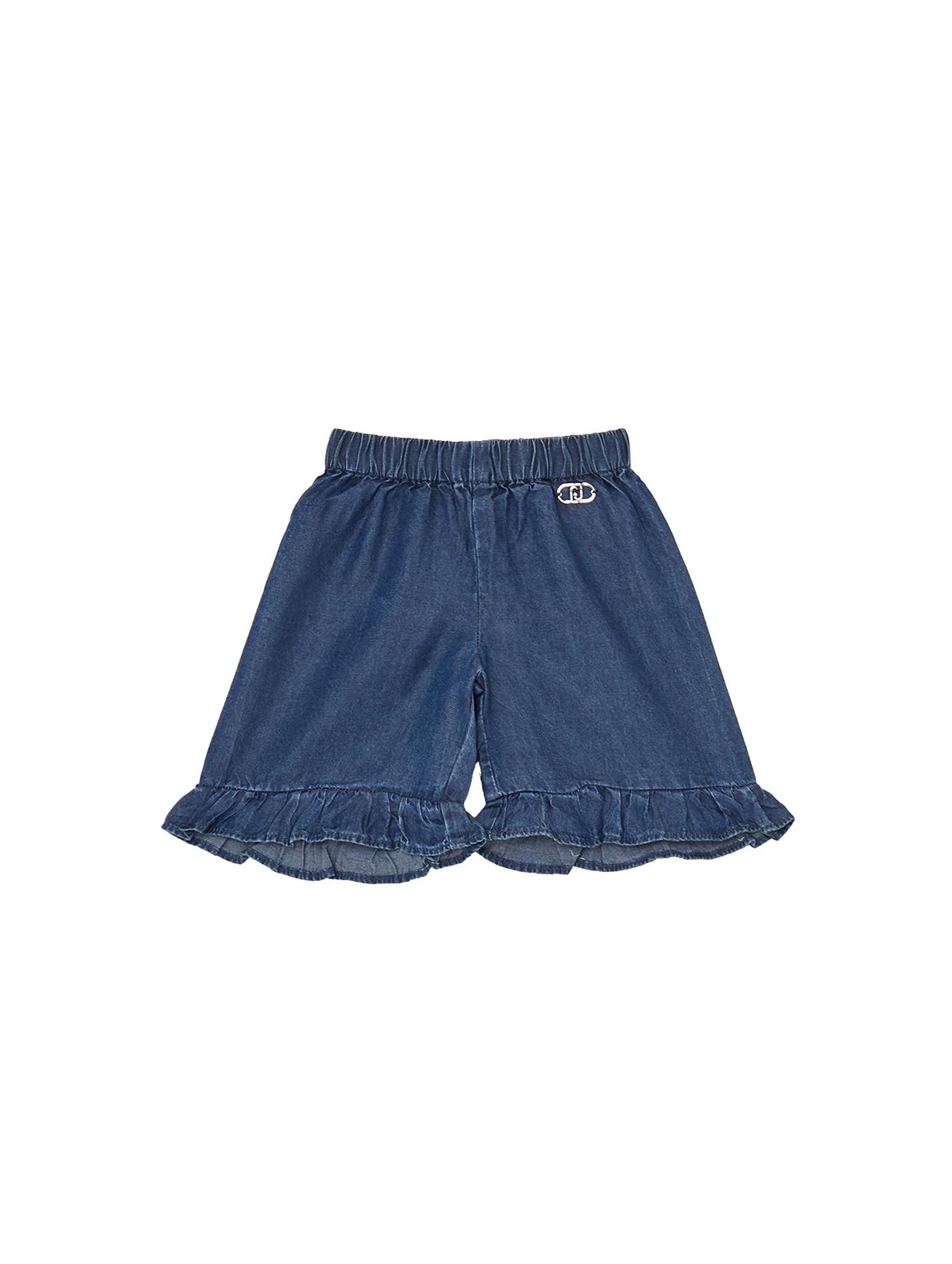 Bermuda in denim dal lavaggio scuro, con vita elasticizzata, gamba ampia, placchetta con logo LJ sul lato e rouches sul fondo. Per un look casual chic. LIU.JO