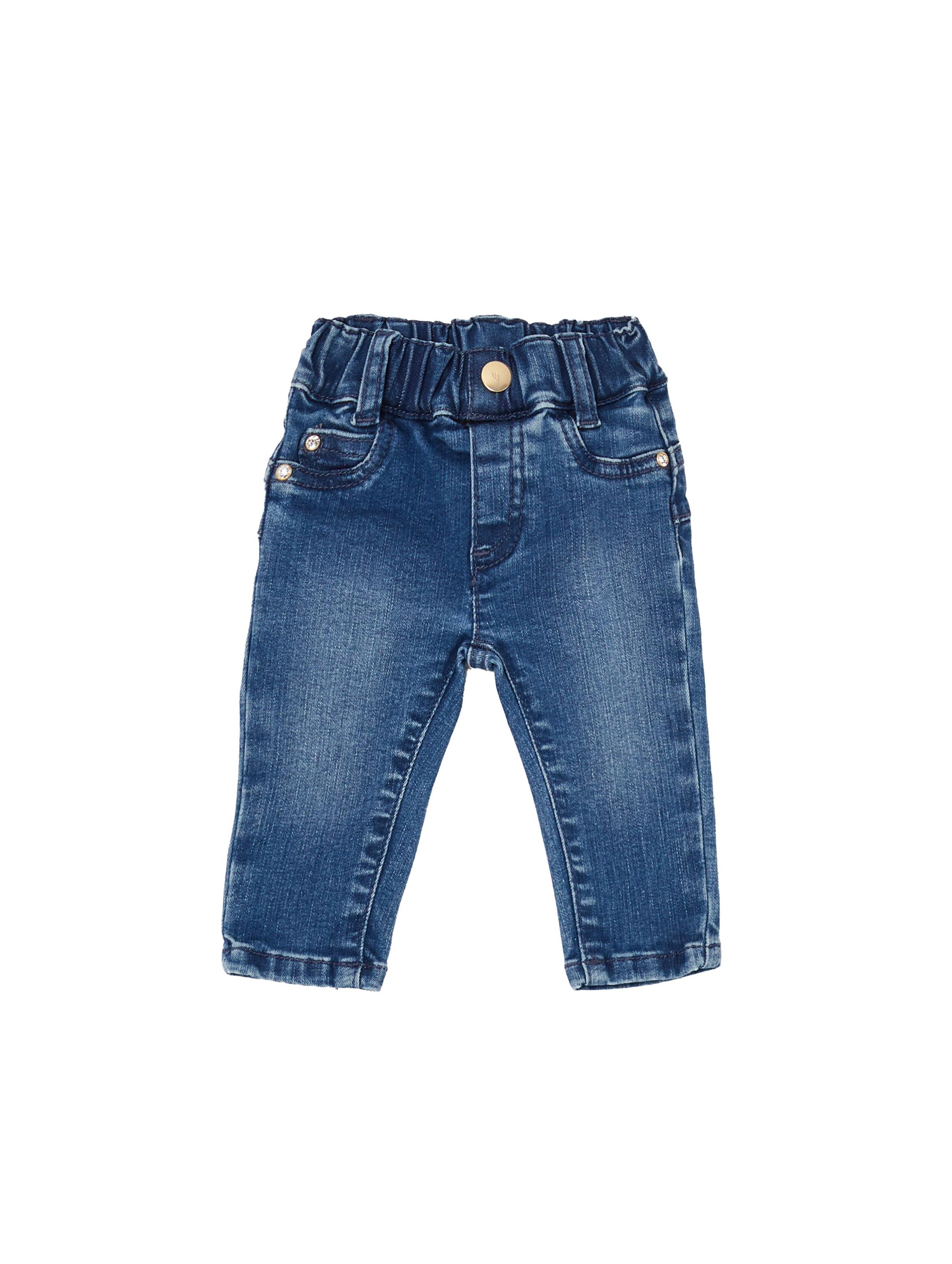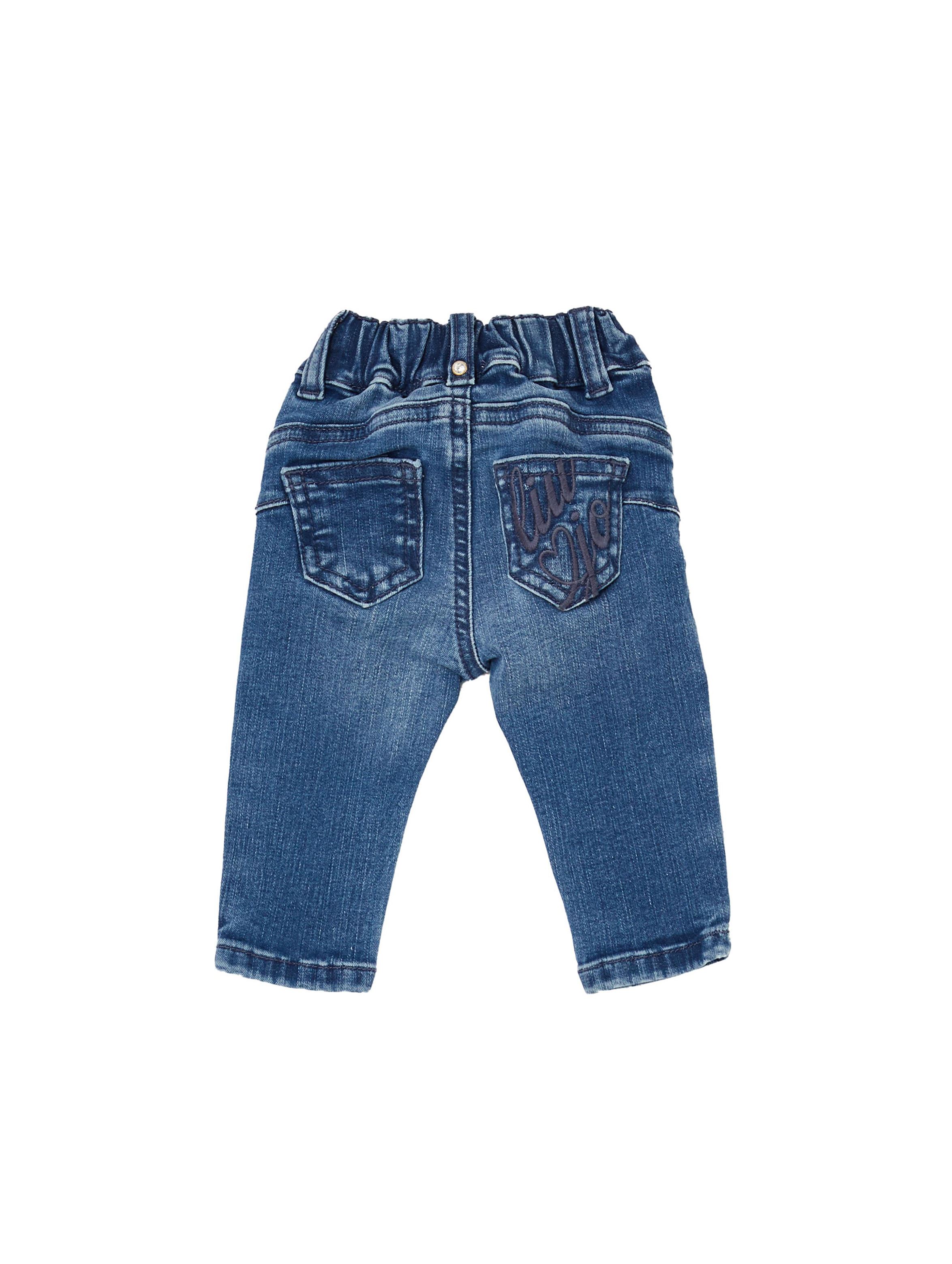 Jeans in denim di cotone stretch, con vita elasticizzata, cinque tasche, bottone, sfumature effetto used e logo ricamato sul retro. Casual e trendy. LIU.JO