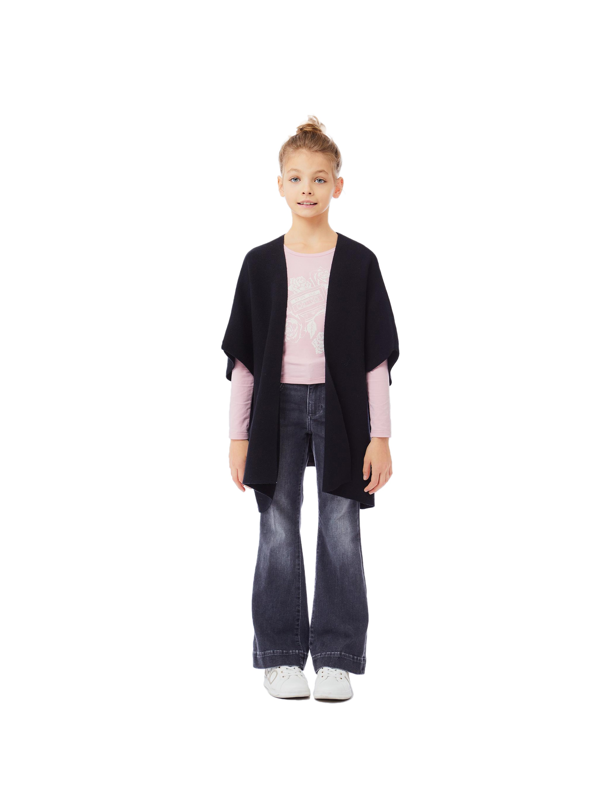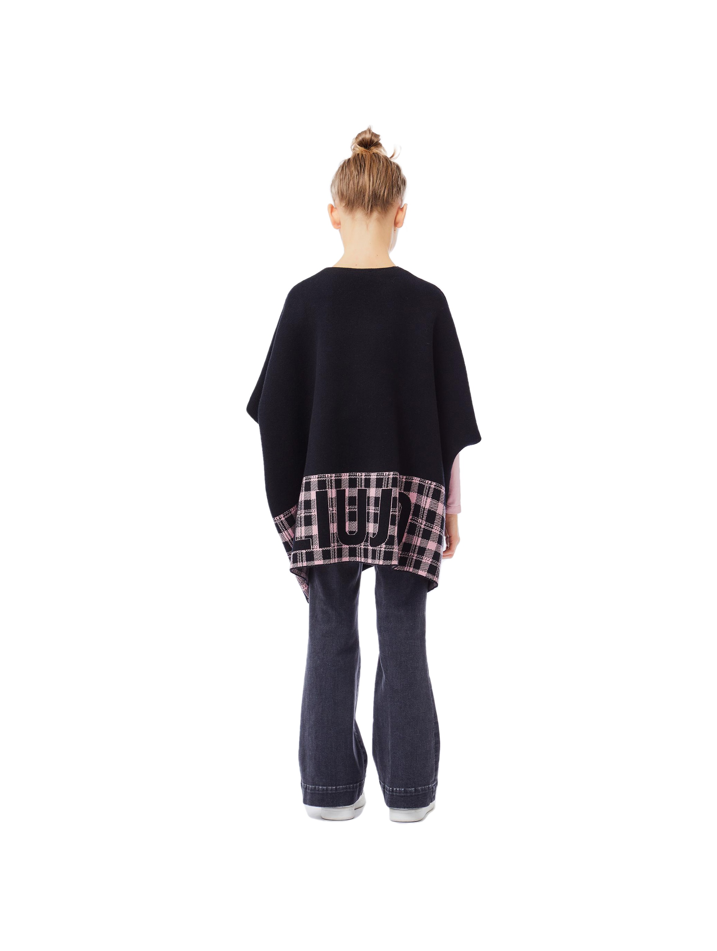 Poncho aperto in maglia a maniche corte, modello con spalla scesa, a tinta unita, con banda a fantasia tartan sul retro e maxi logo a contrasto. Per un look country e chic. LIU.JO