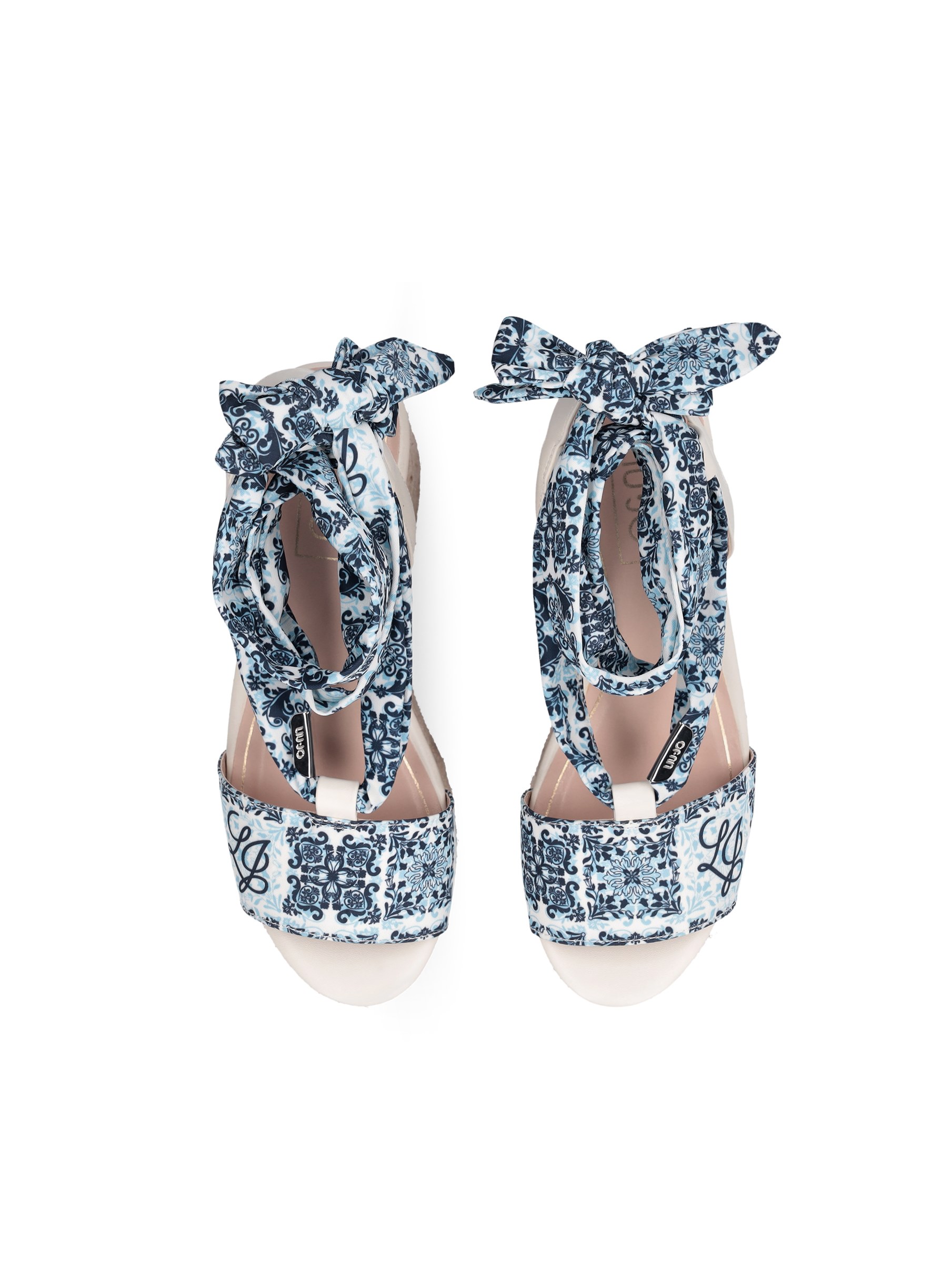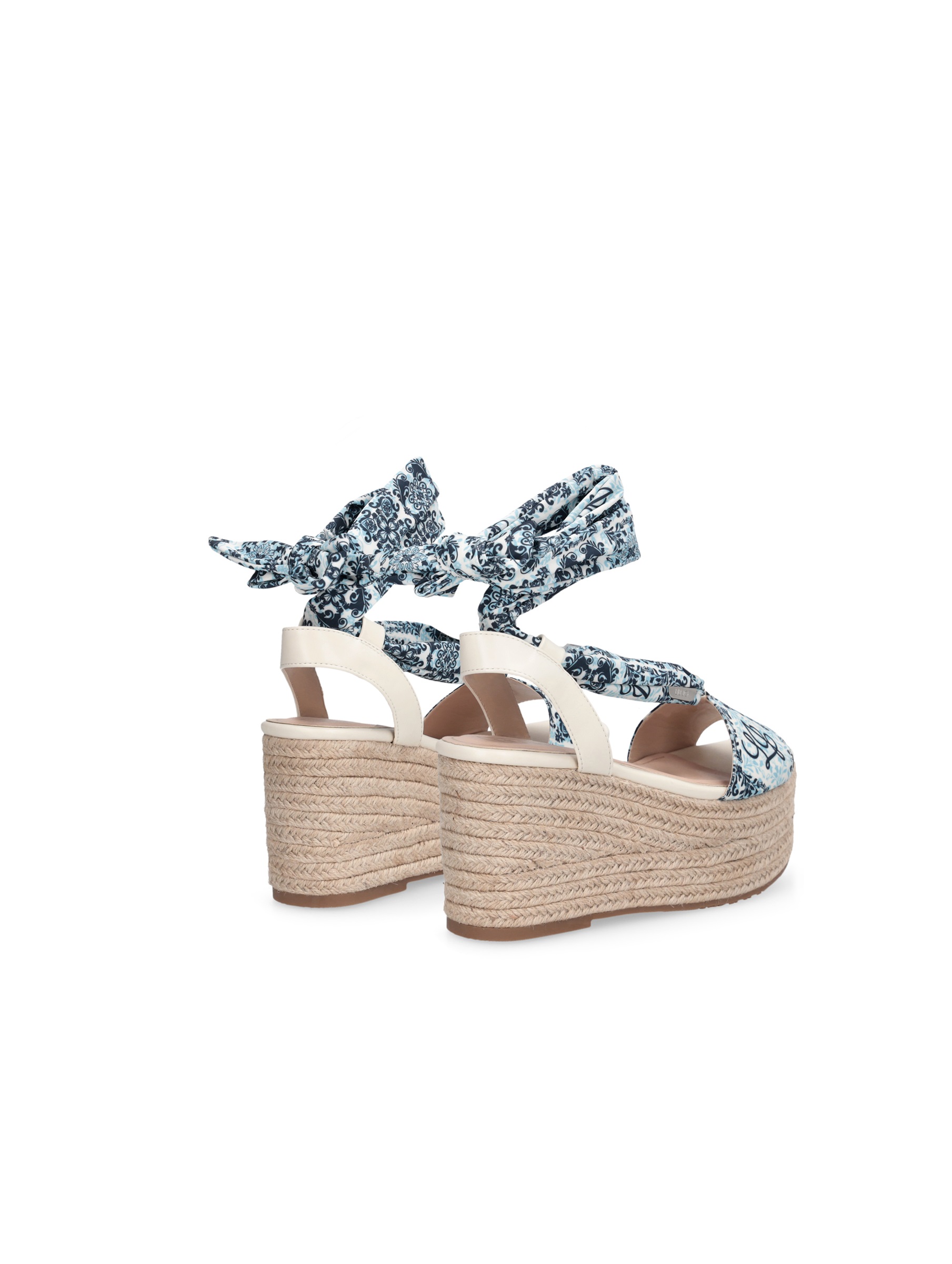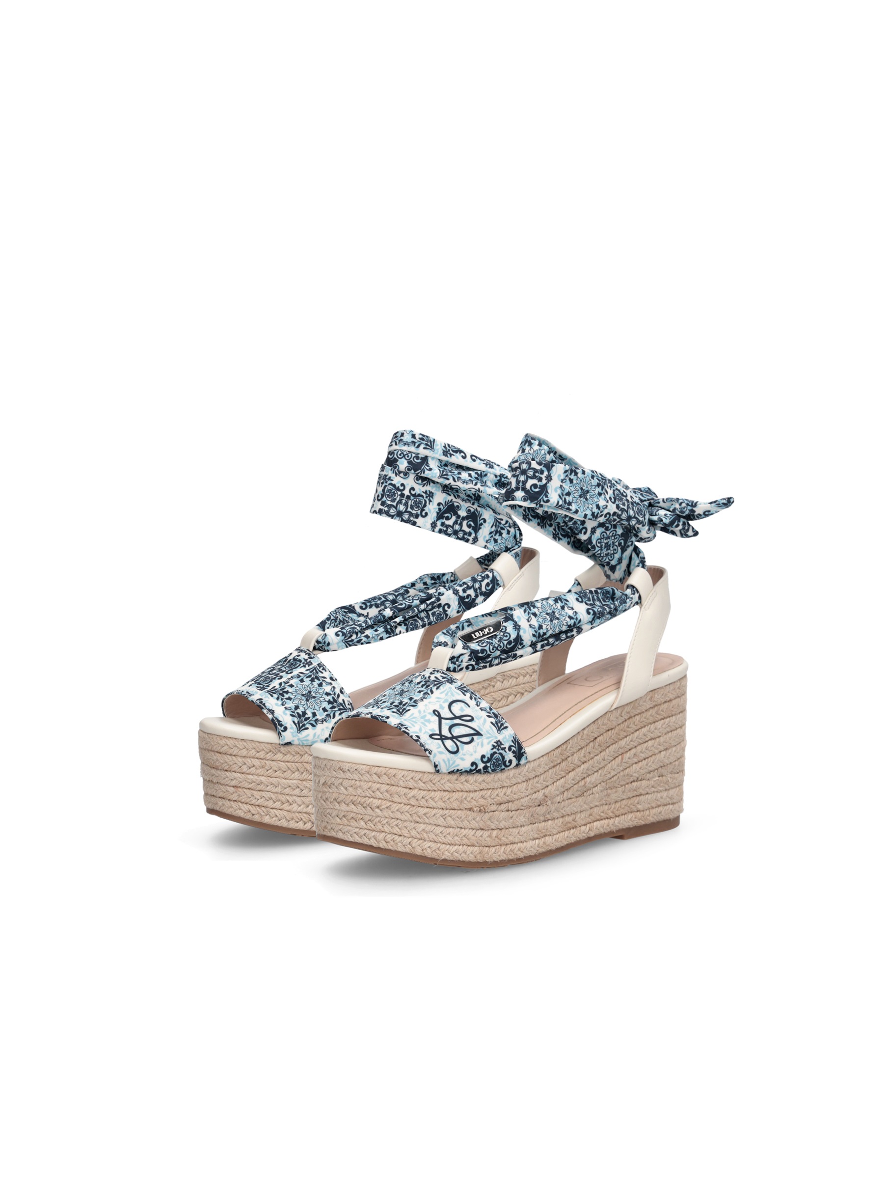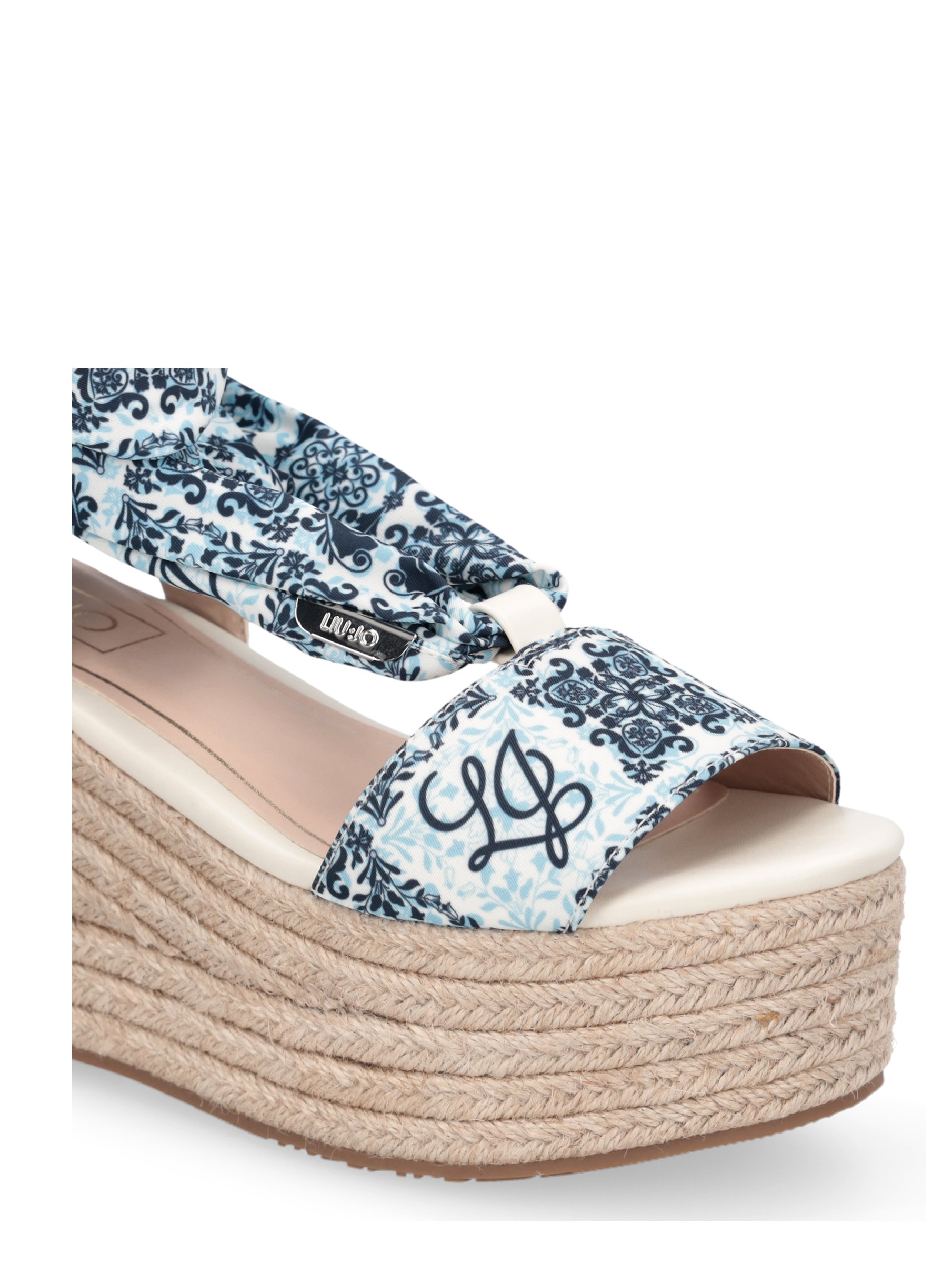 Sandali zeppa con foulard, con fascette stampate, chiusura con nastri foulard, logo ricamato, targhetta metallica con logo e zeppa alta 8,5 cm rivestita in corda intrecciata. Per un look fashion e trendy. LIU.JO