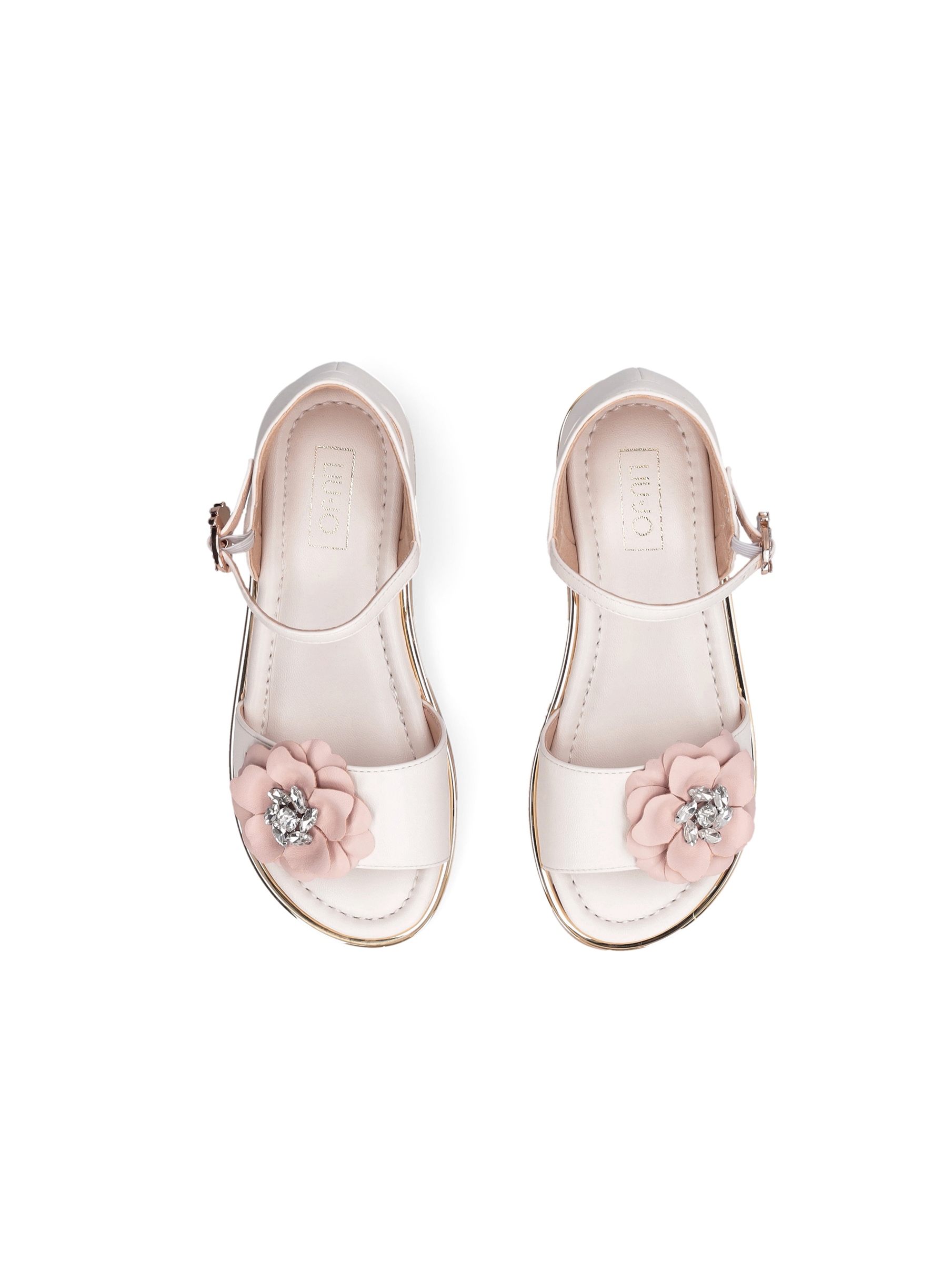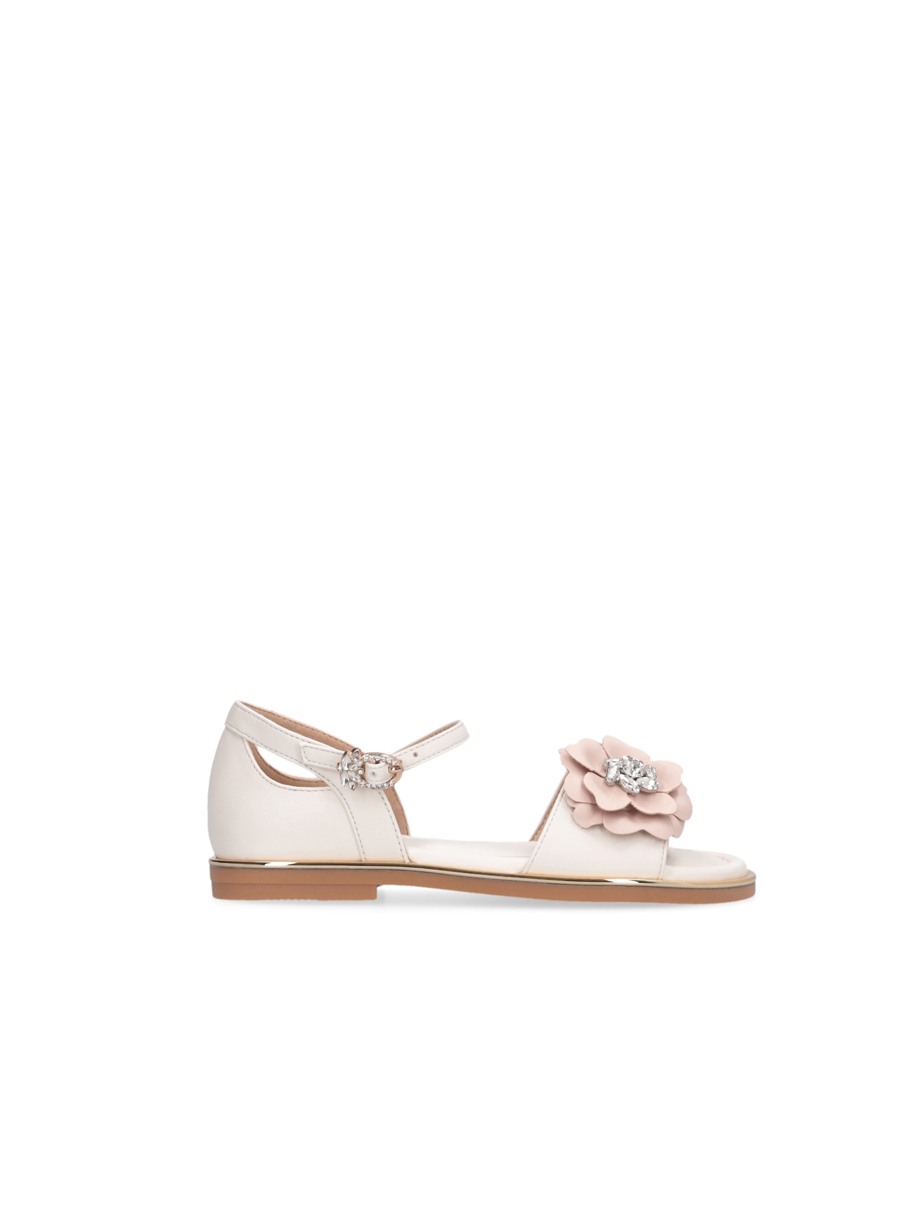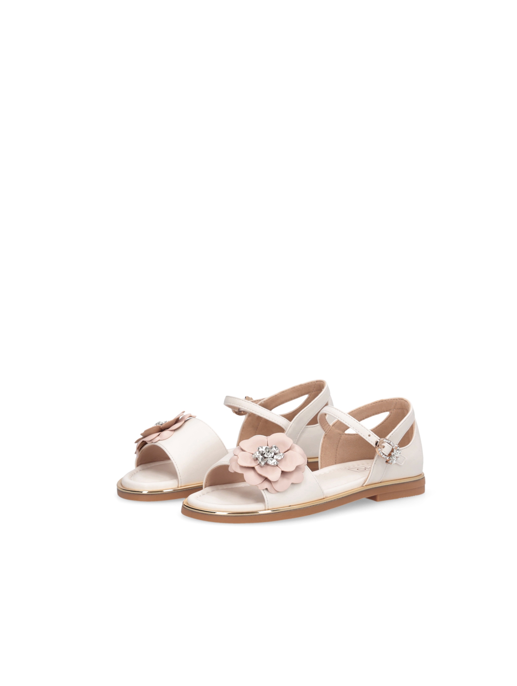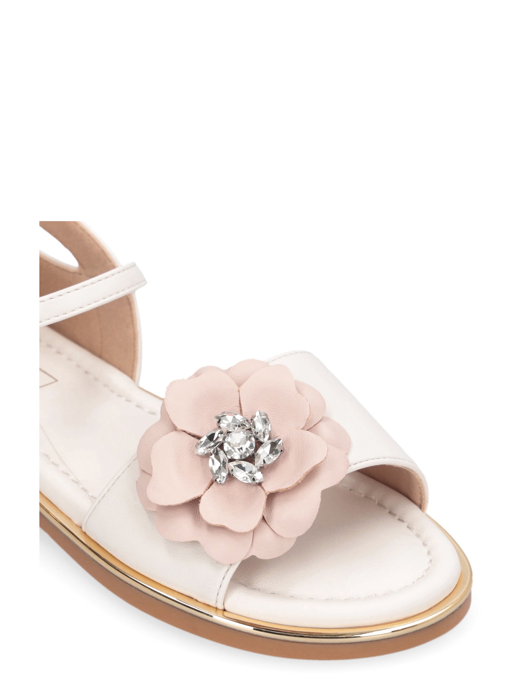 Sandalo basso con tallone coperto, fascia sul davanti con dettaglio di fiore applicato con pietre gioiello che donano lucentezza, chiusura con cinturino alla caviglia regolabile con fibbia gioiello, sottopiede morbido e confortevole e spoiler metallico intorno la calzatura. Per un look elegante e raffinato. LIU.JO