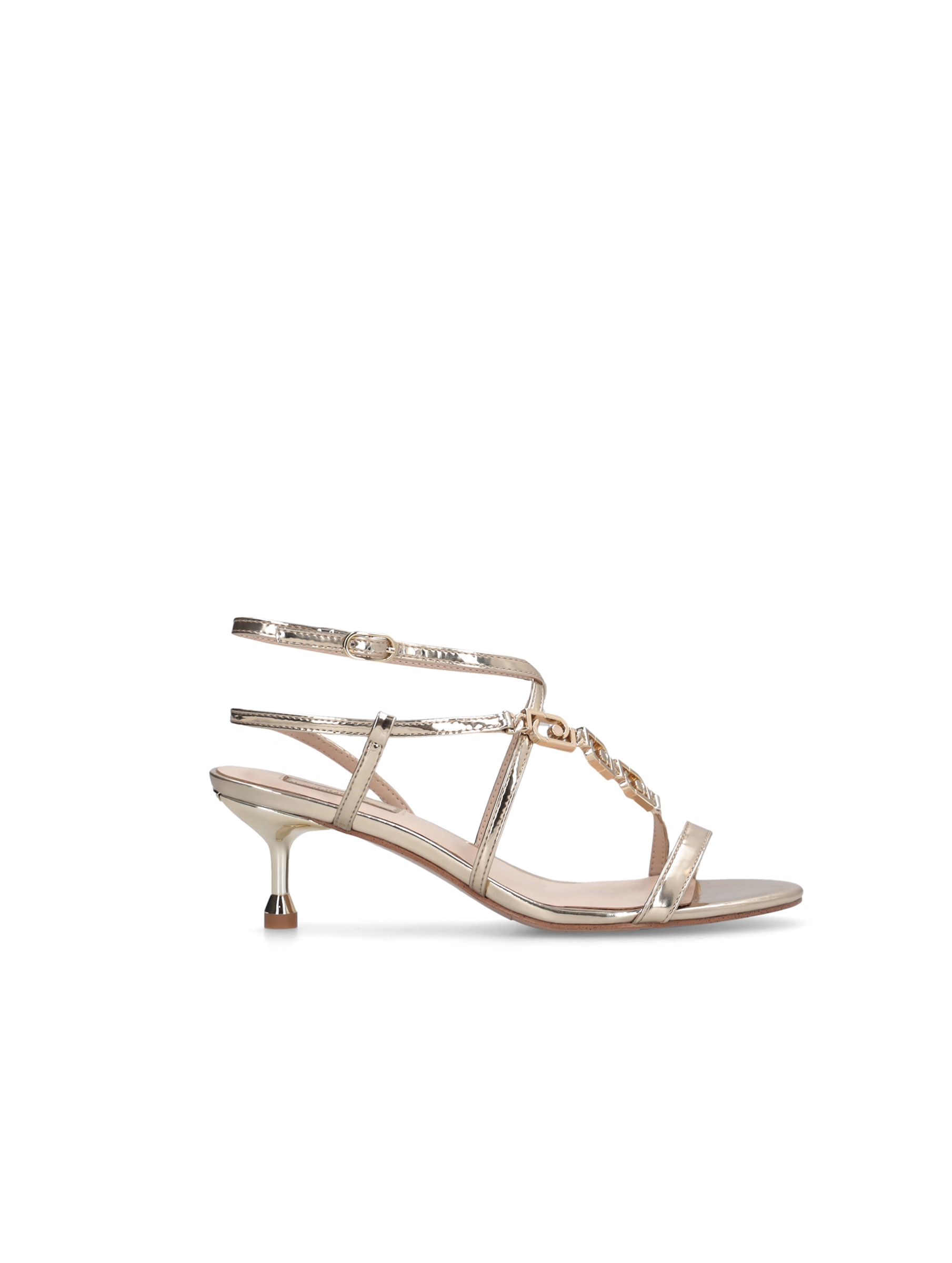 Sandali con tomaia in laminato a specchio, con multi logo chain in metallo, cinturini incrociati con fibbie regolabili e tacco basso a spillo con iconico dettaglio metallizzato. Per un look elegante e chic. LIU.JO