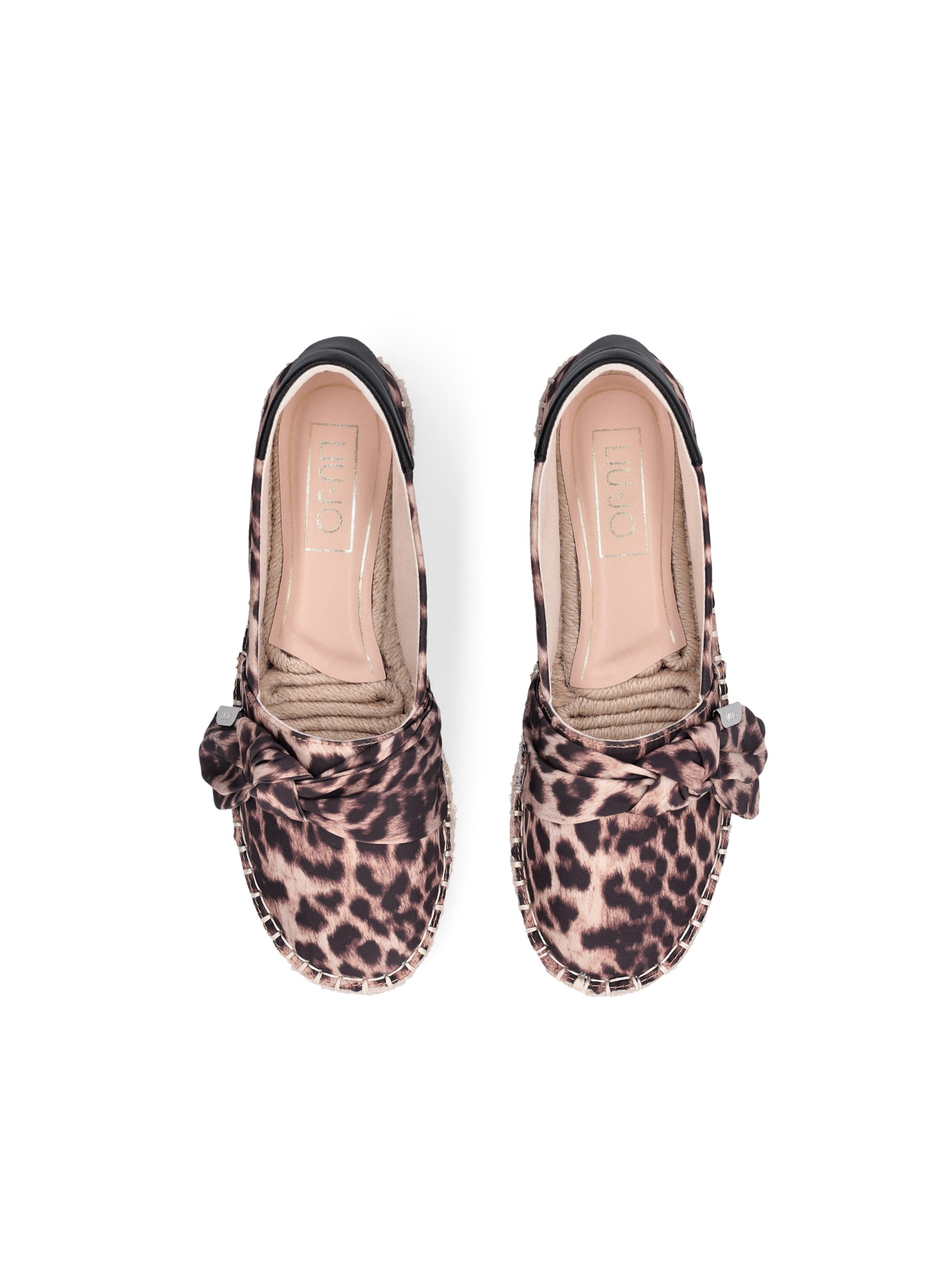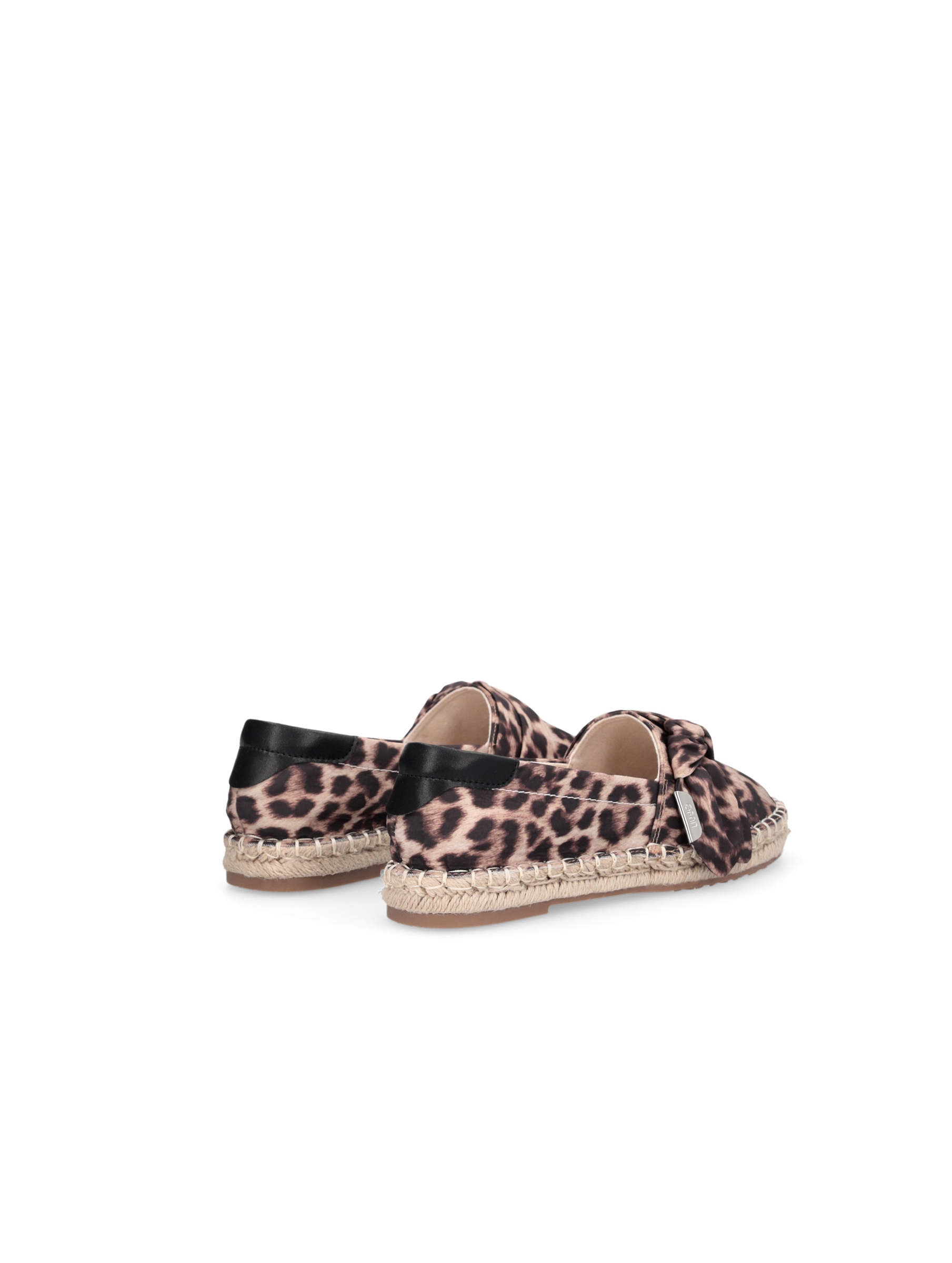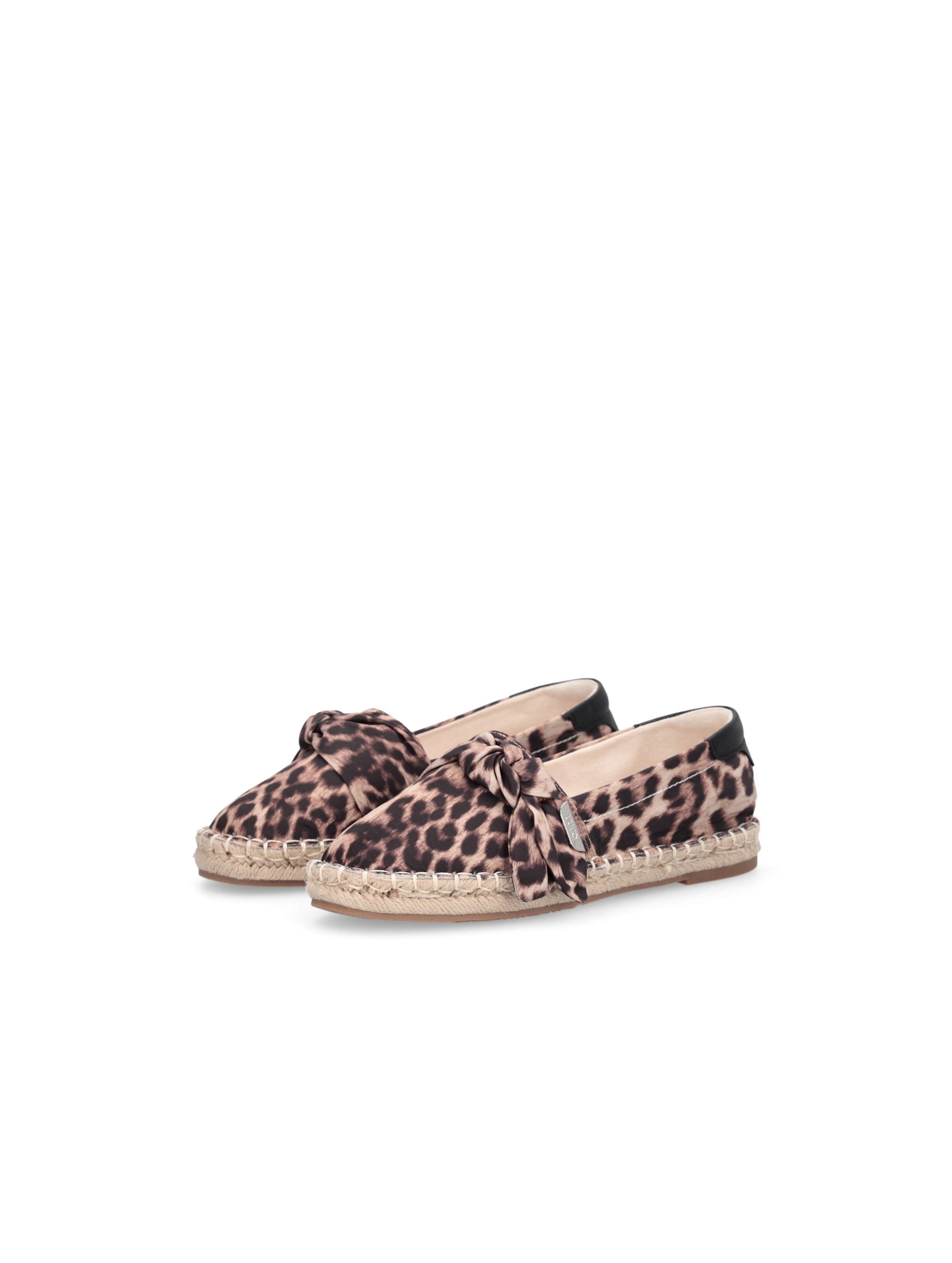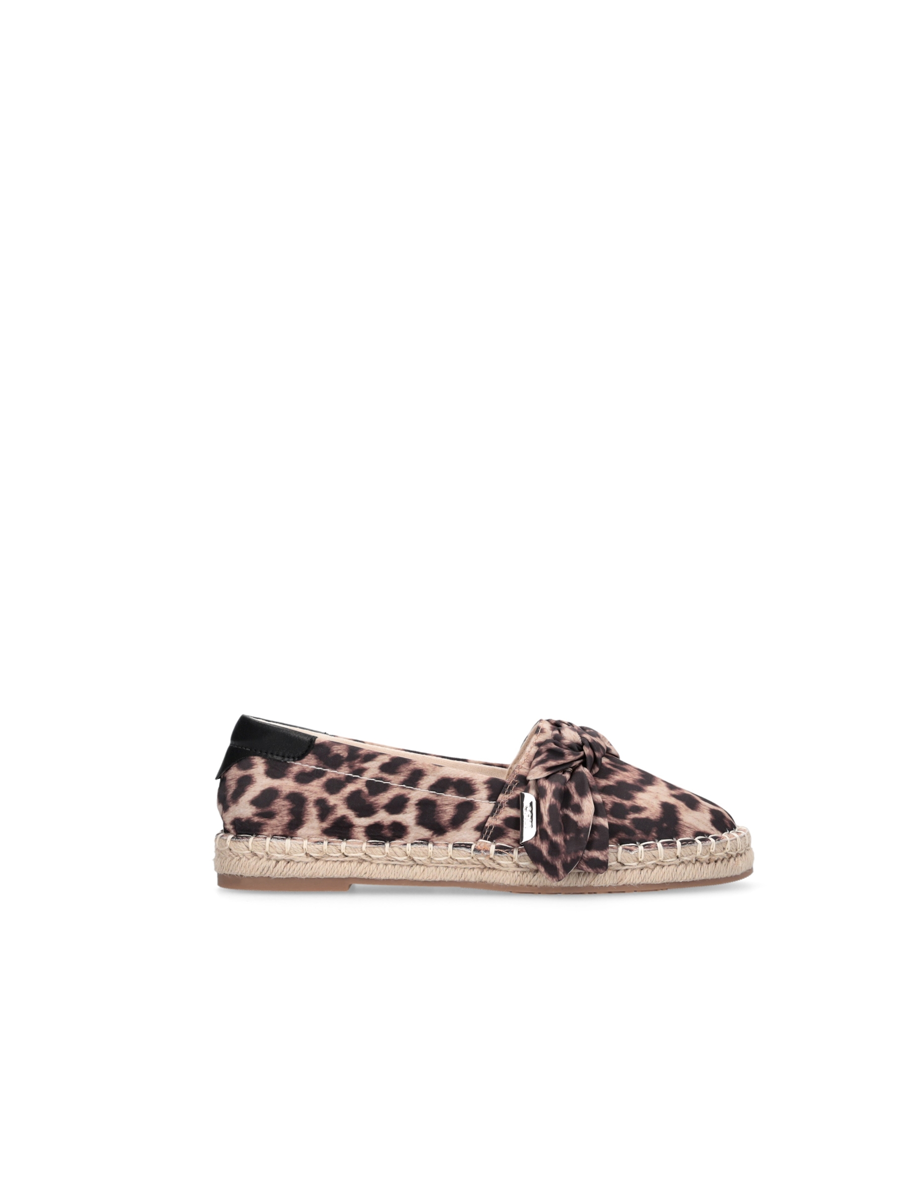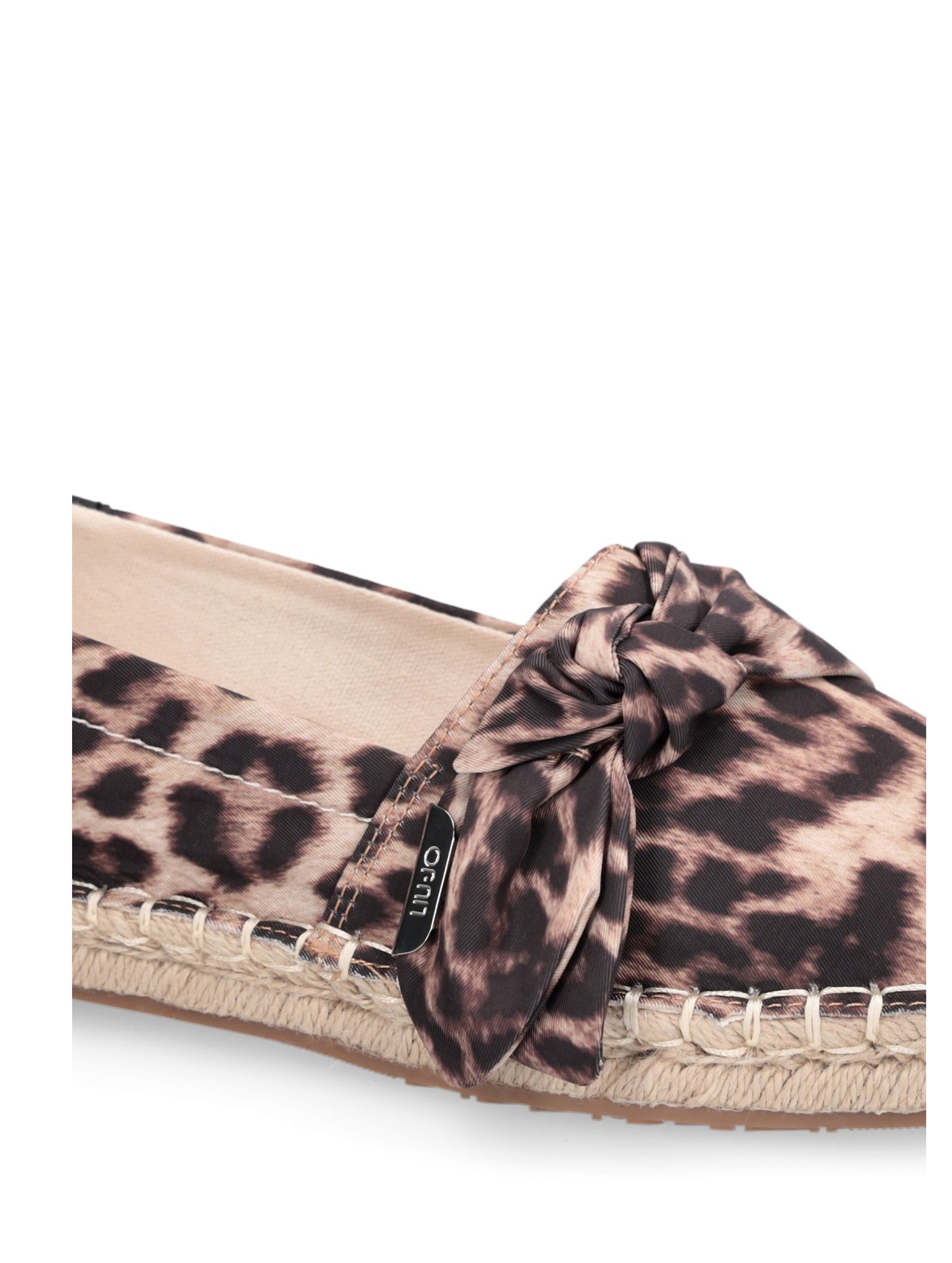 Scarpa espadrillas con tomaia in stampa animalier, con dettaglio fiocco applicato sul collo, accessorio in metallo logato, dettaglio in pelle sul tallone e suola in corda intrecciata. Per un look fashion e chic. LIU.JO