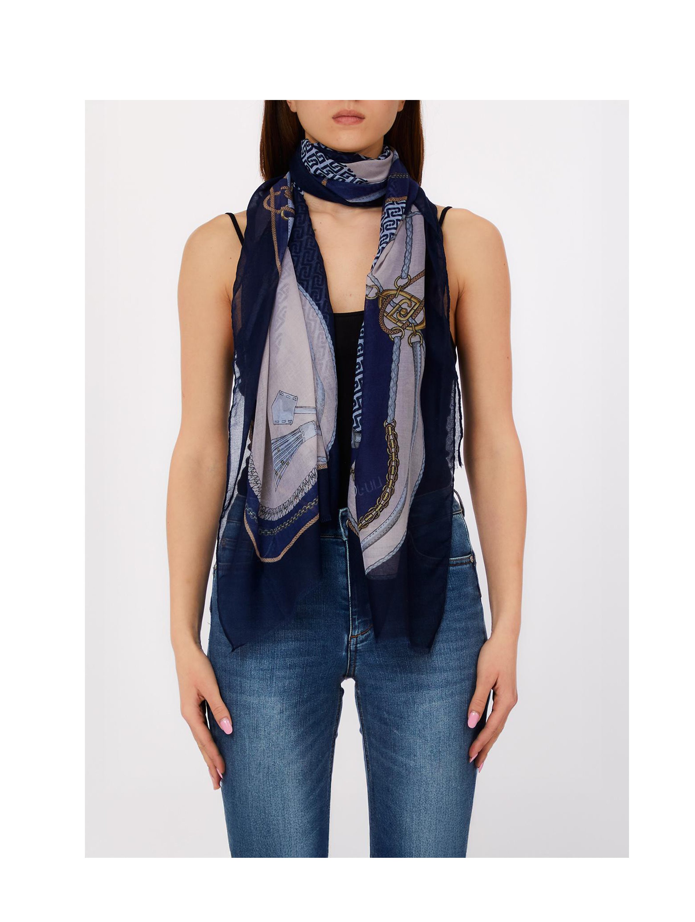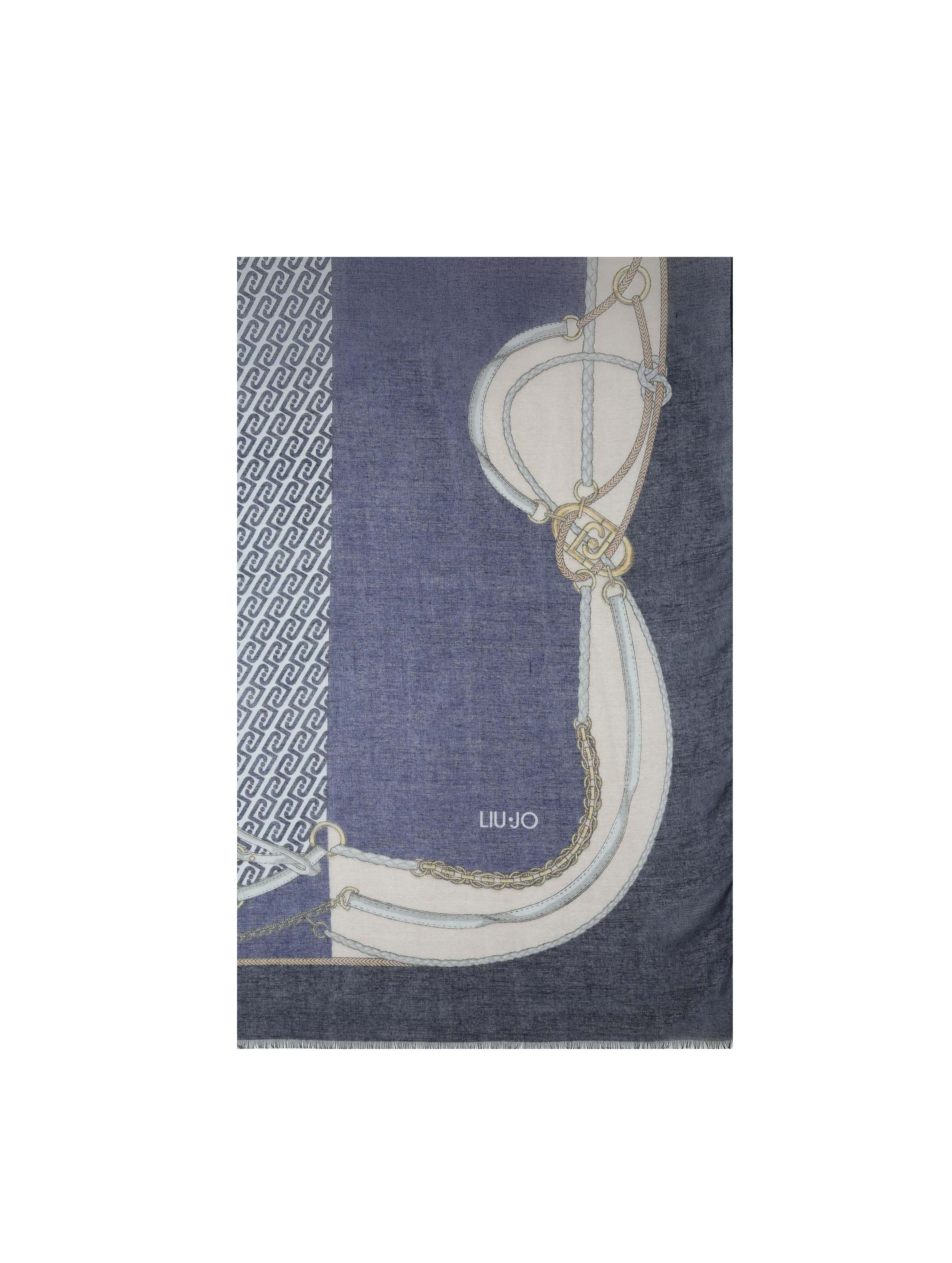 Stola rettangolare realizzata con filati in poliestere riciclato, con orli unfinished e particolare stampa di nappe, catene e logo chain. Per un look fashion e chic. LIU.JO