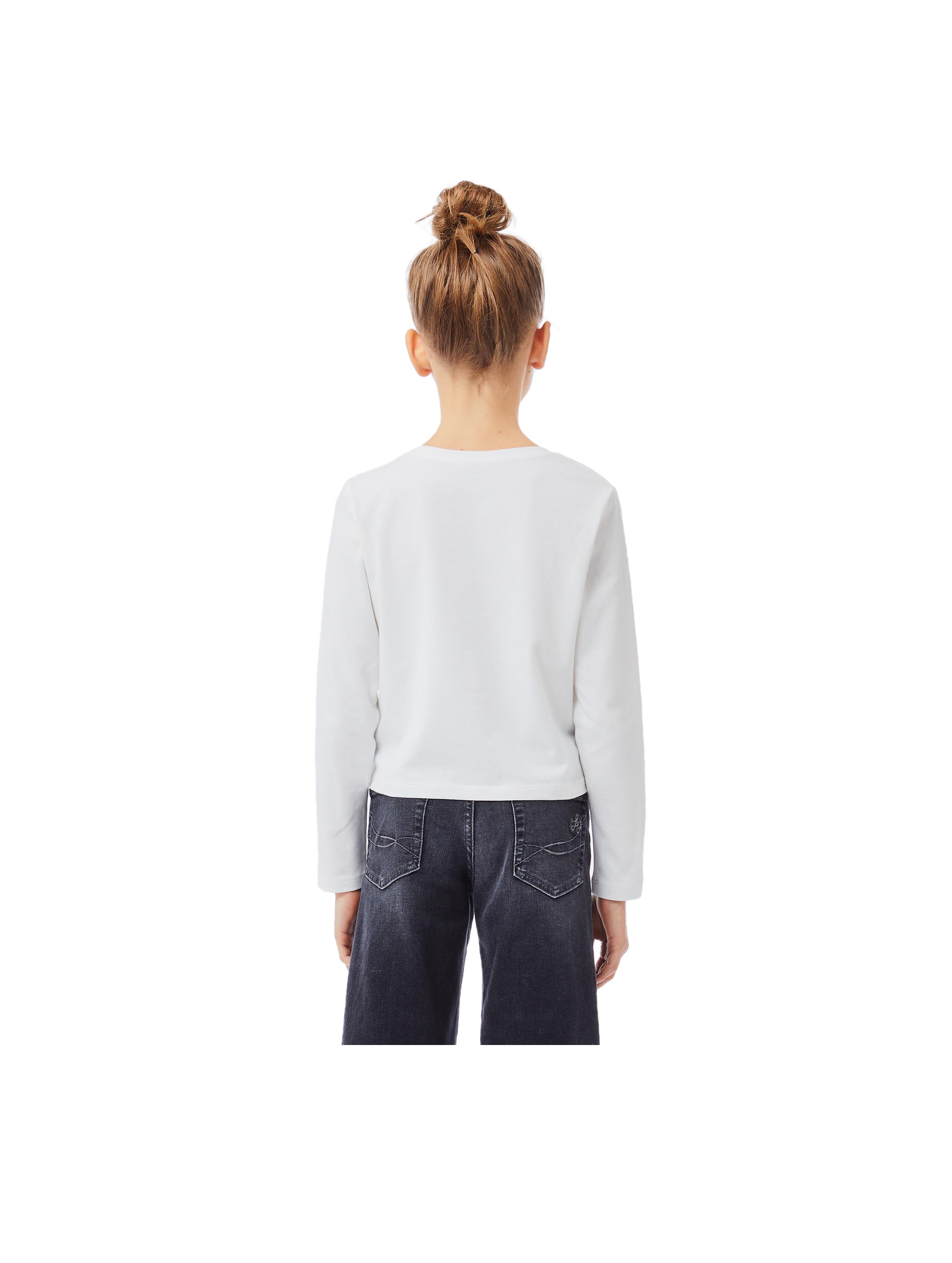 T-shirt a maniche lunghe, con scollo rotondo, a tinta unita, con maxi logo LJ a contrasto con stampa pied de poule e strass sul davanti. Per un look chic e fashion. LIU.JO