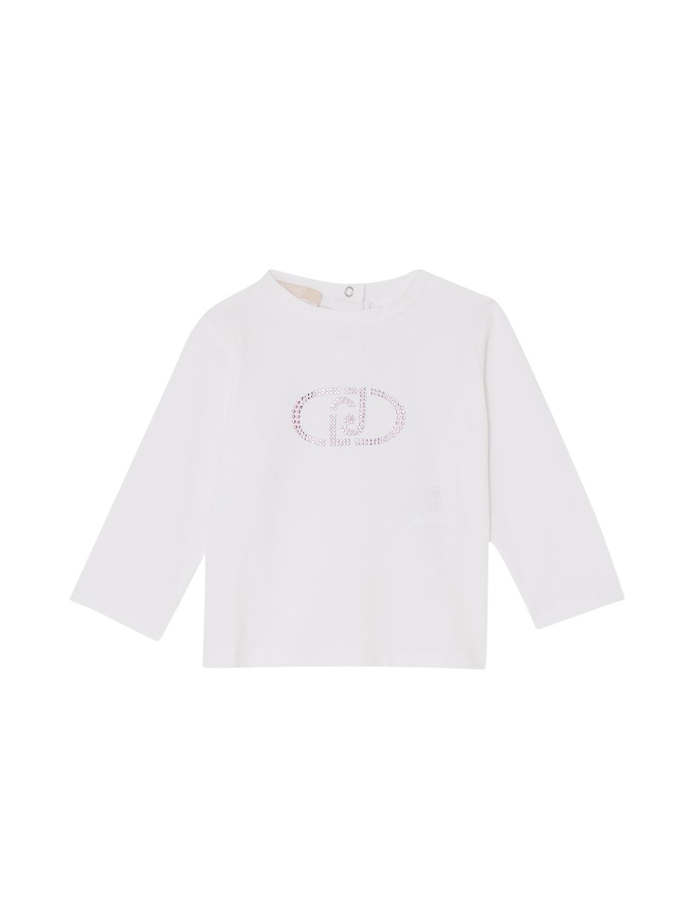 T-shirt a maniche lunghe, con scollo rotondo, a tinta unita, con apertura con bottone a pressione sul retro e maxi logo LJ Oval in strass sul davanti. Per un look casual e trendy. LIU.JO
