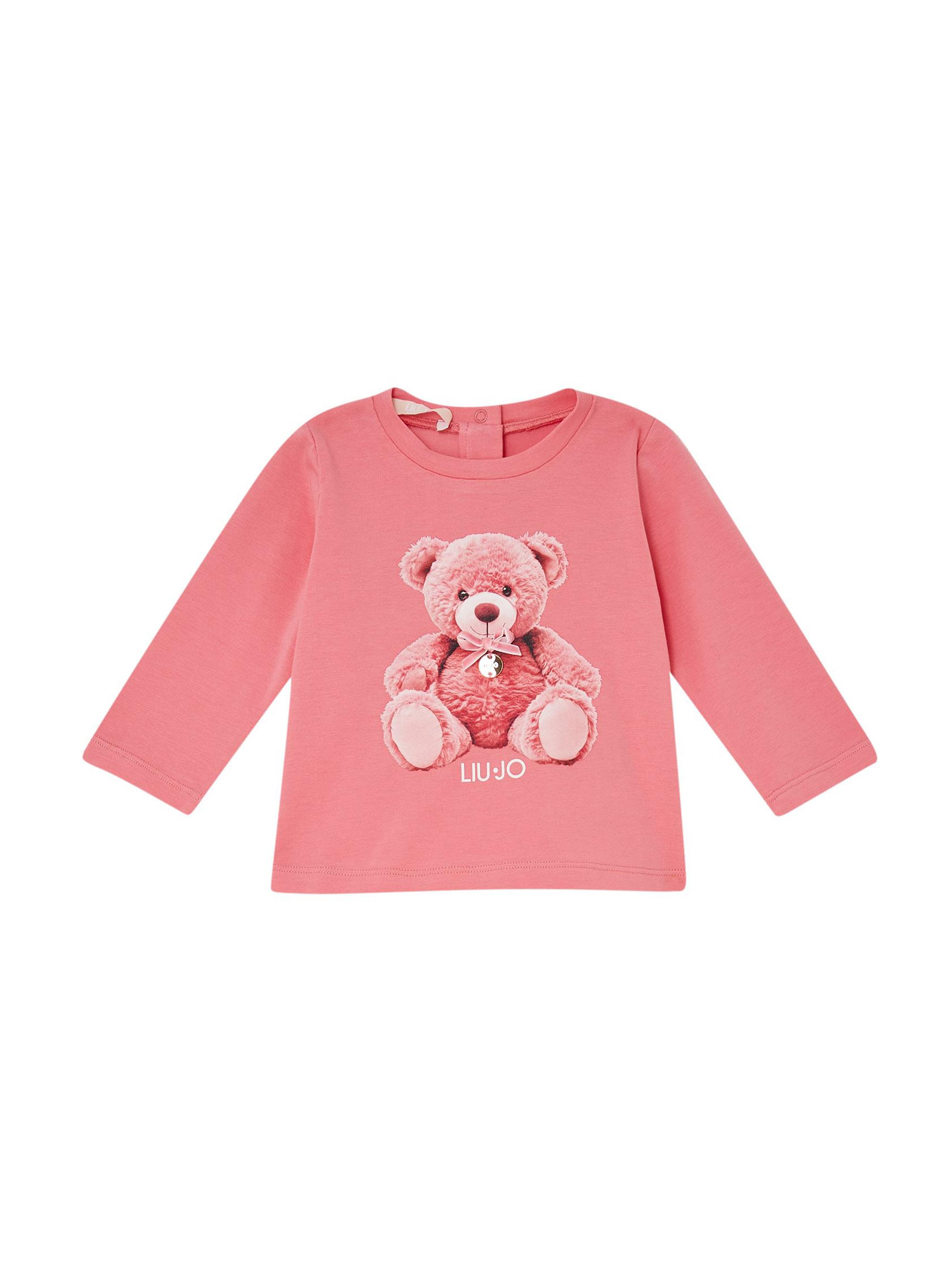 T-shirt in jersey di cotone stretch, a maniche lunghe, con scollo rotondo, a tinta unita, con bottoncini sul retro e maxi stampa grafica con logo e medaglietta con logo metallica sul davanti. Per un look trendy e chic. LIU.JO
