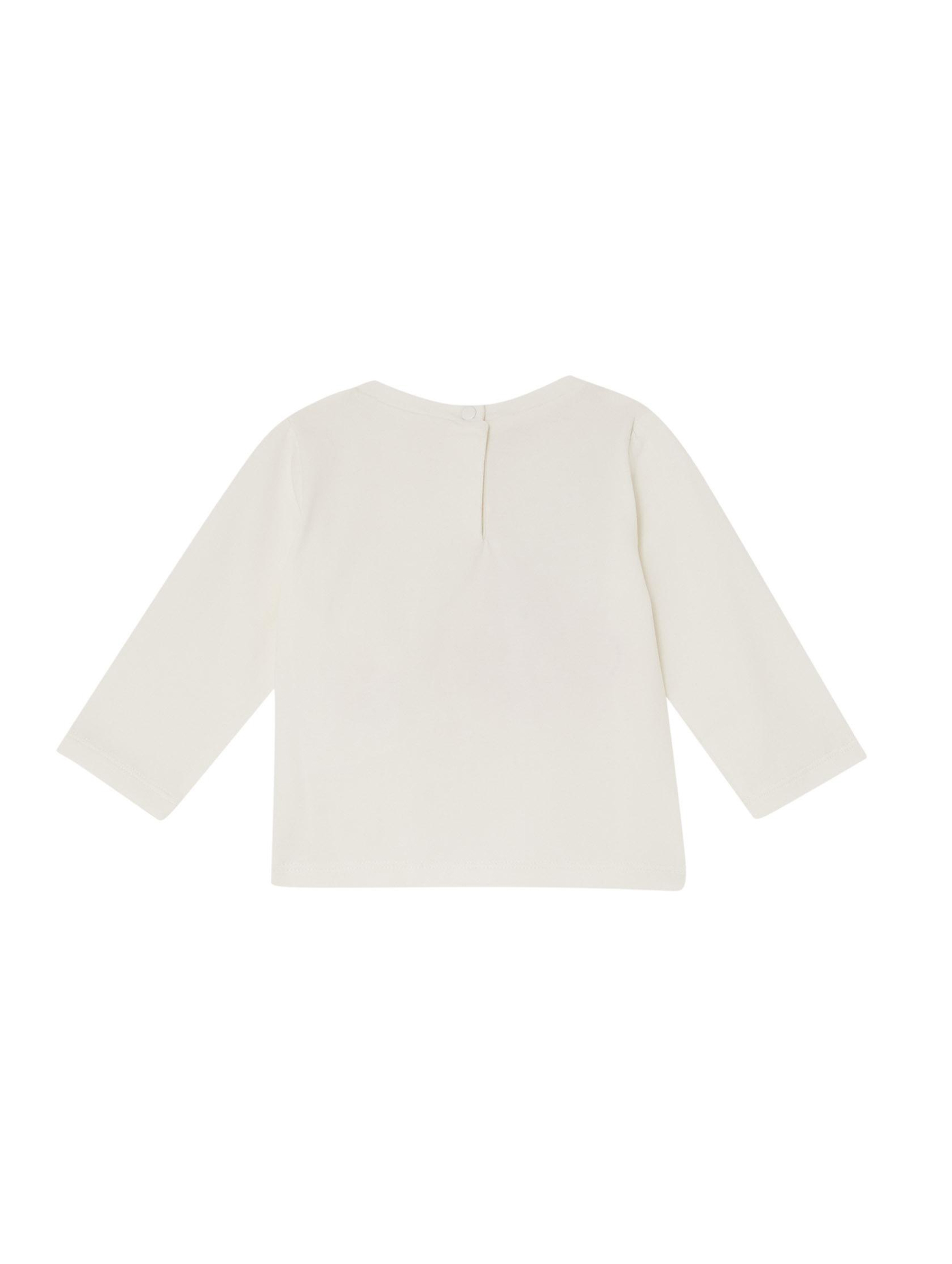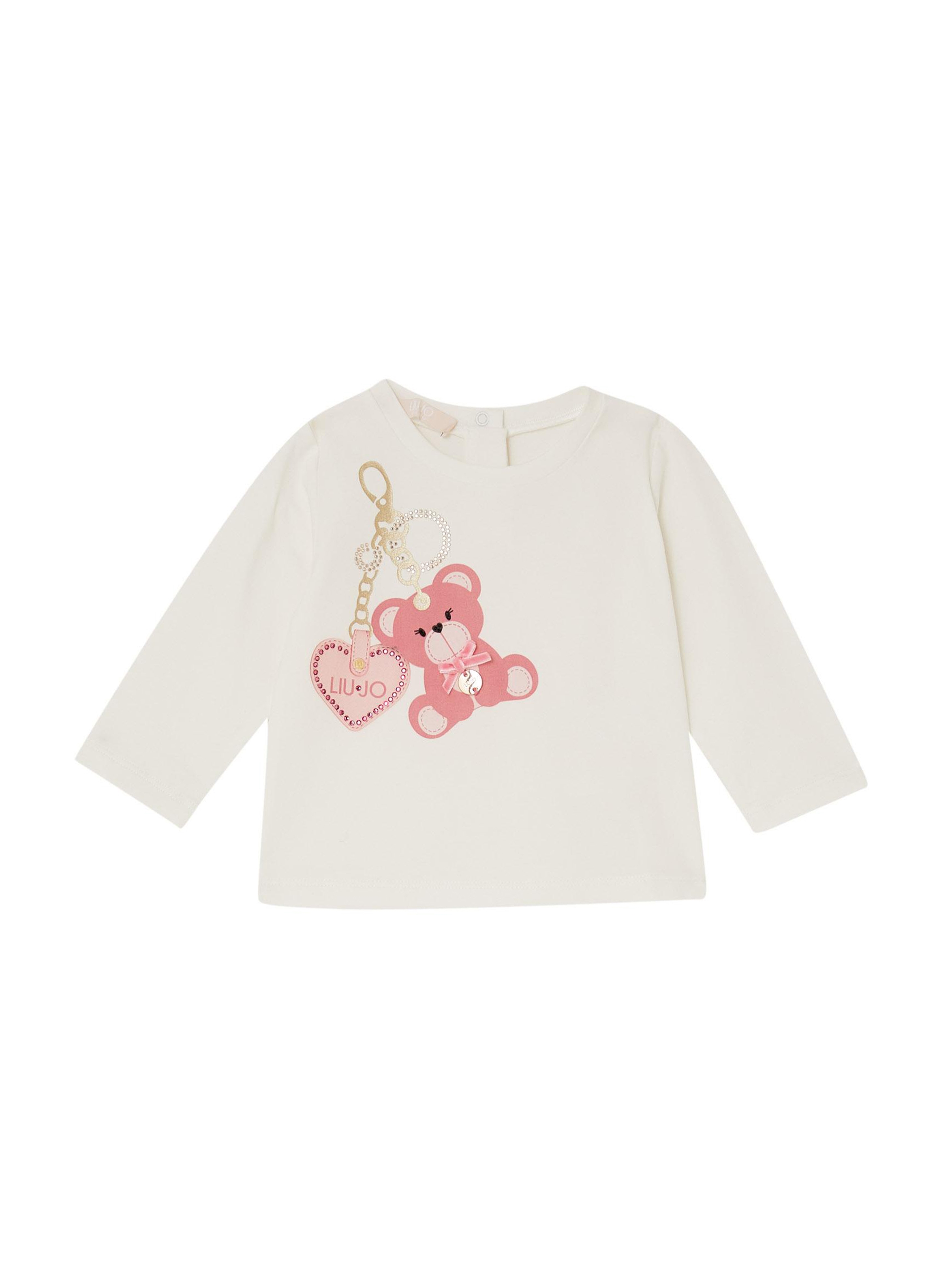 T-shirt in jersey di cotone stretch, a maniche lunghe, con scollo rotondo, a tinta unita, con bottoncini sul retro e stampa grafica con logo e strass sul davanti. Per un look trendy e chic. LIU.JO