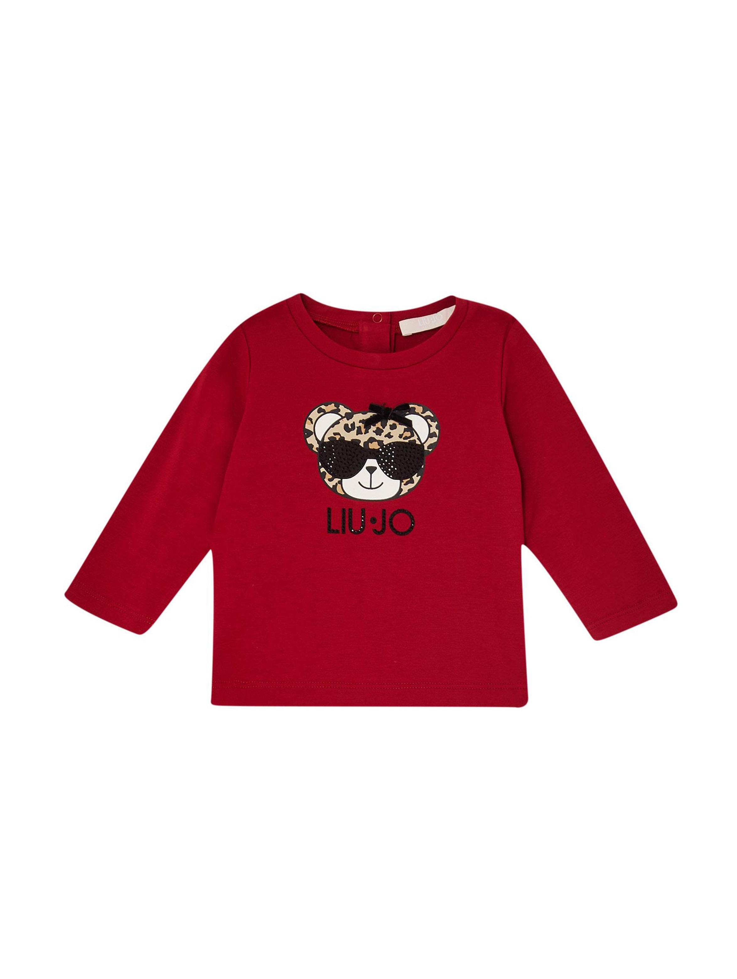 T-shirt in jersey di cotone stretch, a maniche lunghe, con scollo rotondo, a tinta unita, con bottoncini sul retro e stampa grafica con logo e strass sul davanti. Per un look trendy e chic. LIU.JO