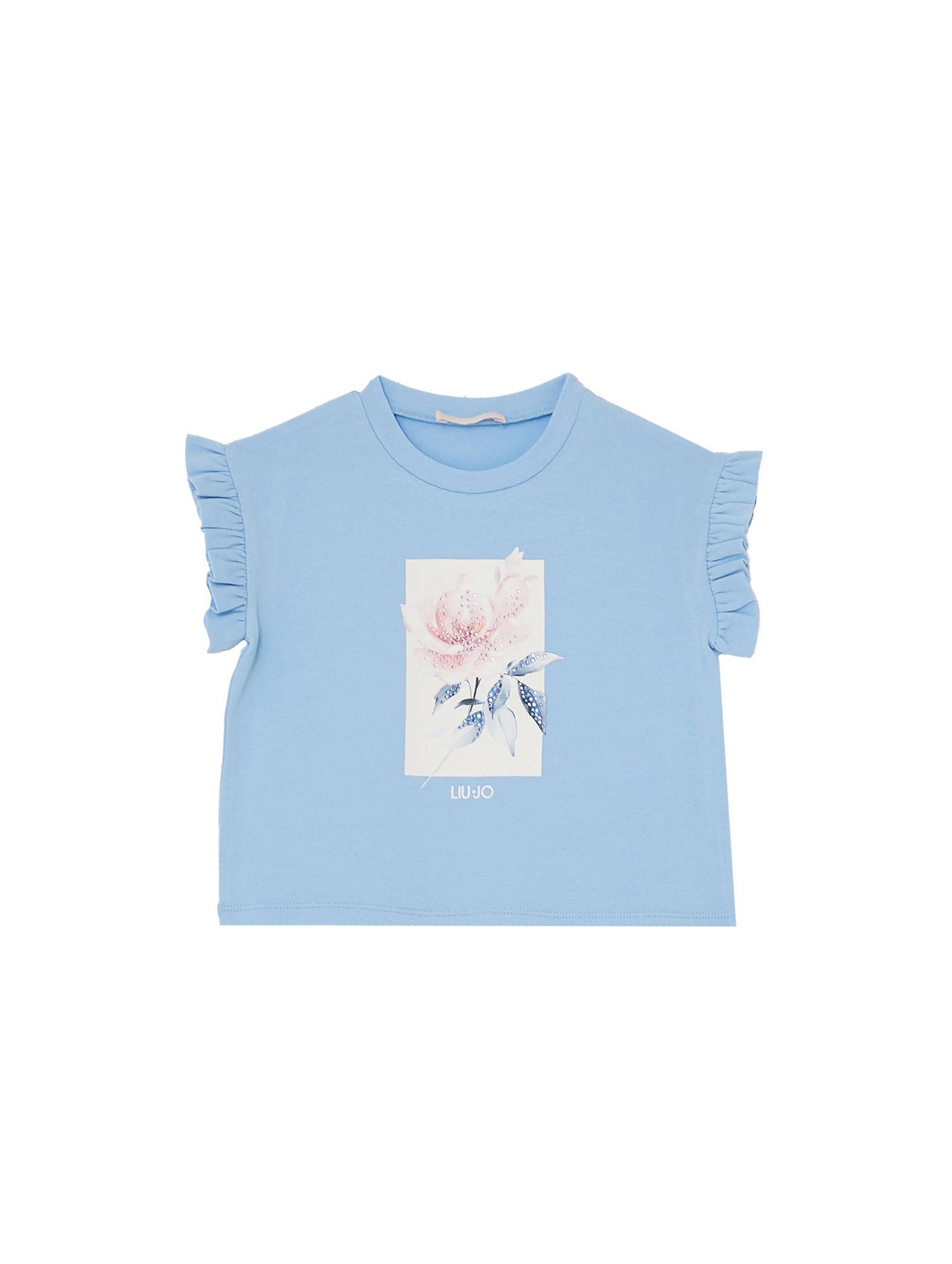 T-shirt a maniche corte, con scollo rotondo, a tinta unita, rouches alle maniche, riquadro con grafica floreale stampata sul davanti, piccolo logo a contrasto e dettagli in strass. Per un look fashion e trendy. LIU.JO