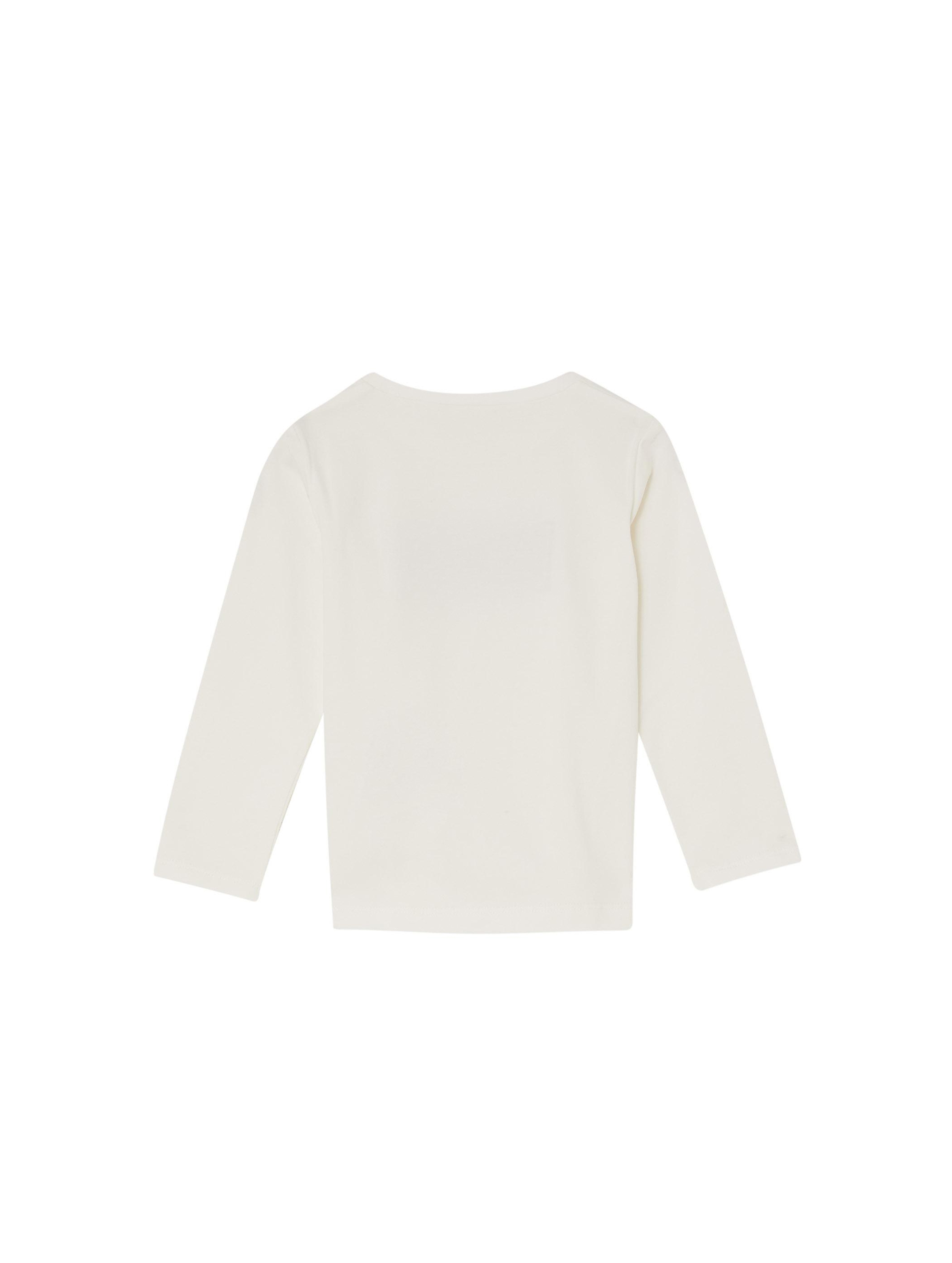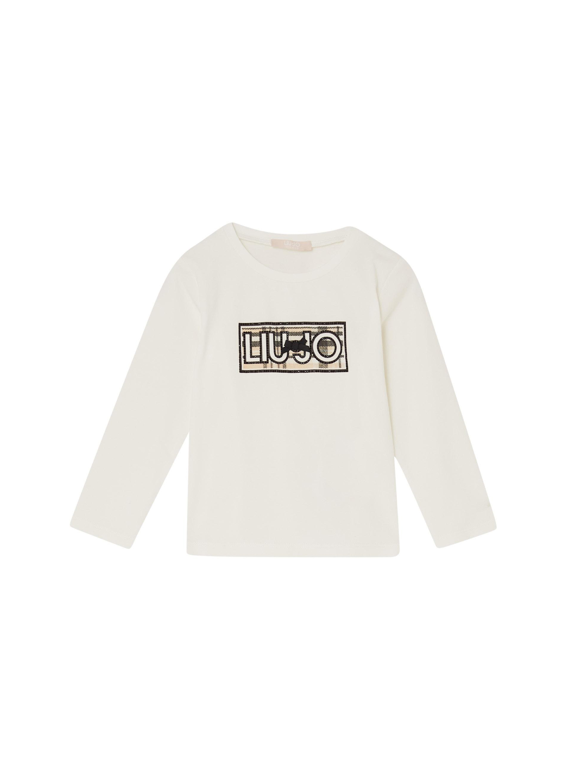 T-shirt in jersey di cotone stretch, a maniche lunghe, con scollo rotondo, a tinta unita, con stampa logo check con strass e fiocchetto sul davanti. Per un look trendy e chic. LIU.JO