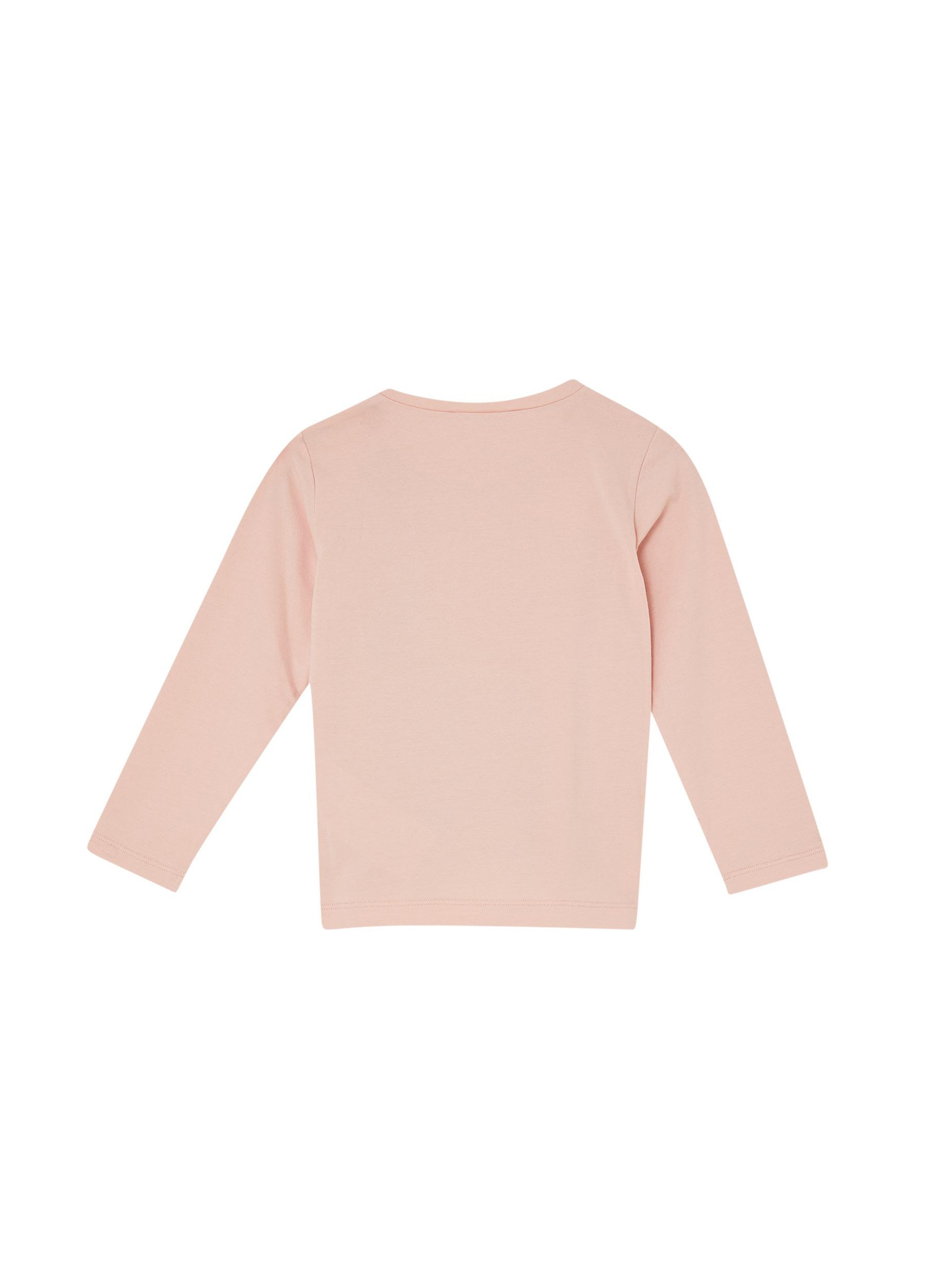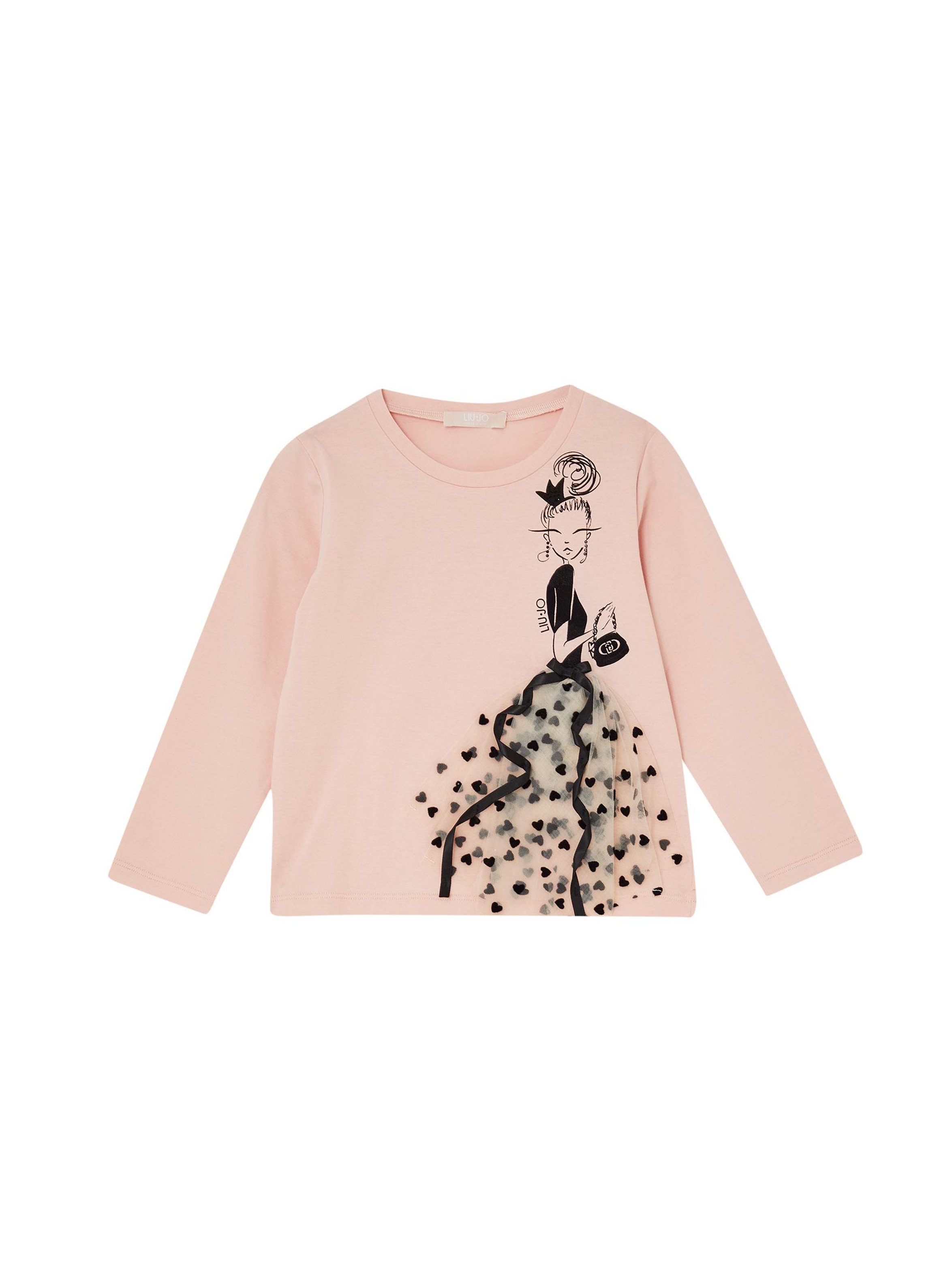 T-shirt in jersey di cotone stretch, a maniche lunghe, tinta unita, con scollo rotondo e maxi stampa grafica con logo e fiocchetto e tulle applicati. Per un look trendy e chic. LIU.JO