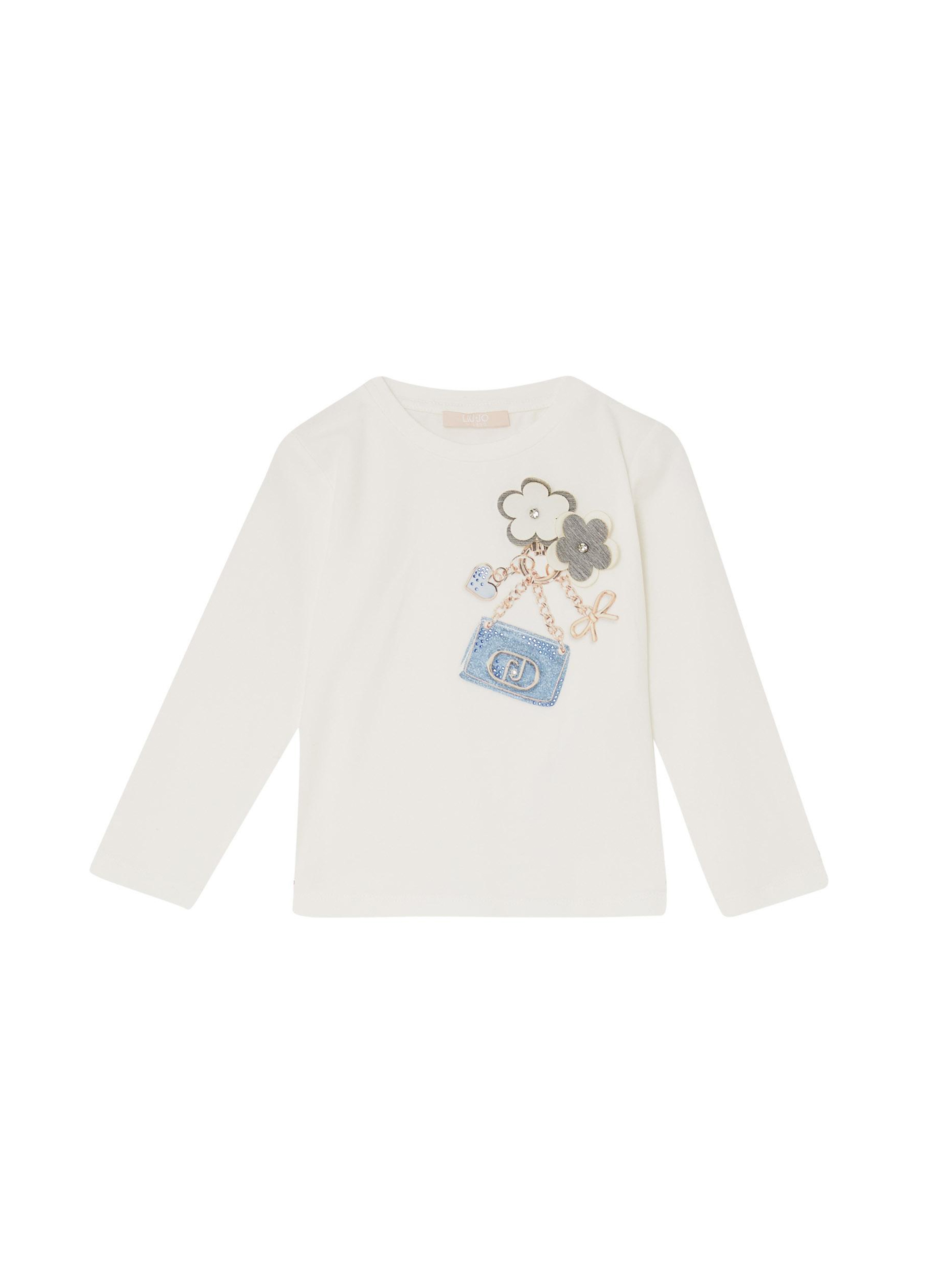 T-shirt in jersey di cotone stretch, a maniche lunghe, con collo rotondo, a tinta unita, con stampa grafica con strass e logo sul davanti. Per un look casual a chic. LIU.JO