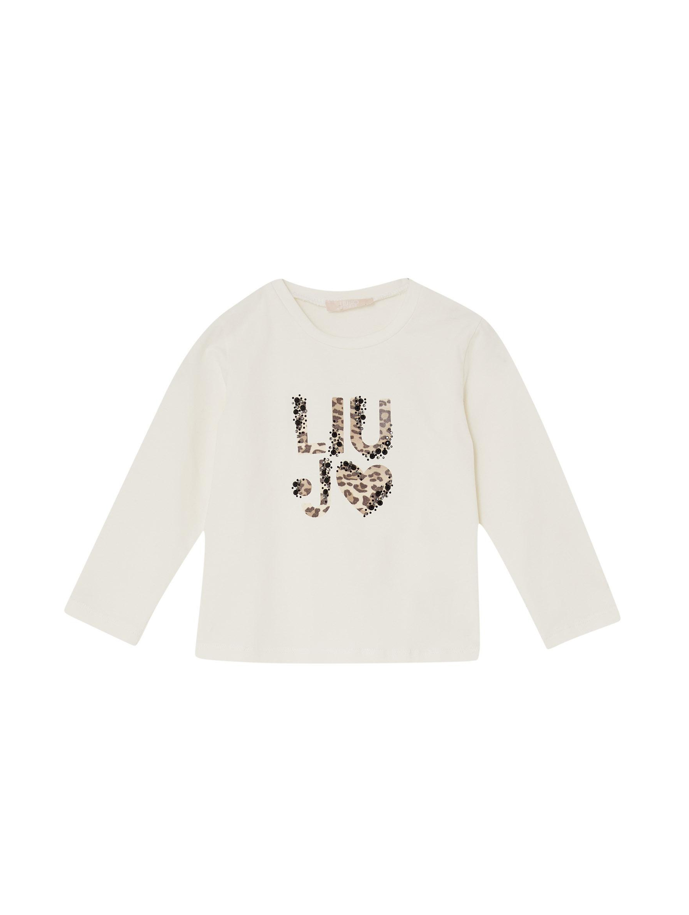 T-shirt in jersey di cotone stretch, a maniche lunghe, tinta unita, con scollo rotondo e stampa logo animalier con strass sul davanti. Per un look trendy e chic. LIU.JO