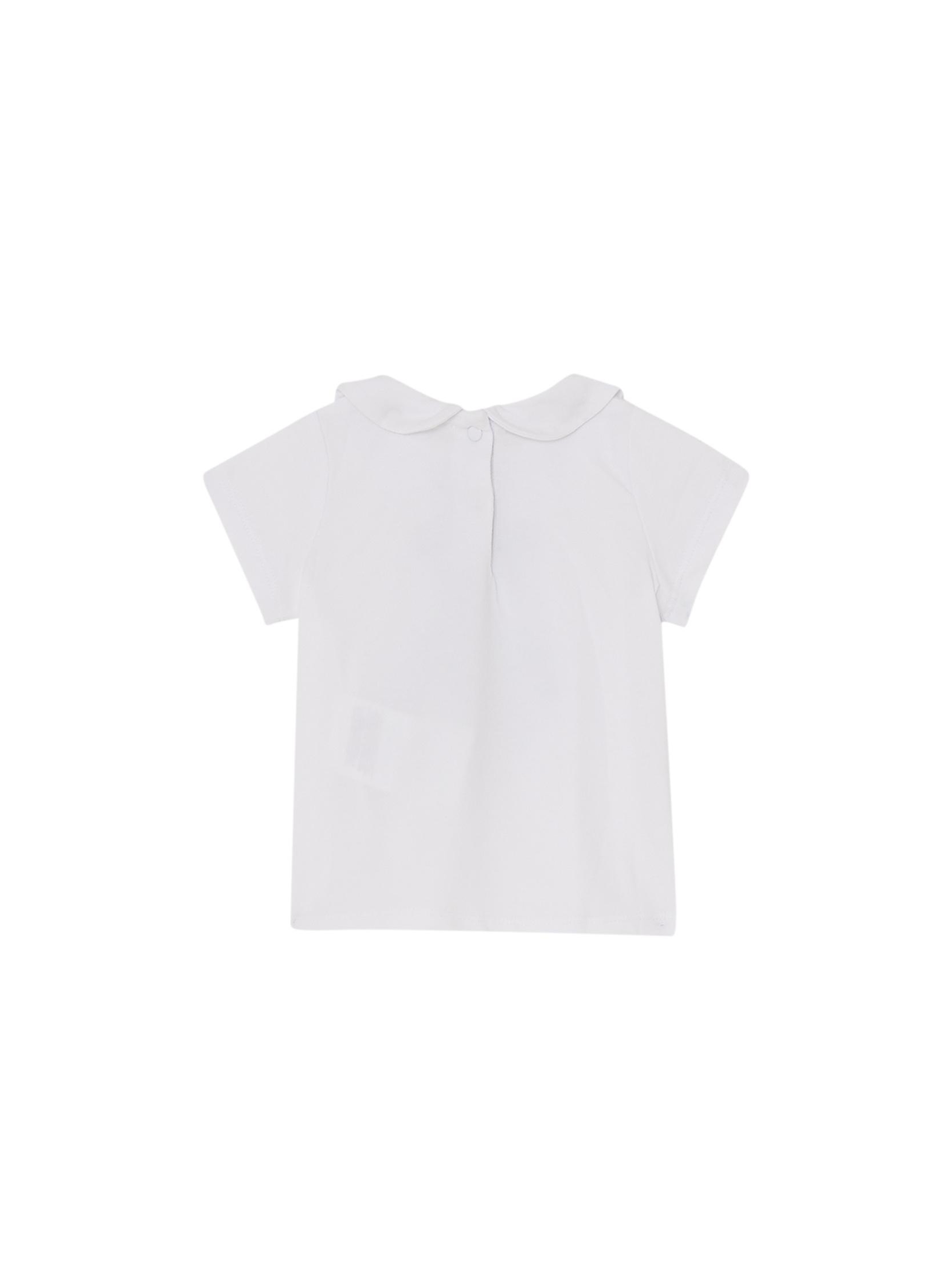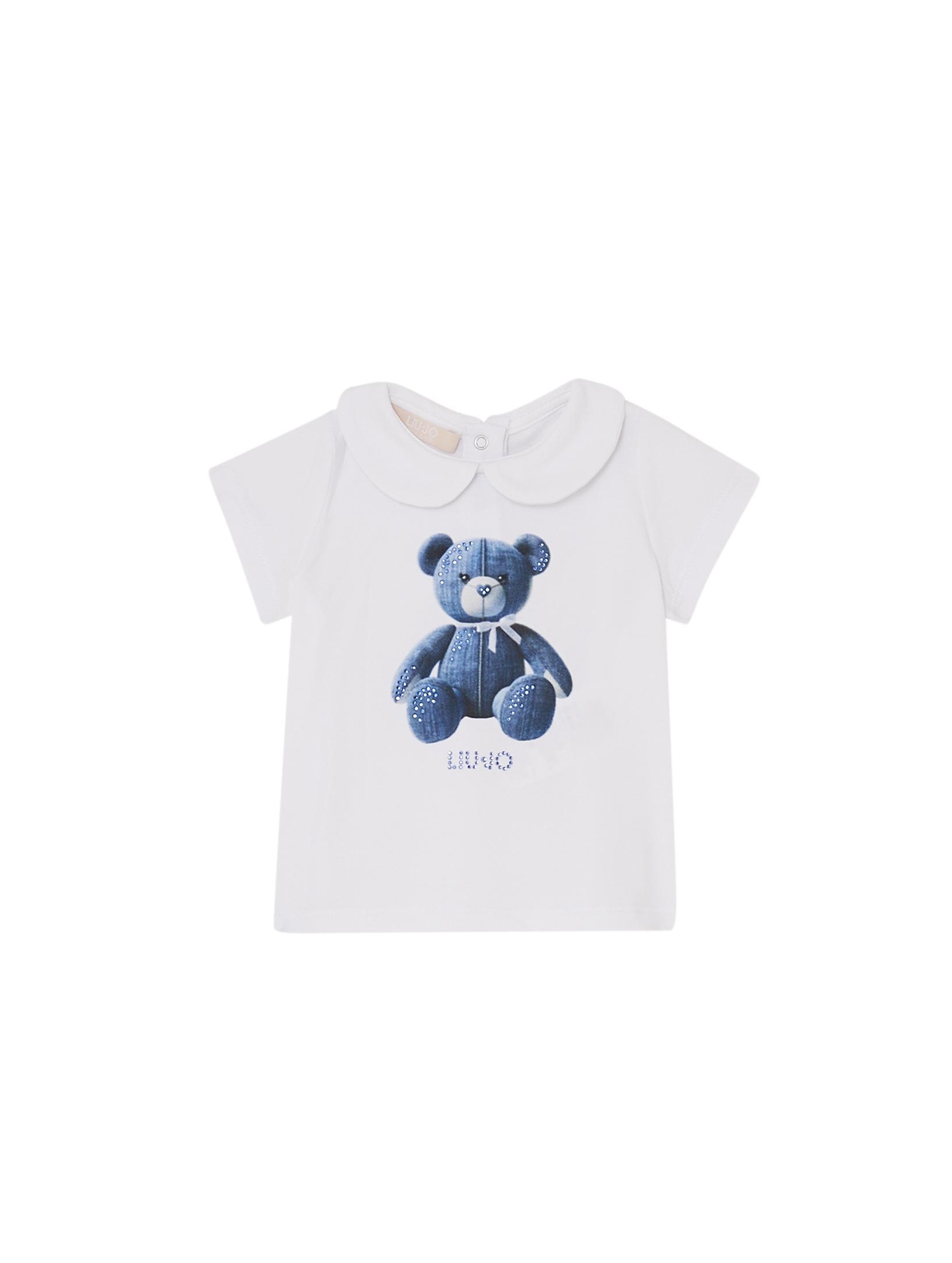 T-shirt a maniche corte, con scollo e colletto rotondo, a tinta unita, con apertura con bottone a pressione sul retro e simpatico orsetto stampato sul davanti con logo e dettagli in strass. Per un look casual e trendy. LIU.JO