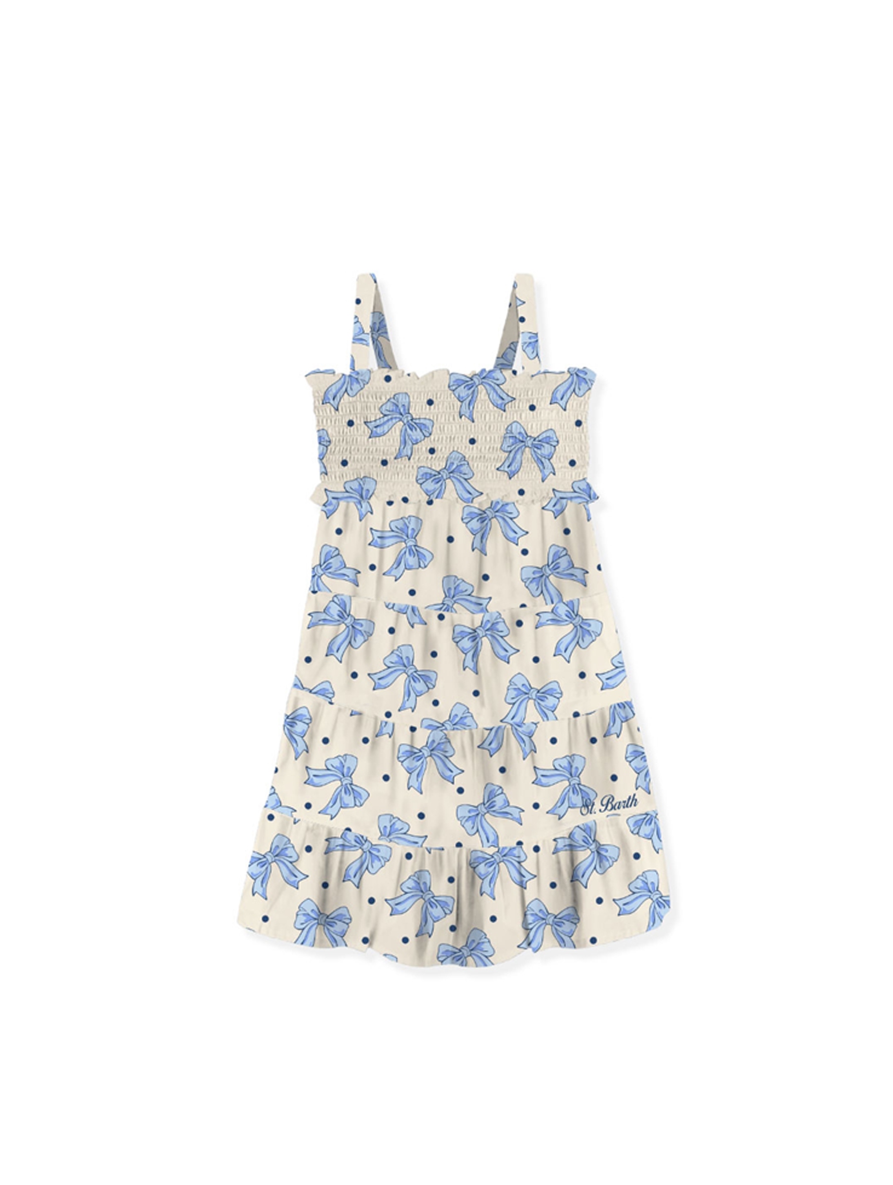 Abito smanicato realizzato in tessuto leggero e fresco, con spalline regolabili, dalla vestibilità regular con gonna svasata, balze, corpetto ricamato a punto smock e graziosa fantasia di pois e fiocchi all over. Per un look fashion e chic. MC2 SAINT BARTH