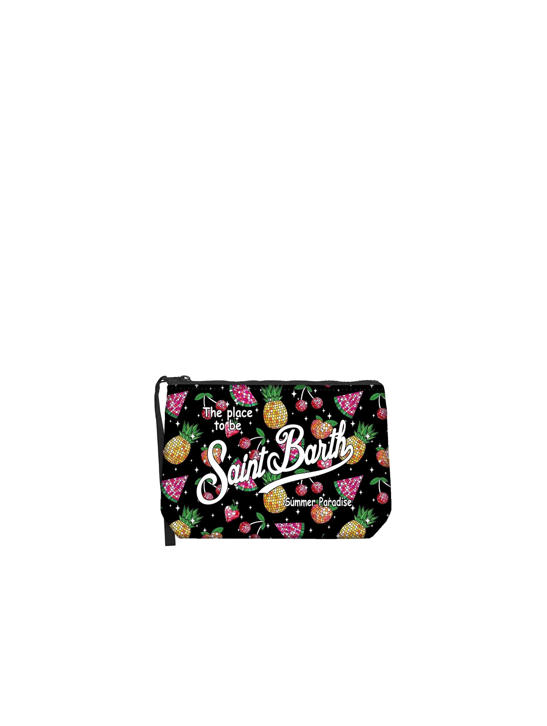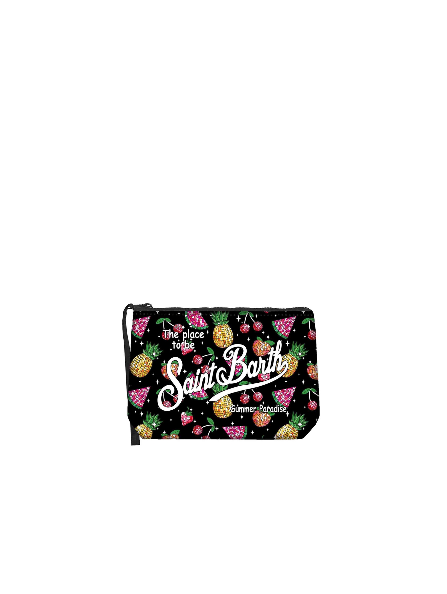 Pochette realizzata in tessuto Scuba, con una simpatica stampa disco fruit multicolor all over che dona un tocco di vivicità, con chiusura con zip, manicotto laterale in gros grain e maxi logo stampato a contrasto. Versatile e dal design contemporaneo MC2 SAINT BARTH