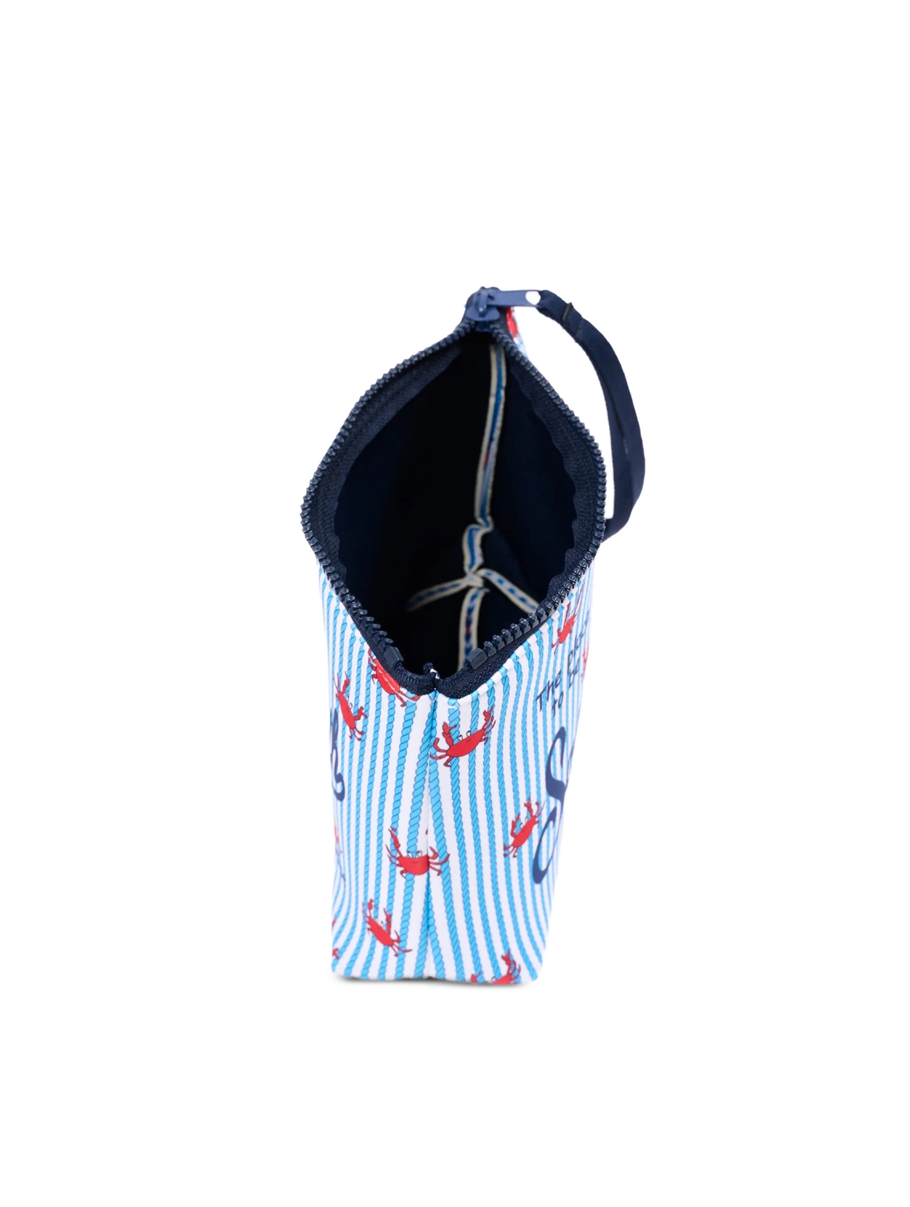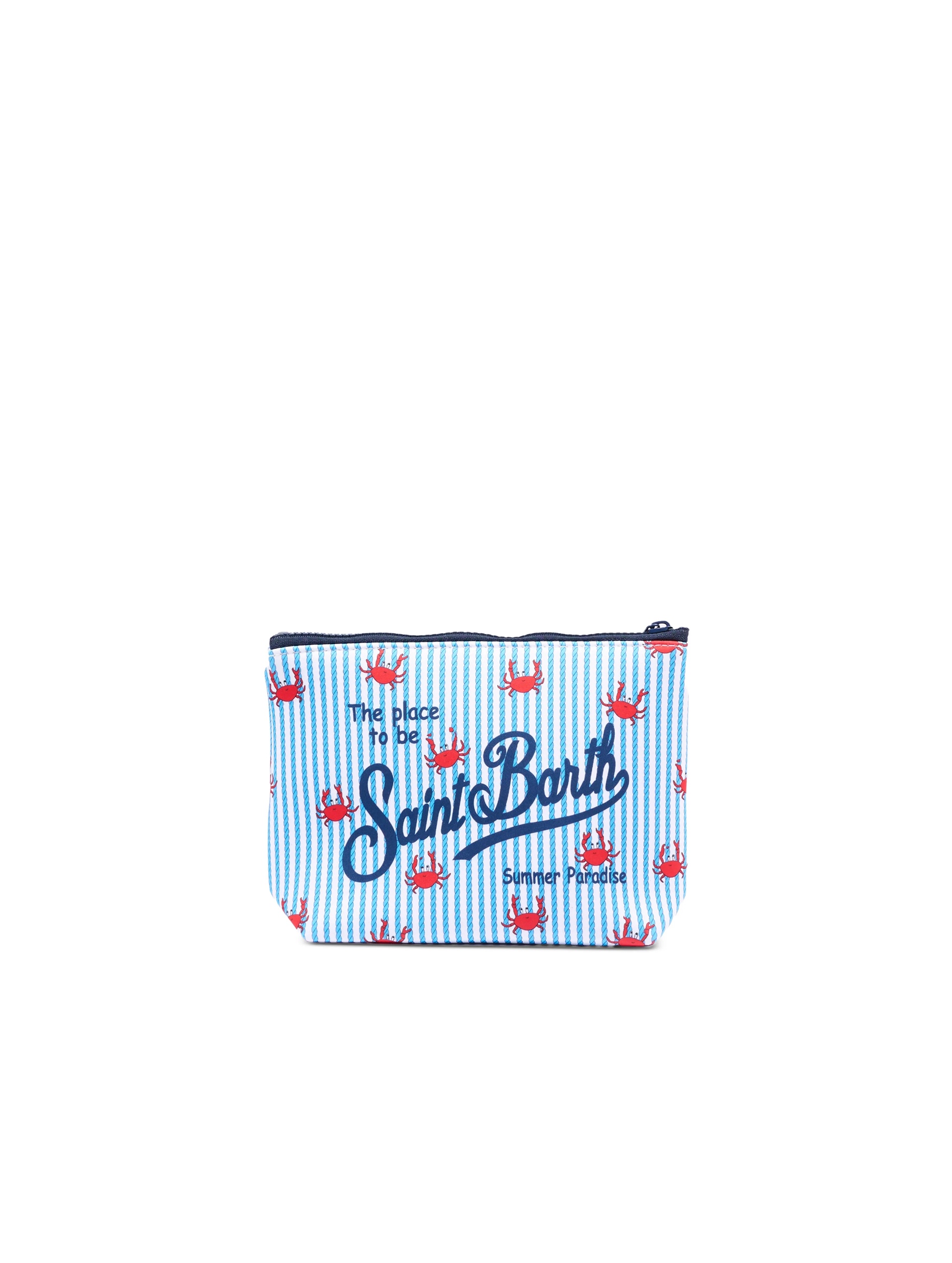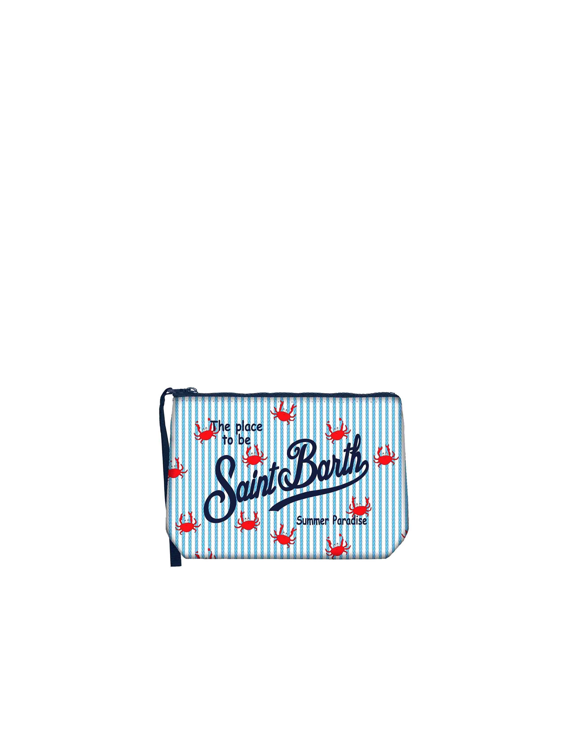 Pochette realizzata in tessuto Scuba, con una simpatica stampa a righe con granchi rossi all over che dona un tocco di vivacità, con chiusura con zip, manicotto laterale in gros grain e maxi logo stampato a contrasto. Versatile e dal design contemporaneo MC2 SAINT BARTH