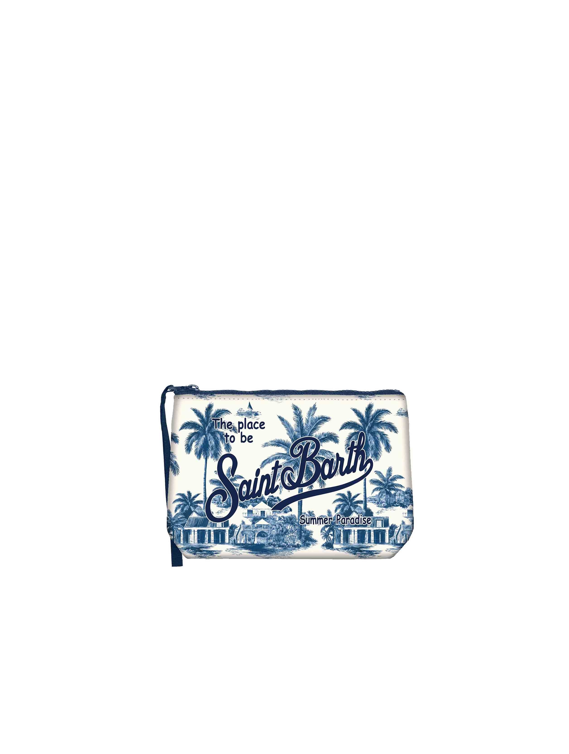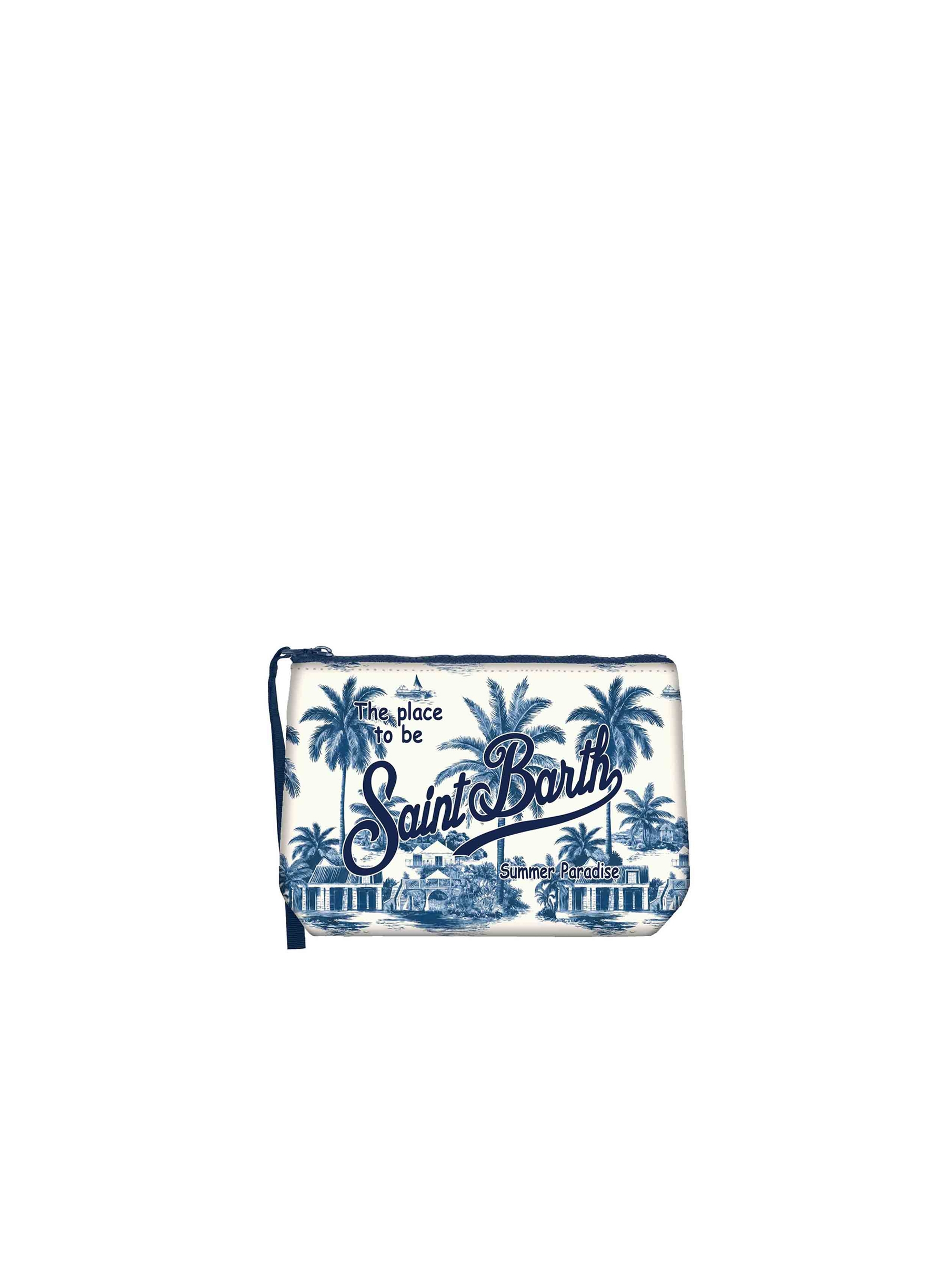 Pochette realizzata in tessuto Scuba, con una raffinata stampa Toile de Jouy che dona un tocco glam, con chiusura con zip, manicotto laterale in gros grain e maxi logo stampato a contrasto. Versatile e dal design contemporaneo MC2 SAINT BARTH