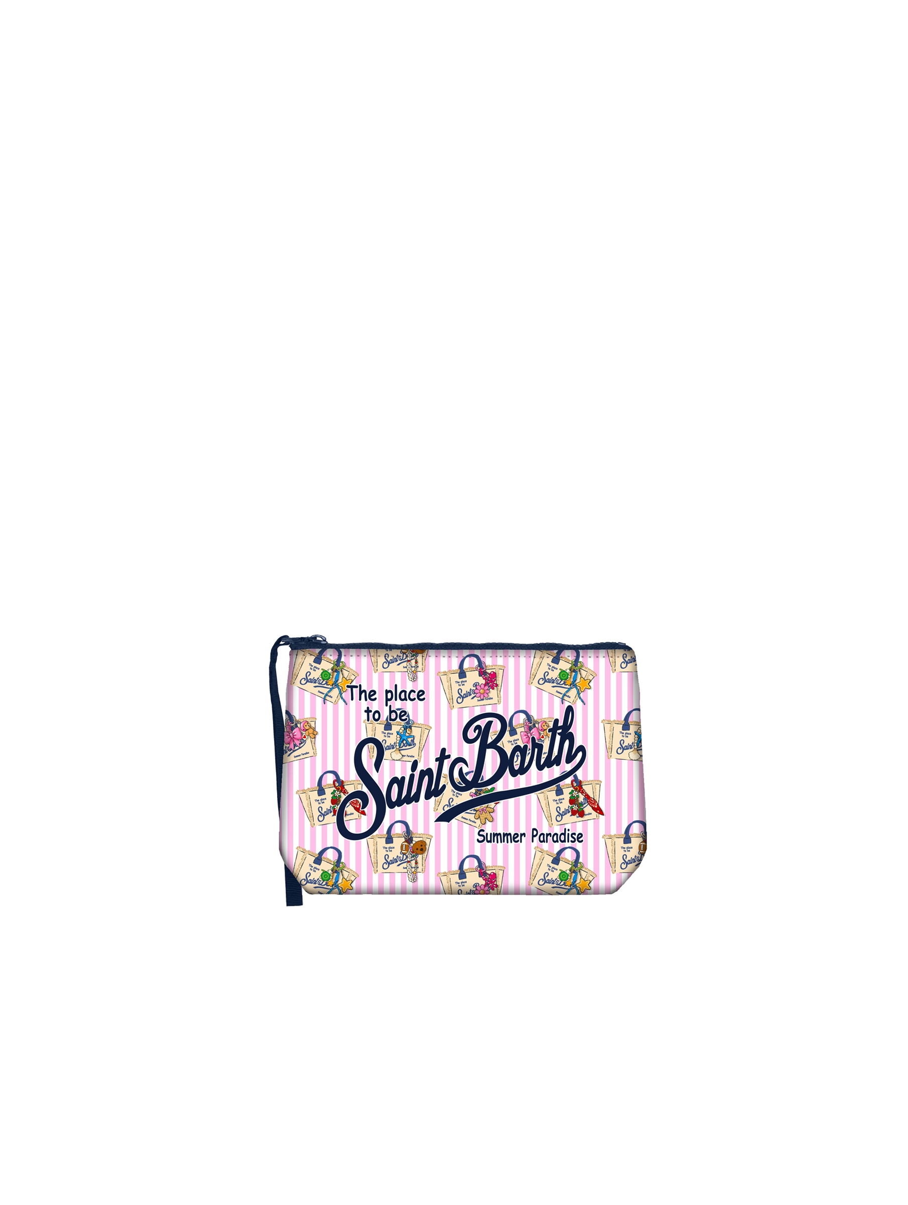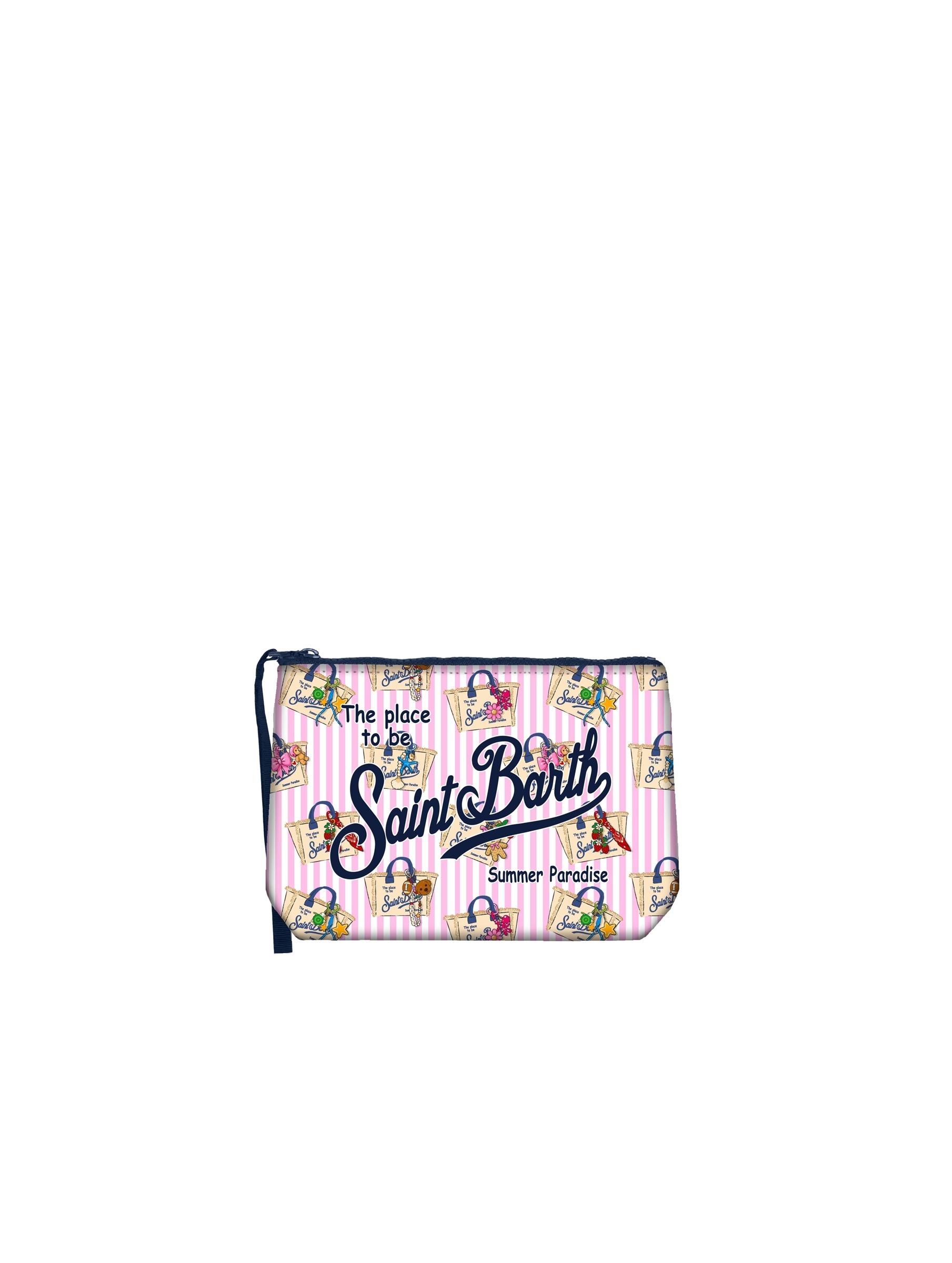 Pochette realizzata in tessuto Scuba, con una simpatica stampa a righe con St. Barth Bag all over che dona un tocco di vivicità, con chiusura con zip, manicotto laterale in gros grain e maxi logo stampato a contrasto. Versatile e dal design contemporaneo MC2 SAINT BARTH