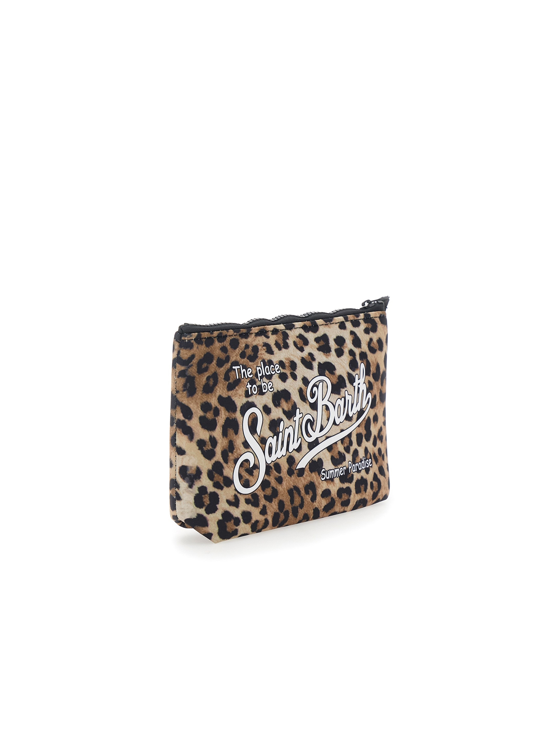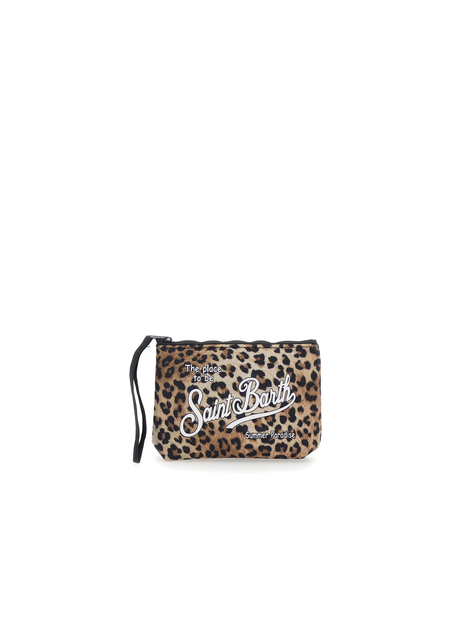 Pochette realizzata in tessuto Scuba, con un'audace stampa leopardata all over che dona un tocco glam, con chiusura con zip, manicotto laterale in gros grain e maxi logo stampato a contrasto. Versatile e dal design contemporaneo MC2 SAINT BARTH